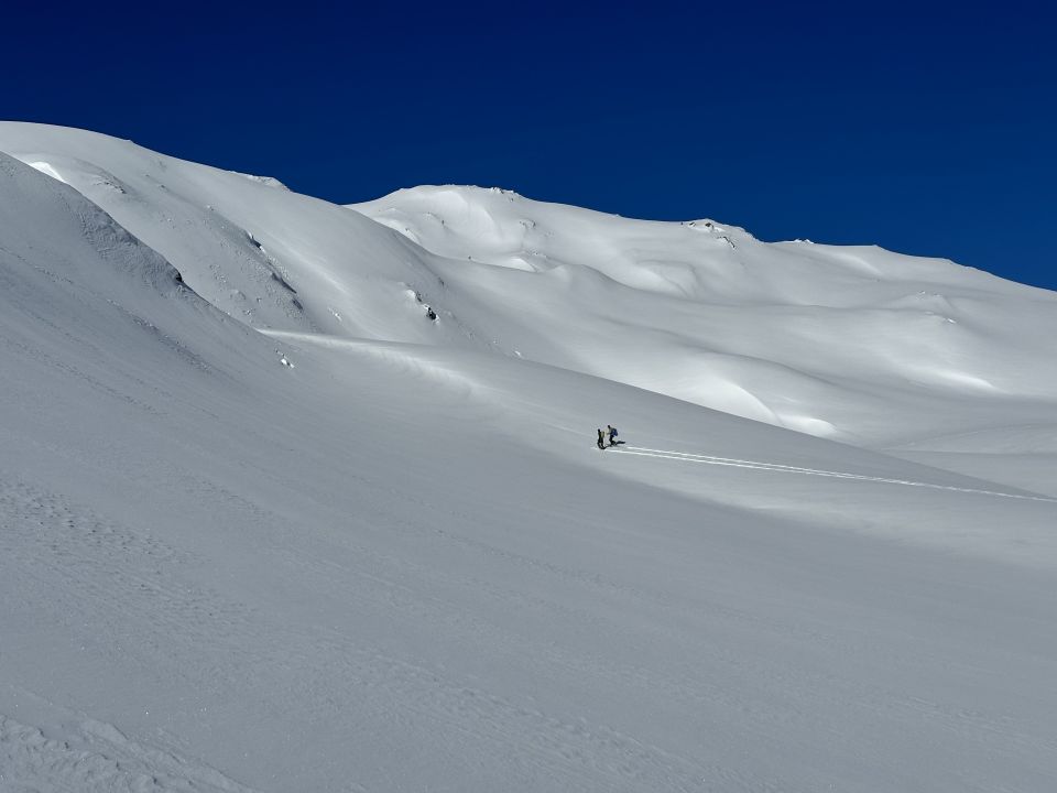 Der Pazolastock hätte heute ein ausgezeichnet bekommen, hätte nicht der doch heftige Wind die Aufenthaltsqualität jedenfalls auf dem Gipfel arg strapaziert. Strahlend blauer Himmel und eine fluffige Pulverauflage auf hartem Untergrund. Erstaunlich wenig los, ich war zu meiner Überraschung alleine oben, eine Handvoll auf dem Weg.