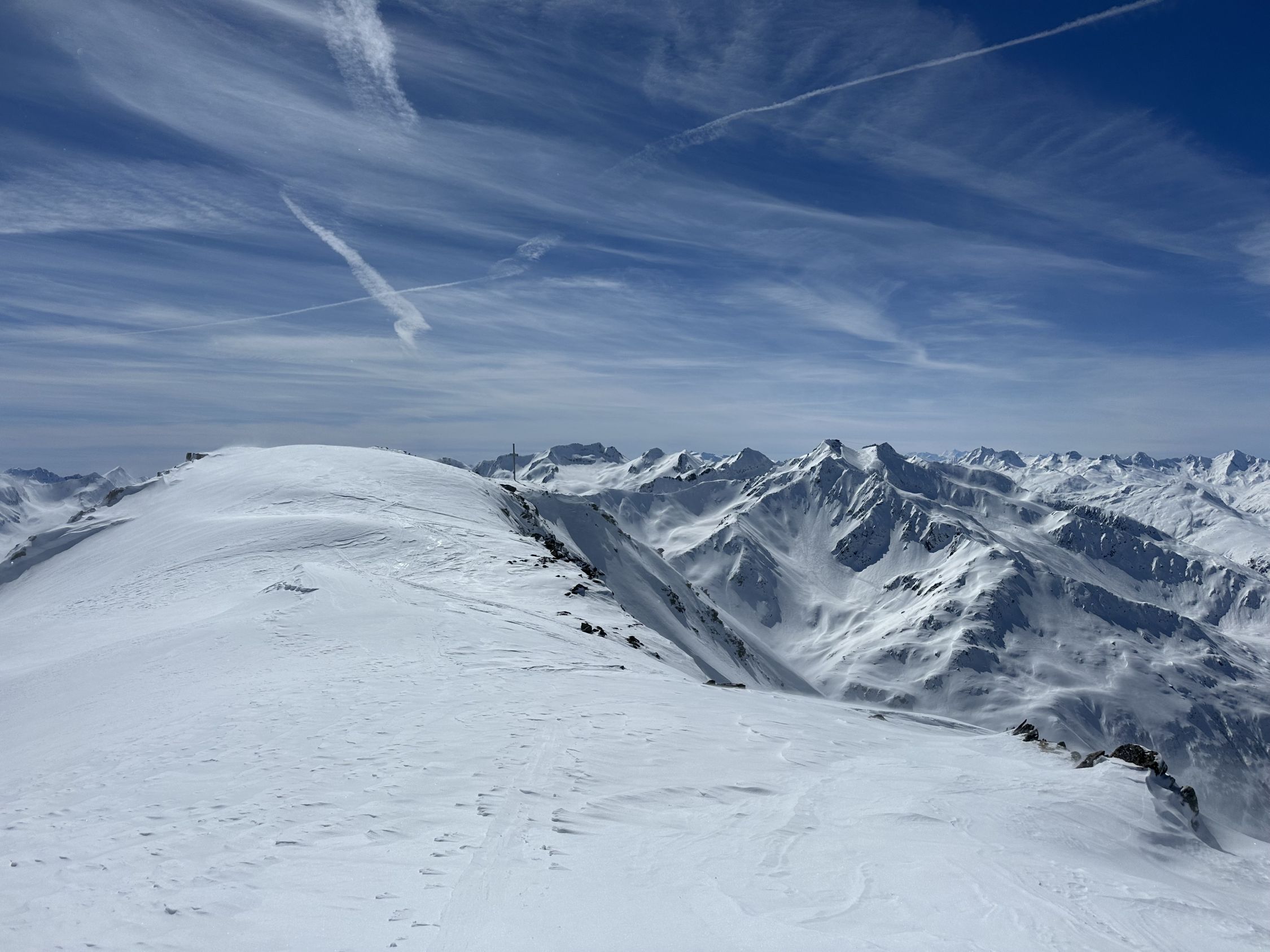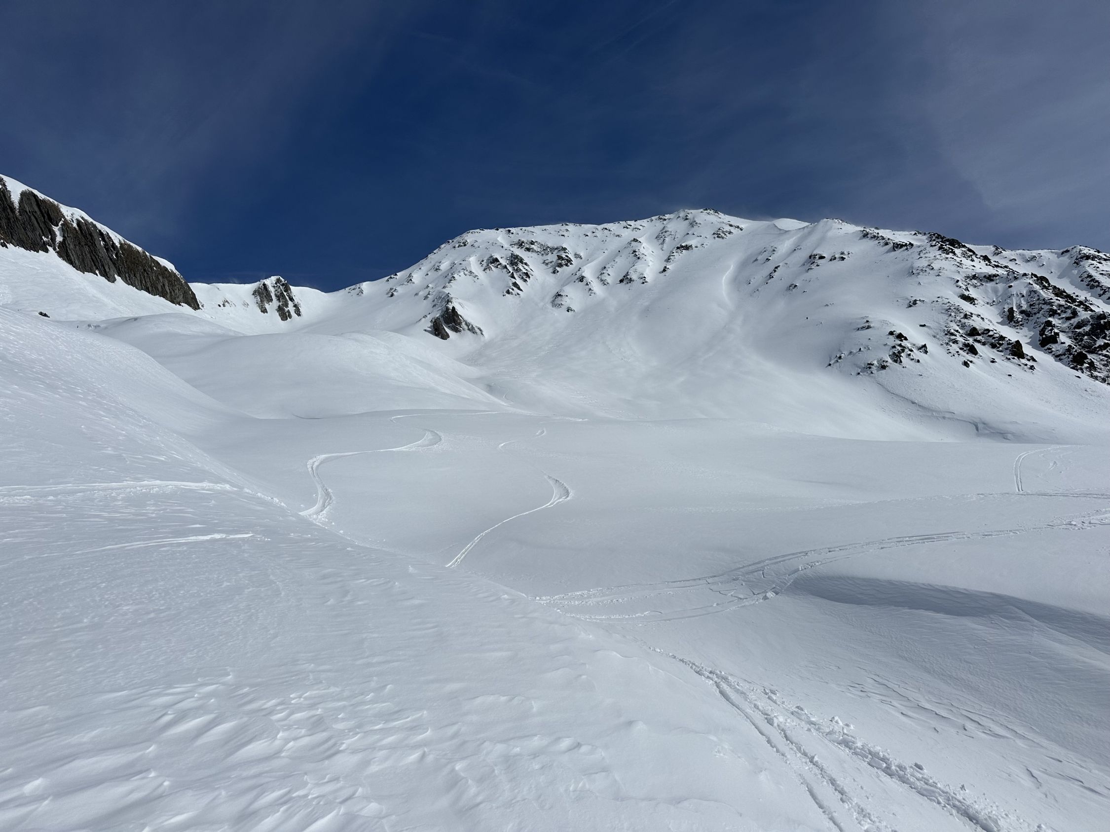 Der Rossbodenstock im Anschluss an den Pazola ist eine schöne Kombi, auch wenn der Übergang zumindest an einer Stelle (nach der Martschallücke) etwas hakelig ist (ich habe die Ski kurz abgenommen). An den schönen Verhältnissen heute hat nur der kräftige Wind etwas für Abstriche gesorgt. Den wunderschönen Pulver im Aufstieg zum Pazolastock gab es bei der Abfahrt nicht, der Wind hatte schon einiges verfrachtet. Am Gipfelhang deshalb bockelhart, weiter unten dann aber mit ein bisschen Triebschnee richtig richtig schön zu fahren. Abfahrt bis nach Andermatt Bahnhof auf der Passstraße sehr kommod (ich bin bei Schöni 1888 m oberhalb Nätschen zur Straße gequert, man hätte aber auch noch weiter im Gelände abfahren können) - was will man mehr!
