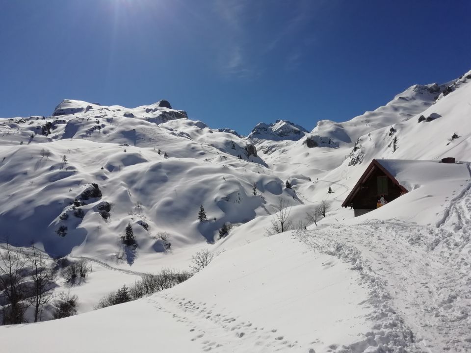 Habe noch den Hagelstock angehängt, mit Abfahrt über Rofenbalm. Das geht z. Zt. bis Ängi, 1300m. Etwas abenteuerliche Abfahrt, im Kontrast zum Rosstock keine Spuren, ganz alleine, man muss gut navigieren im unübersichtlichen Gelände durch die Abbrüche, Steilrinnen, steilen Hänge. Hat die Sache abgerundet.