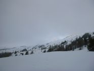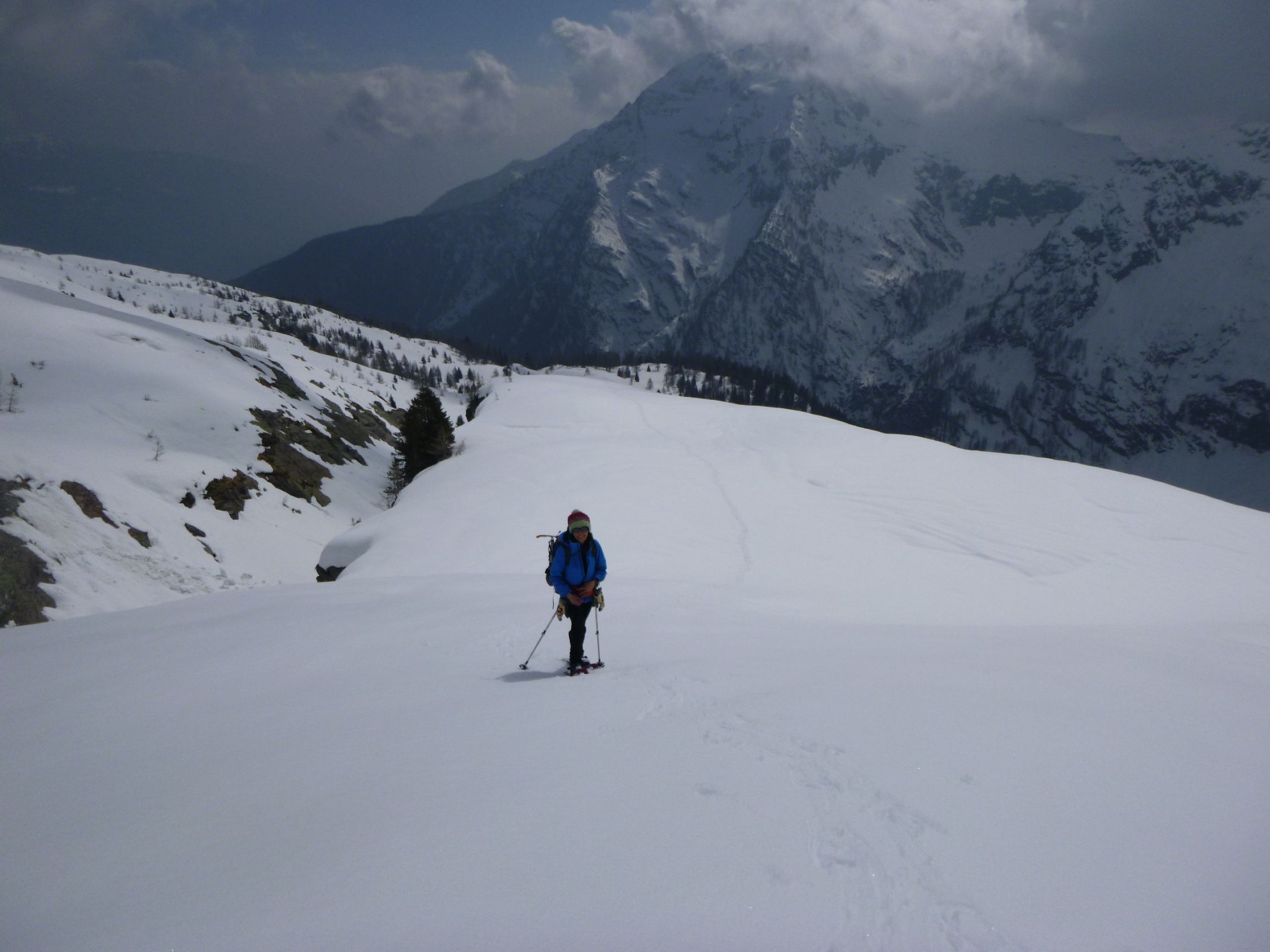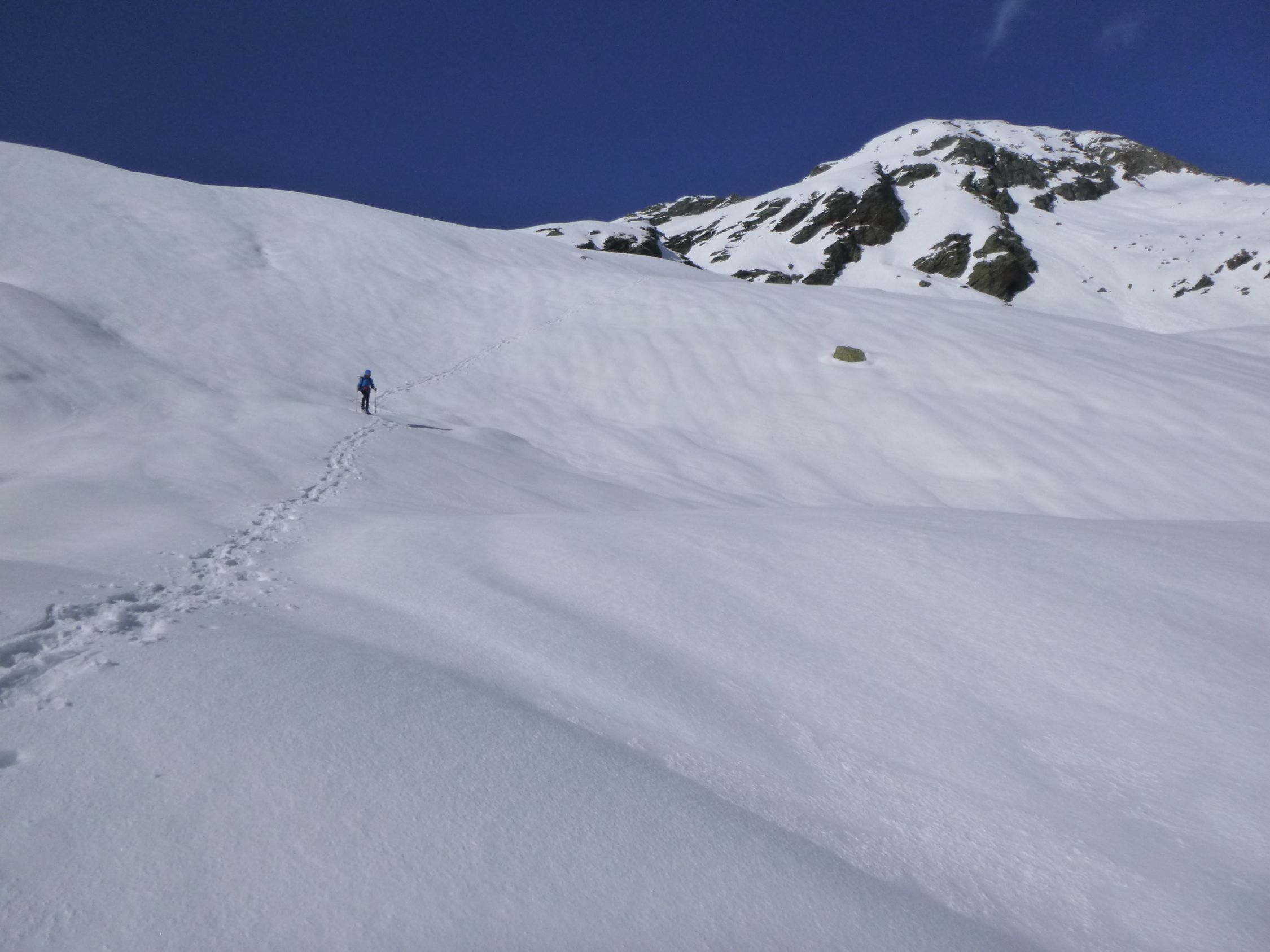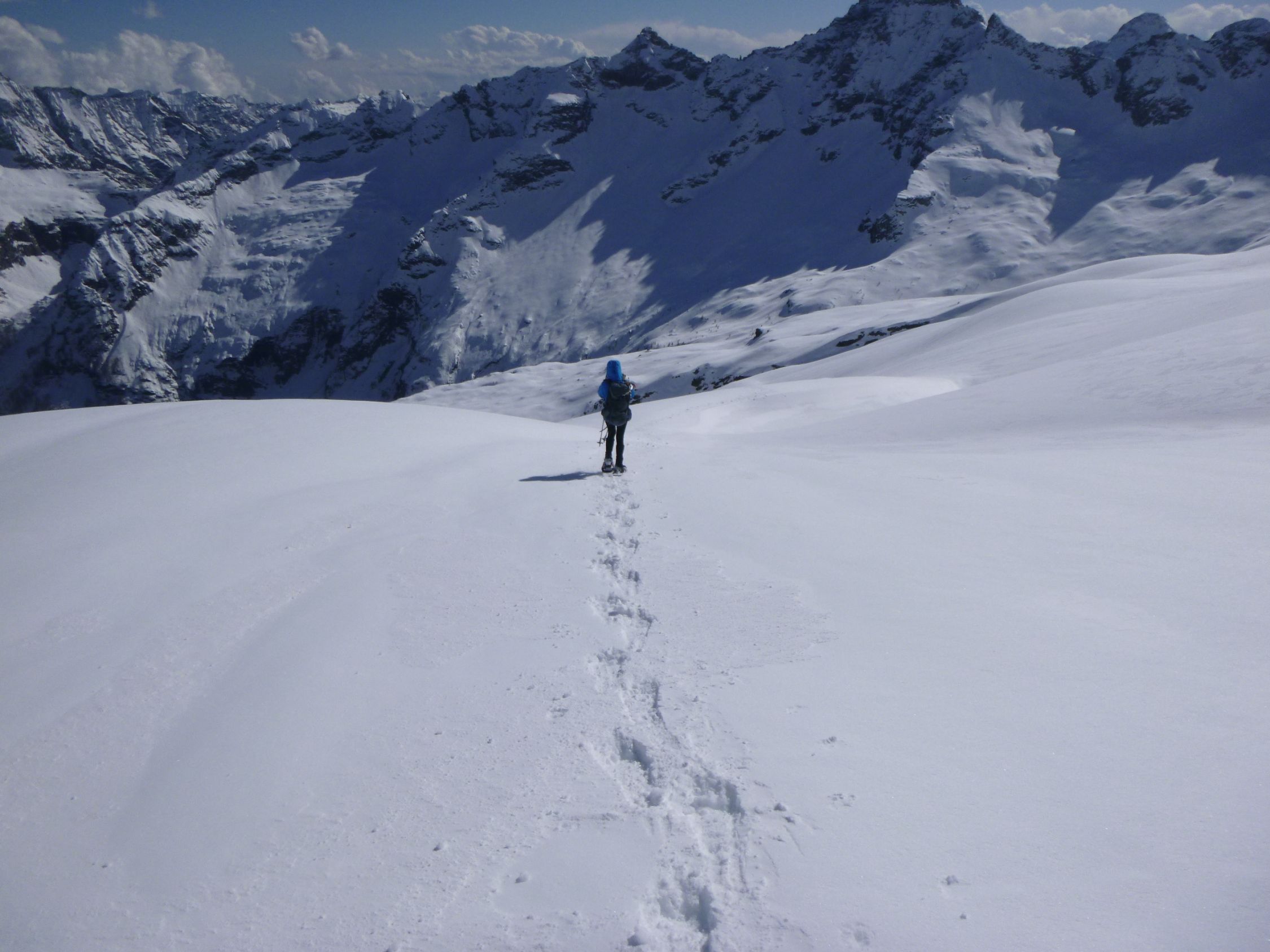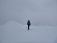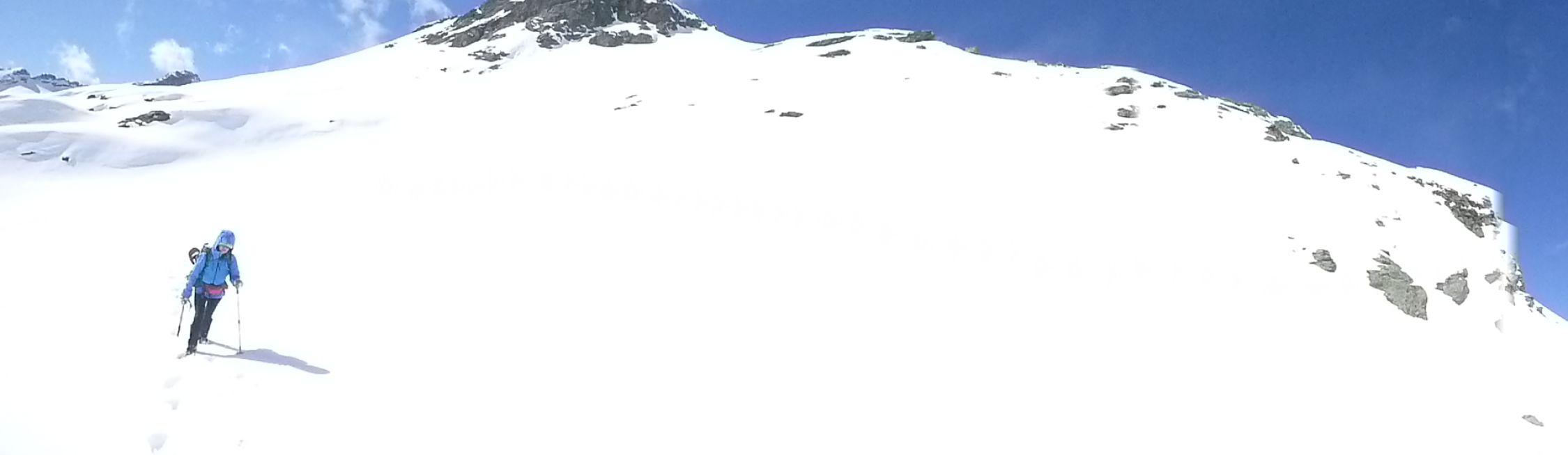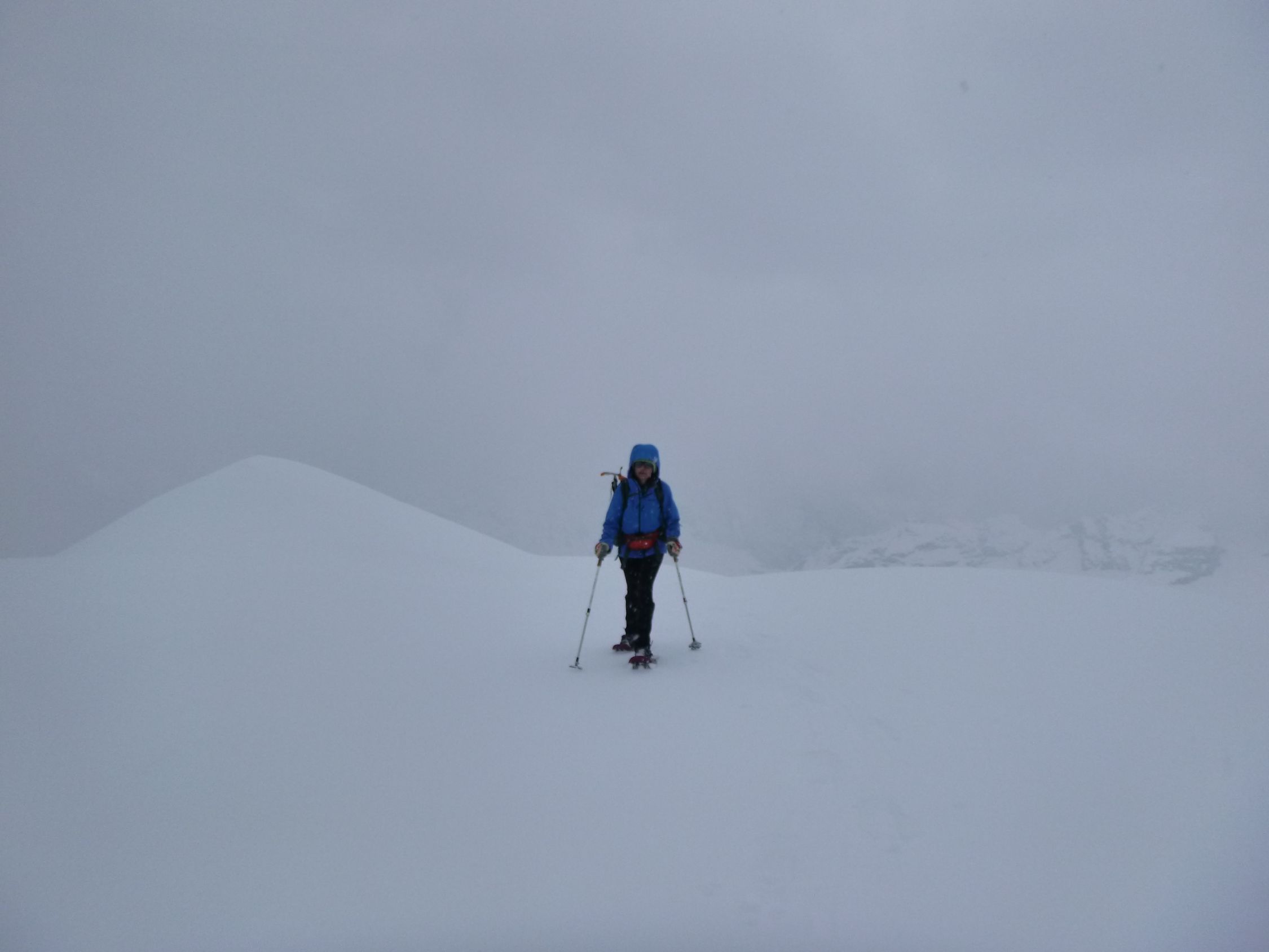 Tourenbeginn um 03:15 Uhr bei 4°C unter Vollmond und mit Stirnlampe. Ab Calle die Schneeschuhe angeschnallt. Nur noch Reste einer Skispur von vor 5 Tagen danach an manchen Stellen erkennbar. Wir orientierten uns nach der Sommerroute durch den Wald. Der Schnee war wegen den Temperaturen in letzter Zeit nicht gefroren, wir sanken jedoch nicht tief ein mit den Schneeschuhen. Nur sind immer wieder mal kurze Stellen im Wald schneefrei bis P 1537. Am Vormittag zogen dann ungemütliche Nebel- und Grieselschnee-Wolken auf. Zeitweise mit geringem Schneefall. Ebenso nahmen Windböen zu. Ab Rif. Sponda spurten wir dann am Vormittag hinauf in Richtung Gletscherpass über die Sommerroute SAC-Nr. 1236. Die SW-Flanke ab ca. 2600 m war jedoch aufgrund der Wärmestrahlung etwas angefirnt, so dass die Schneeschuhe nicht mehr hielten. Etwas akrobatisch wechselten wir dann in unterer Flanke auf Steigeisen um. Die Lichtverhältnisse waren diffus, der Wind wurde stärker und es begann Grieselschauer, so dass wir uns entschieden, rechts und etwas oberhalb vom Pass zum anfänglichen Grat aufzusteigen, um zurück zum Passo di Ghiacciaone dann nicht ganz so steil absteigen zu müssen. Wir trauten der Wetterprognose nicht. Im Abstieg kam dann allerdings tatsächlich die Sonne durch und es gab Sicht. Falsche Entscheidung ?
