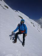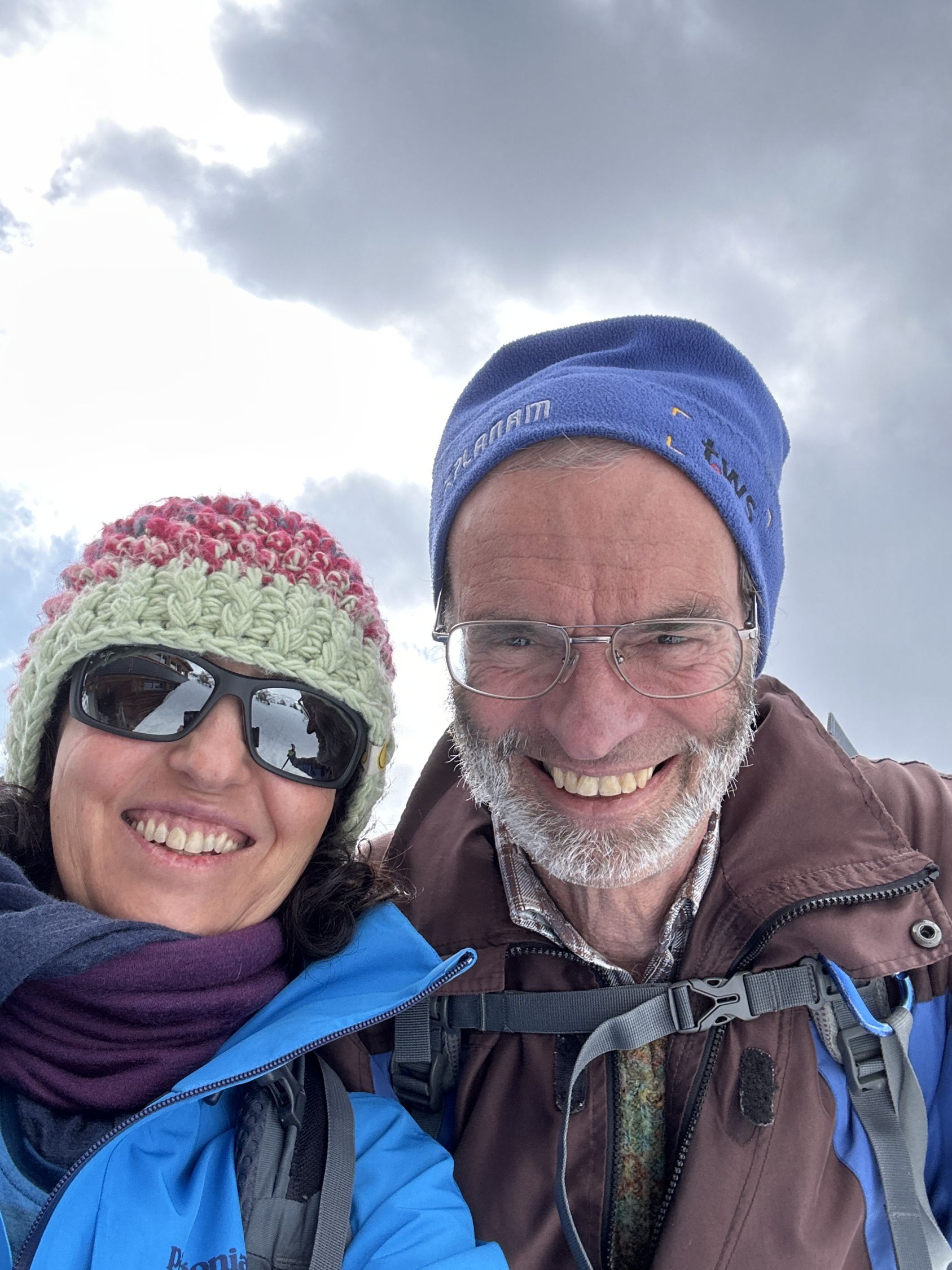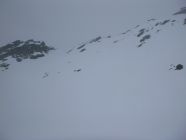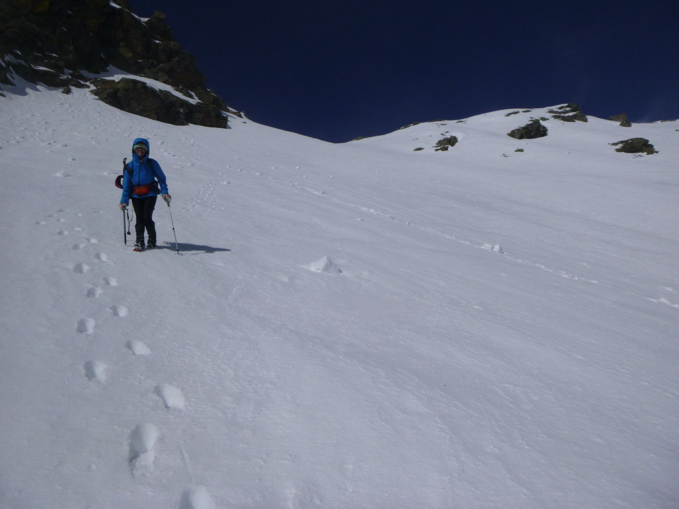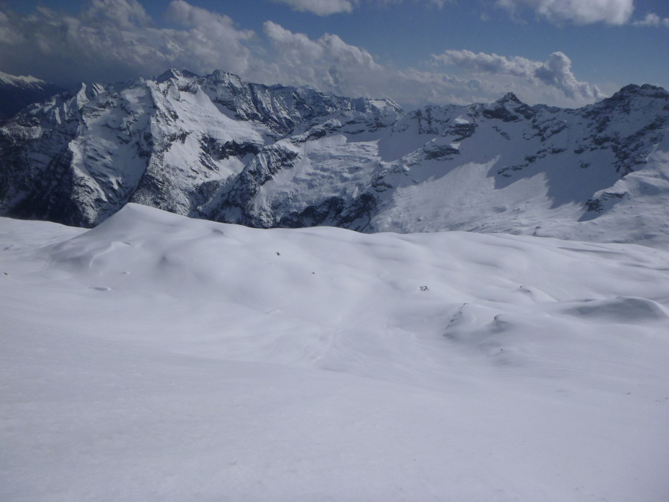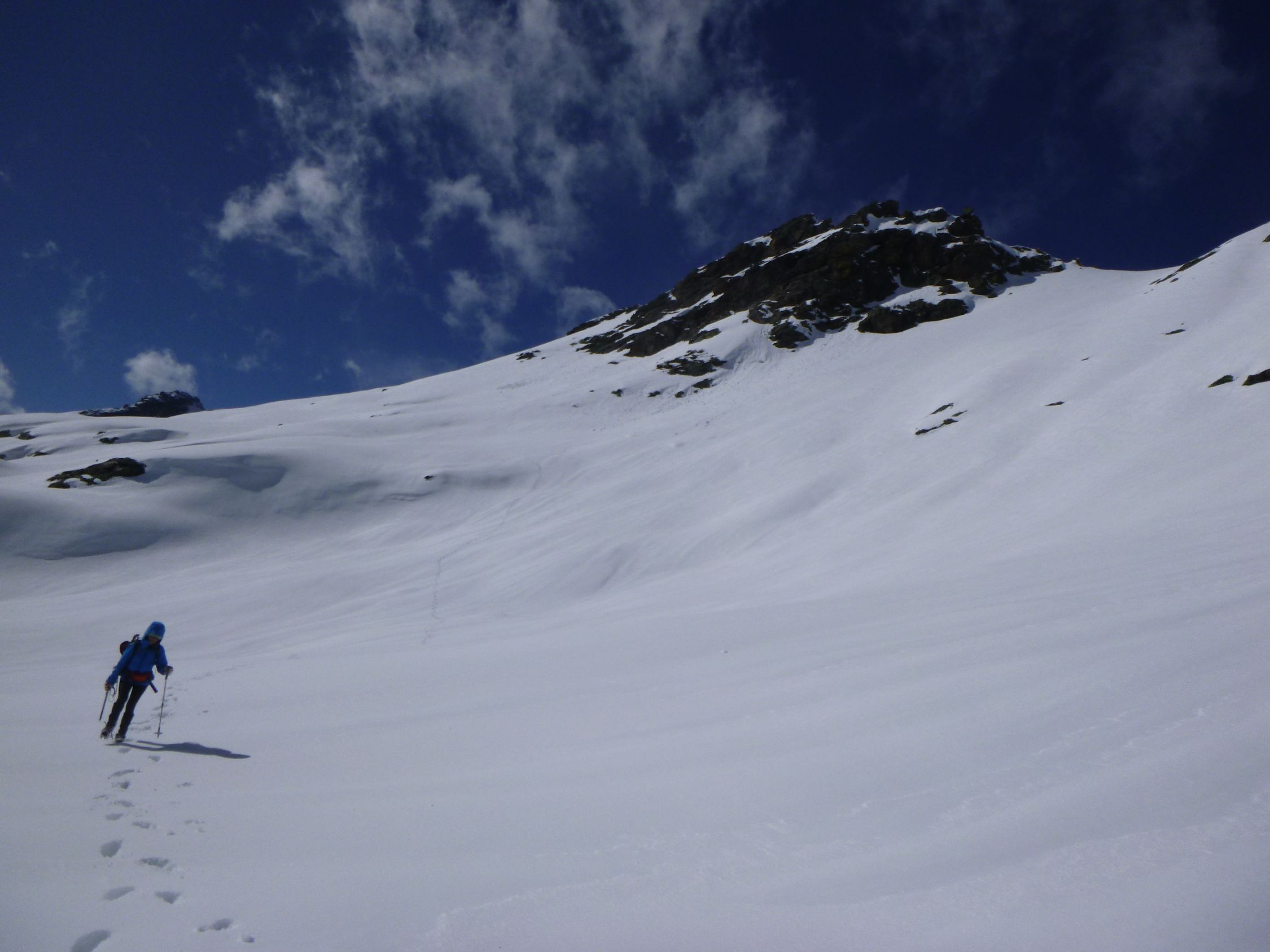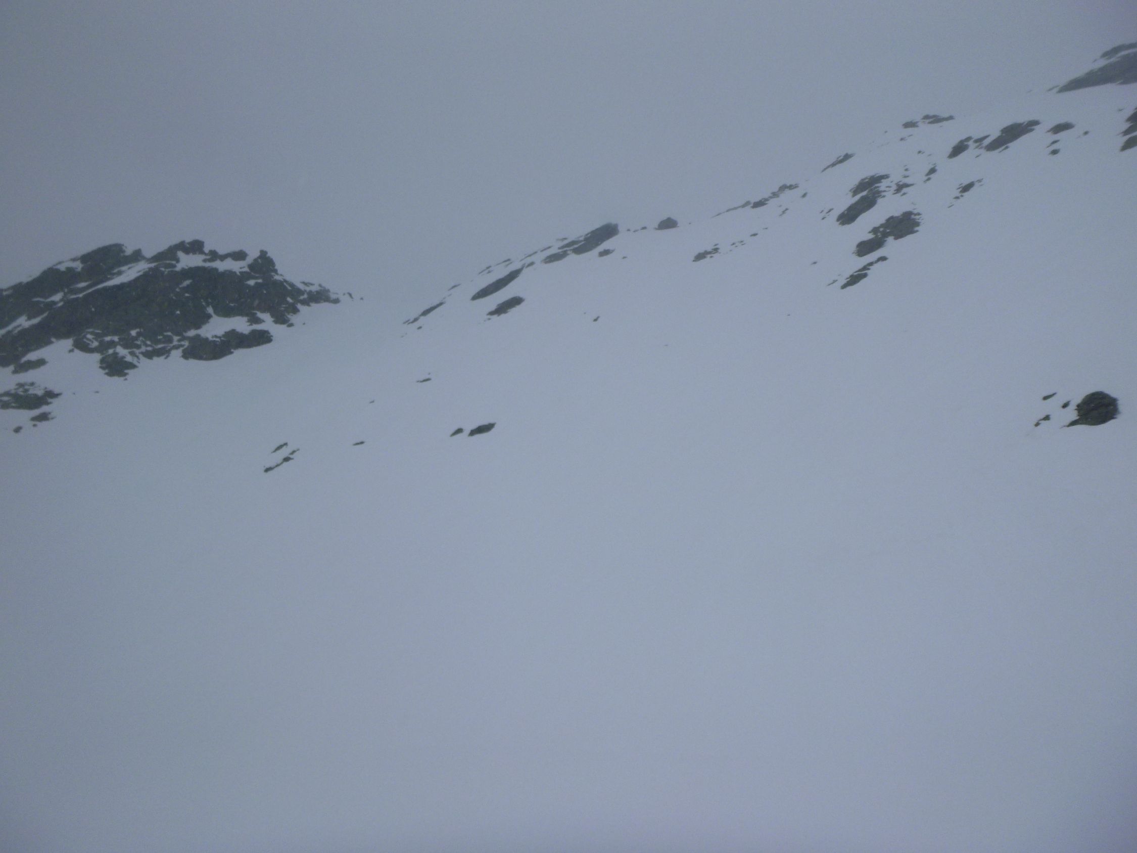 Tourenbeginn um 03:15 Uhr bei 4°C unter Vollmond und mit Stirnlampe. Ab Calle die Schneeschuhe angeschnallt. Nur noch Reste einer Skispur von vor 5 Tagen danach an manchen Stellen erkennbar. Wir orientierten uns nach der Sommerroute durch den Wald. Der Schnee war wegen den Temperaturen in letzter Zeit nicht gefroren, wir sanken jedoch nicht tief ein mit den Schneeschuhen. Nur sind immer wieder mal kurze Stellen im Wald schneefrei bis P 1537. Am Vormittag zogen dann ungemütliche Nebel- und Grieselschnee-Wolken auf. Zeitweise mit geringem Schneefall. Ebenso nahmen Windböen zu. Ab Rif. Sponda spurten wir dann am Vormittag hinauf in Richtung Gletscherpass über die Sommerroute SAC-Nr. 1236. Die SW-Flanke ab ca. 2600 m war jedoch aufgrund der Wärmestrahlung etwas angefirnt, so dass die Schneeschuhe nicht mehr hielten. Etwas akrobatisch wechselten wir dann in unterer Flanke auf Steigeisen um. Die Lichtverhältnisse waren diffus, der Wind wurde stärker und es begann Grieselschauer, so dass wir uns entschieden, rechts und etwas oberhalb vom Pass zum anfänglichen Grat aufzusteigen, um zurück zum Passo di Ghiacciaone dann nicht ganz so steil absteigen zu müssen. Wir trauten der Wetterprognose nicht. Im Abstieg kam dann allerdings tatsächlich die Sonne durch und es gab Sicht. Falsche Entscheidung ?