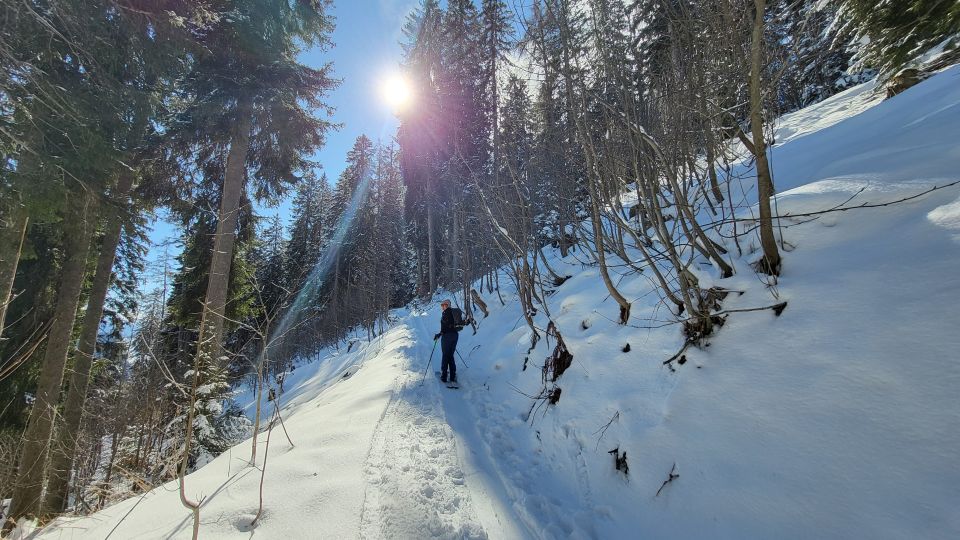 Pulverschnee-Skitourentag und das Ende März - ausgezeichnete Bedingungen, am morgen kalt, 15 cm Pulverauflage, Sonne und grand bleu! Bei der Abfahrt um 12.00 war der Pulverschnee auf den Sonnehängen shon etwas schwer, sonst aber luftig-locker. Wenig Leute unterwegs, einige Male konnten wir die first lines ziehen.