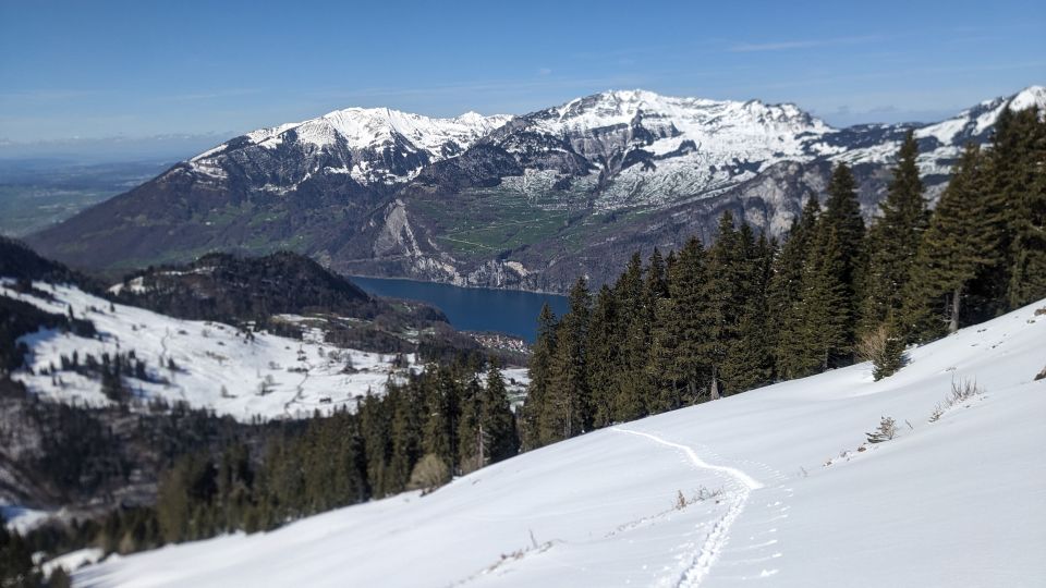 Abfahrt mit First Line bei genialen Verhältnissen. Im Gipfelhang eine gute Linie erwischt, bis auf etwa 1350m hinunter toll zu fahren. Dann war fertig mit Unterlage, die letzten 50hm sehr defensiv zur Strasse, den teils schon aperen Flecken darauf ausweichend mit Ski retour zum Bikedepot und per Schussfahrt zurück nach Obstalden.