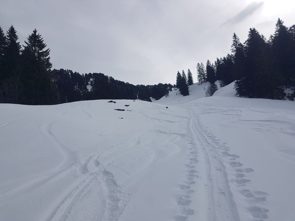 Die Schneequalität war, je nach Höhe oder Exposition, ziemlich unterschiedlich: Feuchter Pulver, Nass-Schnee, leichter Deckel, windgepresster Pulver. Ich kam eigentlich mit wenig Erwartung, wurde jedoch angenehm überrascht. Es war schön zu fahren, ausser auf den unteren 100 m, wo der Schnee ziemlich bremsend war.