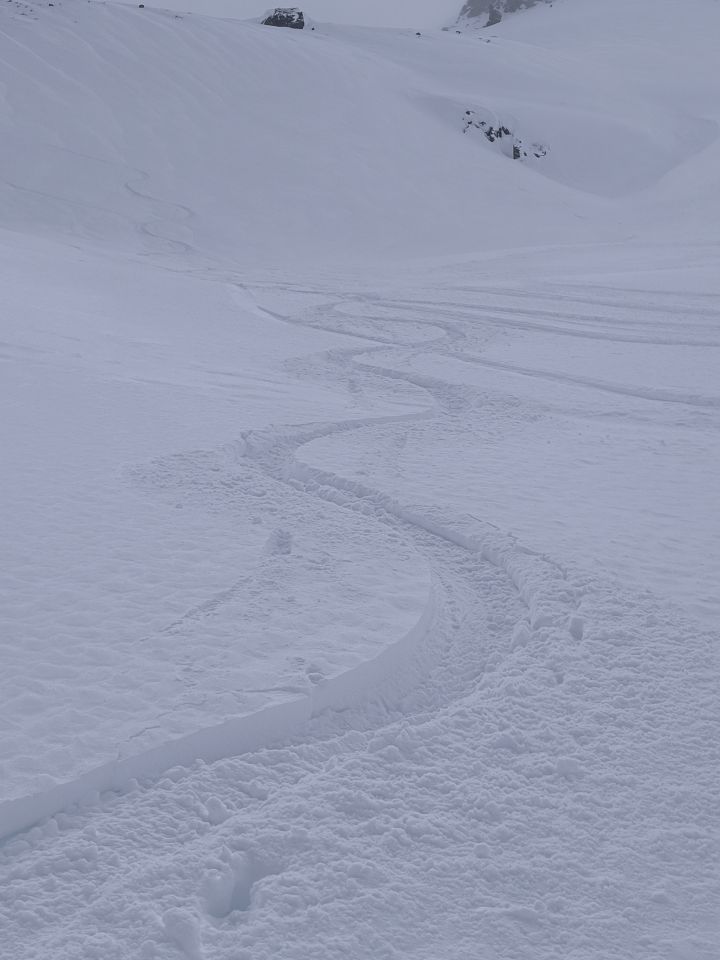 Der Baumeister der Lawinen war sehr eifrig die letzte Nacht. Zum Tourstart um ca 9 Uhr wurden wir schon beim Ausstieg aus dem Auto mit heftigen Wind begrüßt. Dick eingepackt machten wir uns von Tschuggen Richtung Flüelapass. Unterwegs war die Zielstrebigkeit schon leicht angeknackst als eine Gruppe vorzeitig genug vom Gesichtspeeling hatte und umdrehte. Ich war schon dran statt Chlein Schwarzhorn nochmals Flüela Weisshorn zu machen. Die Nordseite vom Flüelapass sah irgendwie freundlicher aus. Wir blieben bei unseren Gipfelziel. Erste kritische Stelle gleich nach dem Pass. Die erste steile Kuppe war teilweise gefüllt mit viel Triebschnee. Die Aufstiegsspur machte ich unorthodox aber so konnte man den Triebschnee gut ausweichen. Nachdem die Steilstufe sicher überwunden war und wir den ersten Einblick zum Chlein Schwarzhorn hatten, blieb ausgerechnet eine fette Wolke am Flüela Schwarzhorn/Chlein Schwarzhorn hängen. Diese verschwand auch nicht mehr. Die Sicht wurde immer lausiger bis zum White Out. Ab den grossen Boulderfelsen 2700m, den wir zu unseren Gipfelziel erklärten, kehrten wir sicherheitshalber, da die Triebschneesituation beim eigentlichen Gipfel auch mit Sicht heikel war. Bei der Abfahrt reichte es noch zu einigen Powderschwüngen und ab Pass waren alle Gipfel sonnenüberflutet nur die 2 Schwarzhörner nicht. Unterwegs sahen wir ein fern ausgelöstes Schneebrett.