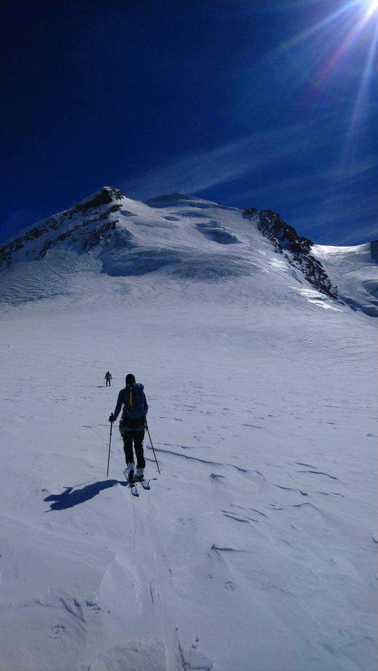 Nach uns noch zwei Tourengeher am Castor getroffen. Ansonsten sind alle anderen vom Kleinen Matterhorn zum Pollux oder direkt übers Schwarztor abgefahren.
