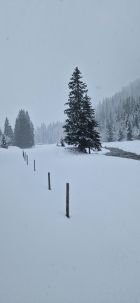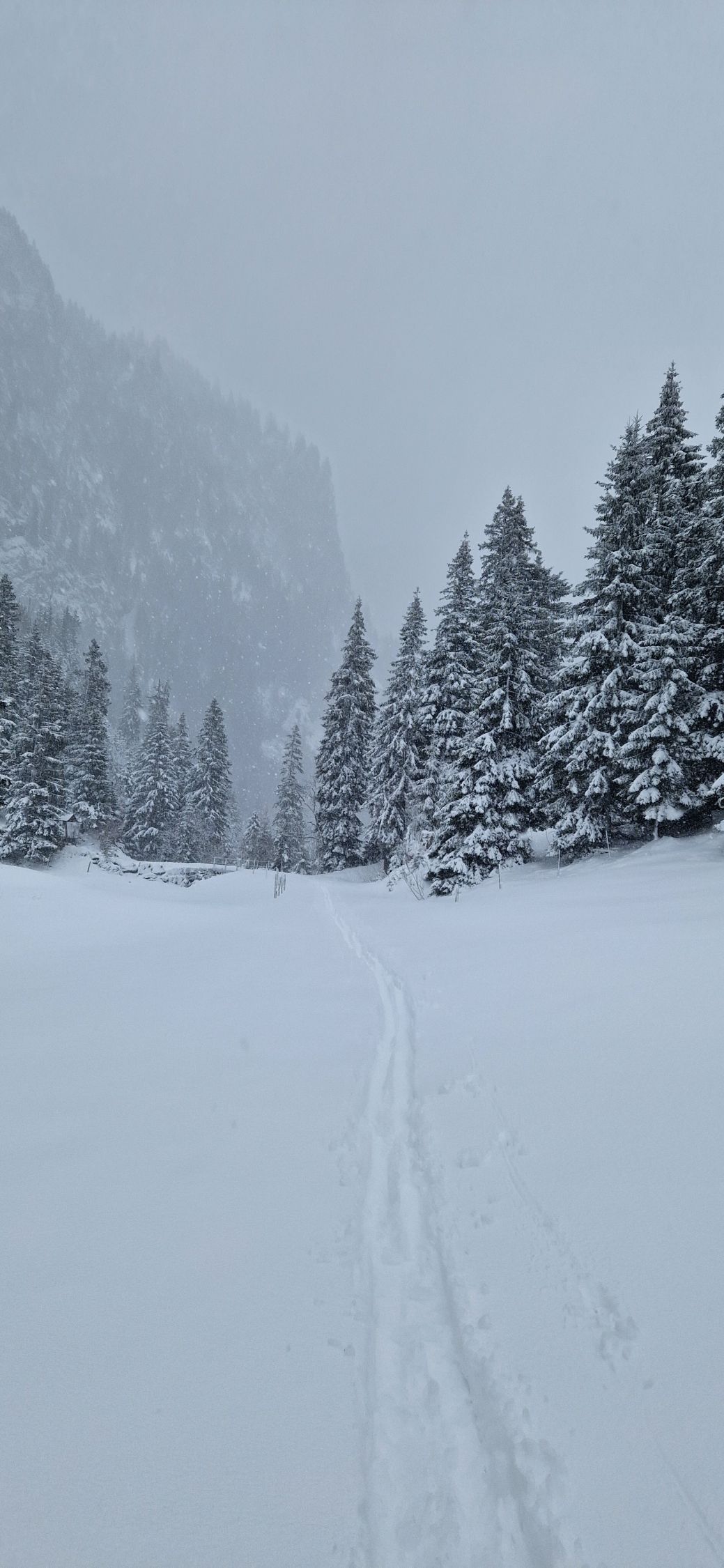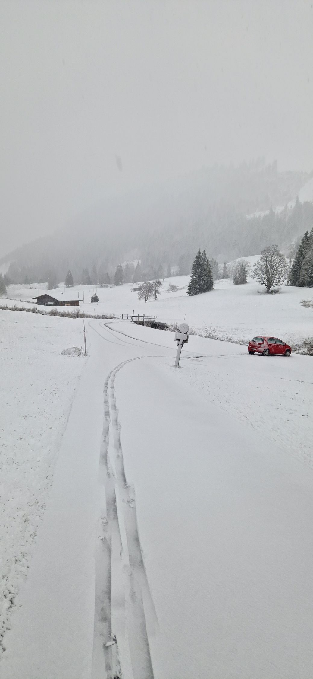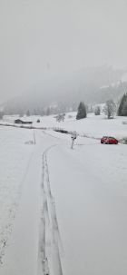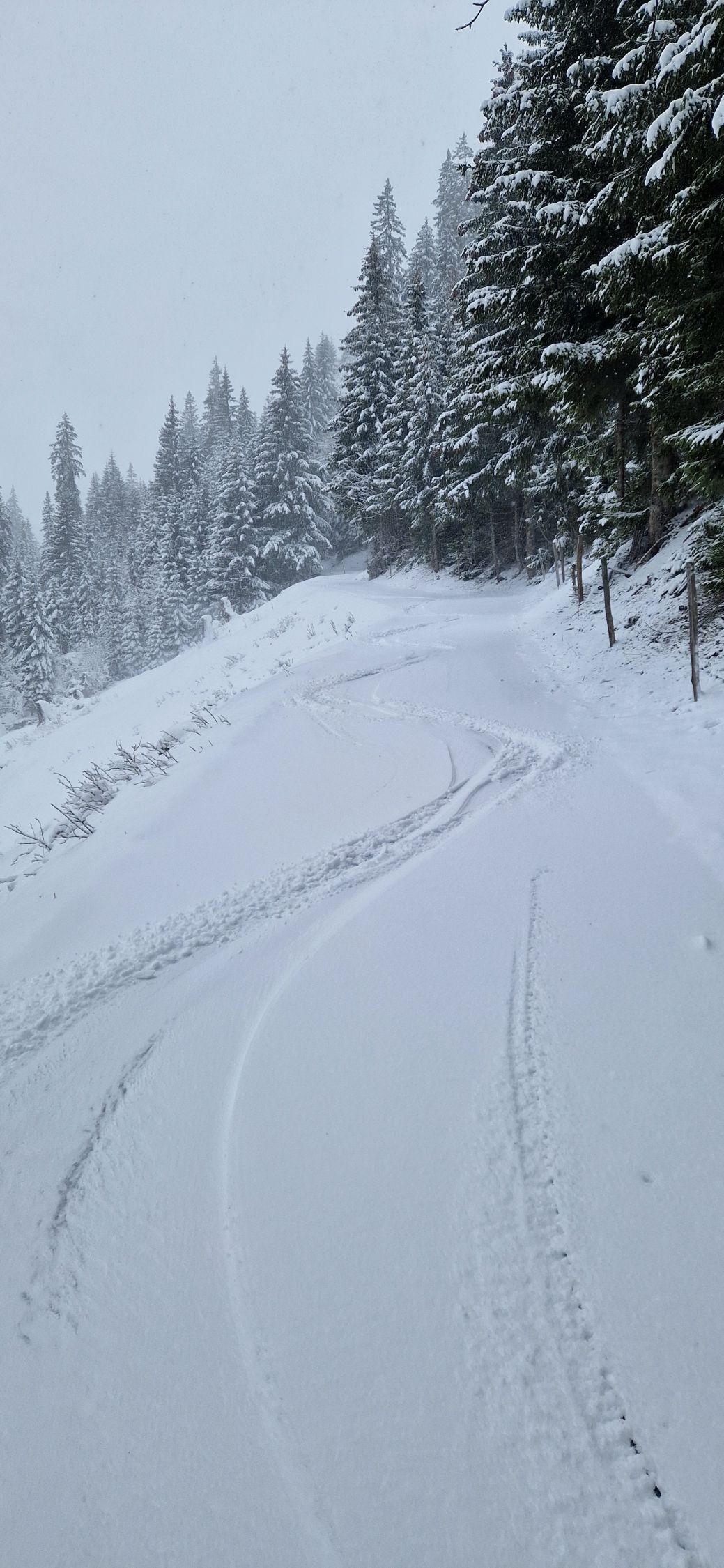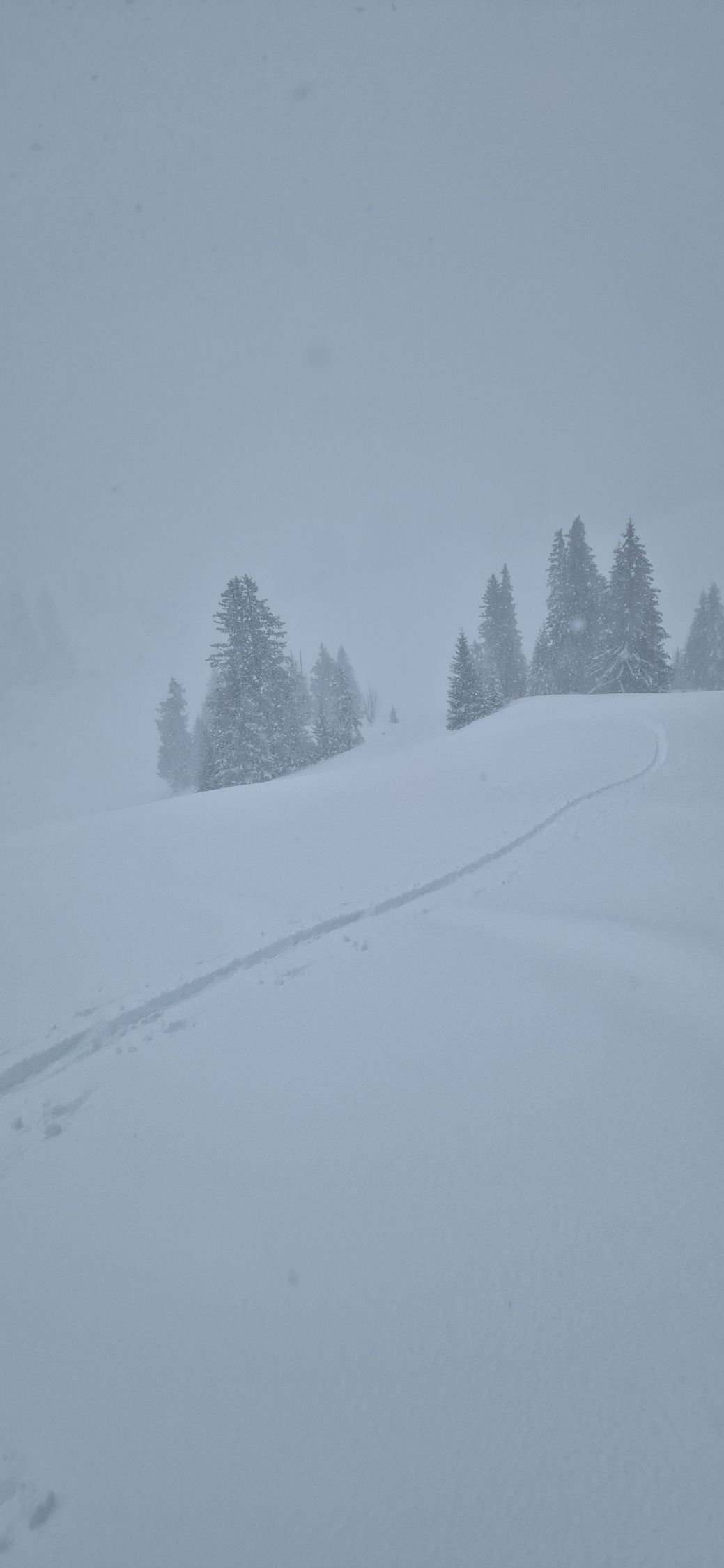 Start um 8 beim Parkplatz bei 1 Grad und starkem Schneefall. Die Strasse zum Brätliplatz war genügend eingeschneit um mit den Fellen hochzulaufen und auch runter zu fahren. War alleine im Gebiet, wunderschöne verschneite Landschaft und ca. 20cm Neuchschnee. Oben sehr stürmisch.