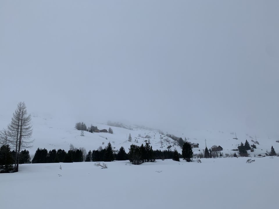 Der Wind hat vom Neuschnee nicht viel übrig gelassen. Es ist alles grossflächig abgeblasen. Der Triebschnee hat sich hinter Kuppen abgelagert. Wegen schlechter Sicht sind wir nach 400 Höhenmetern umgedreht. Immerhin fuhr es sich wie auf einer harten Piste.