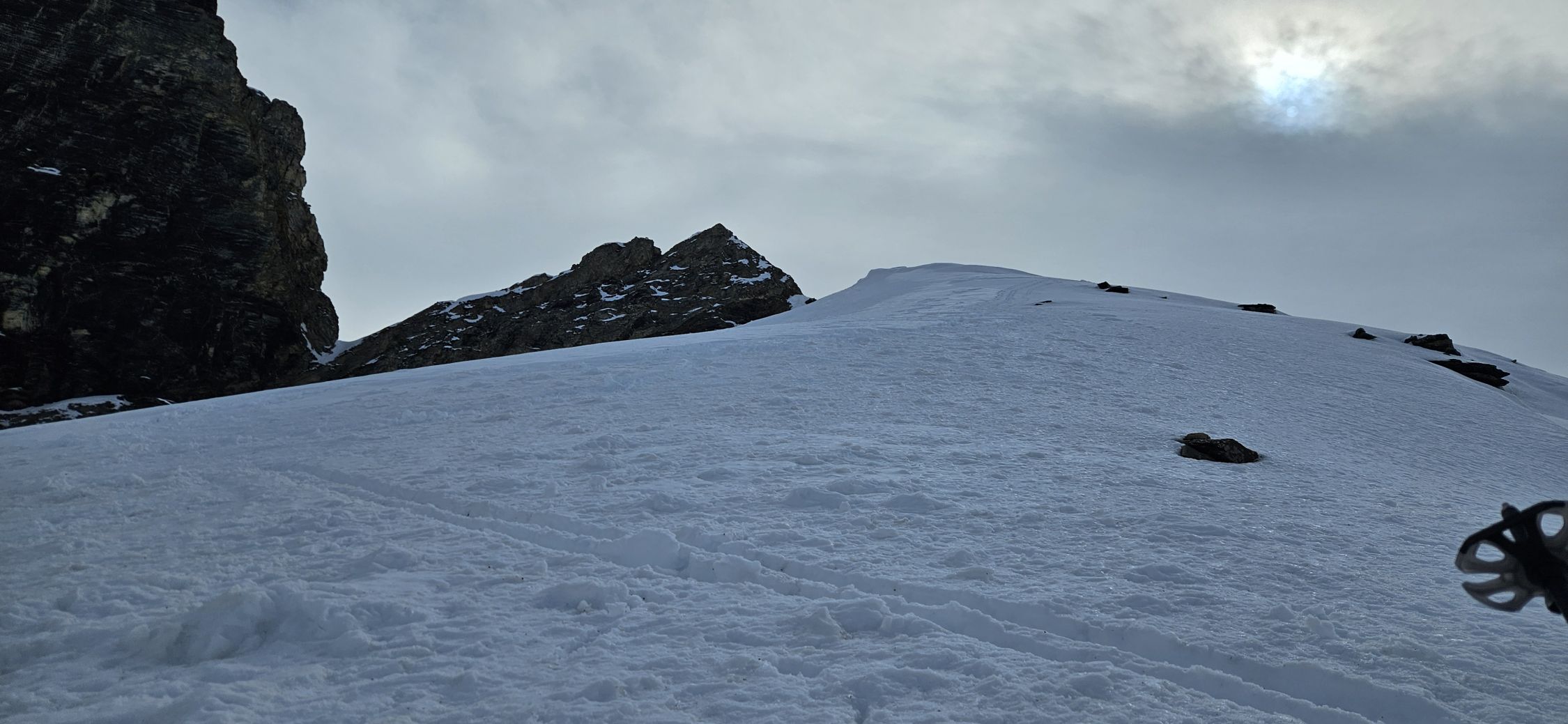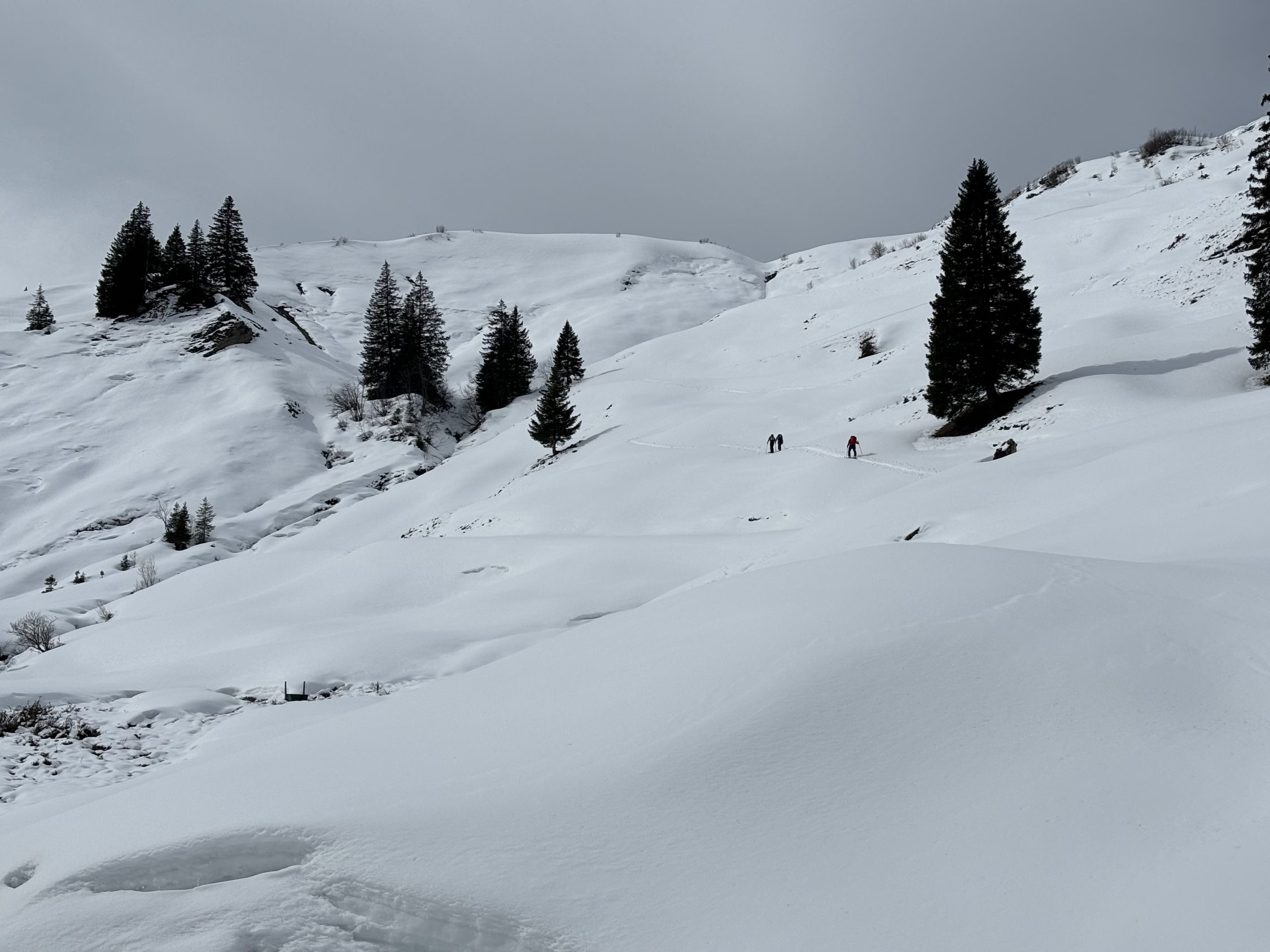 Vor uns eine Skifahrerin und ein Splitboarder, die noch ein paar Meter höher aufgestiegen sind, sonst niemanden gesehen.