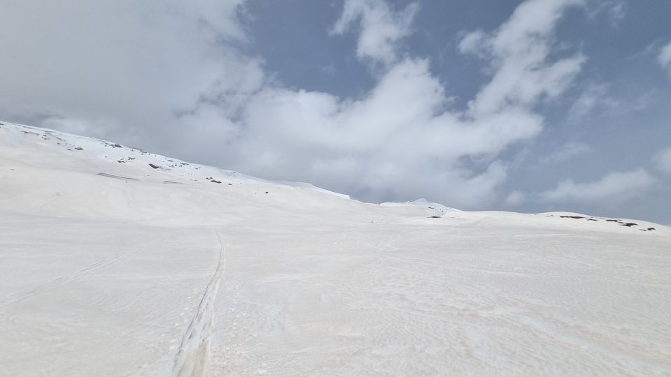Wetter ganz passabel, abgesehen von dem stürmischen Wind. Schnee unten nass und sumpfig, Schnee oben stark windbearbeitet und beginnender Bruchharsch.