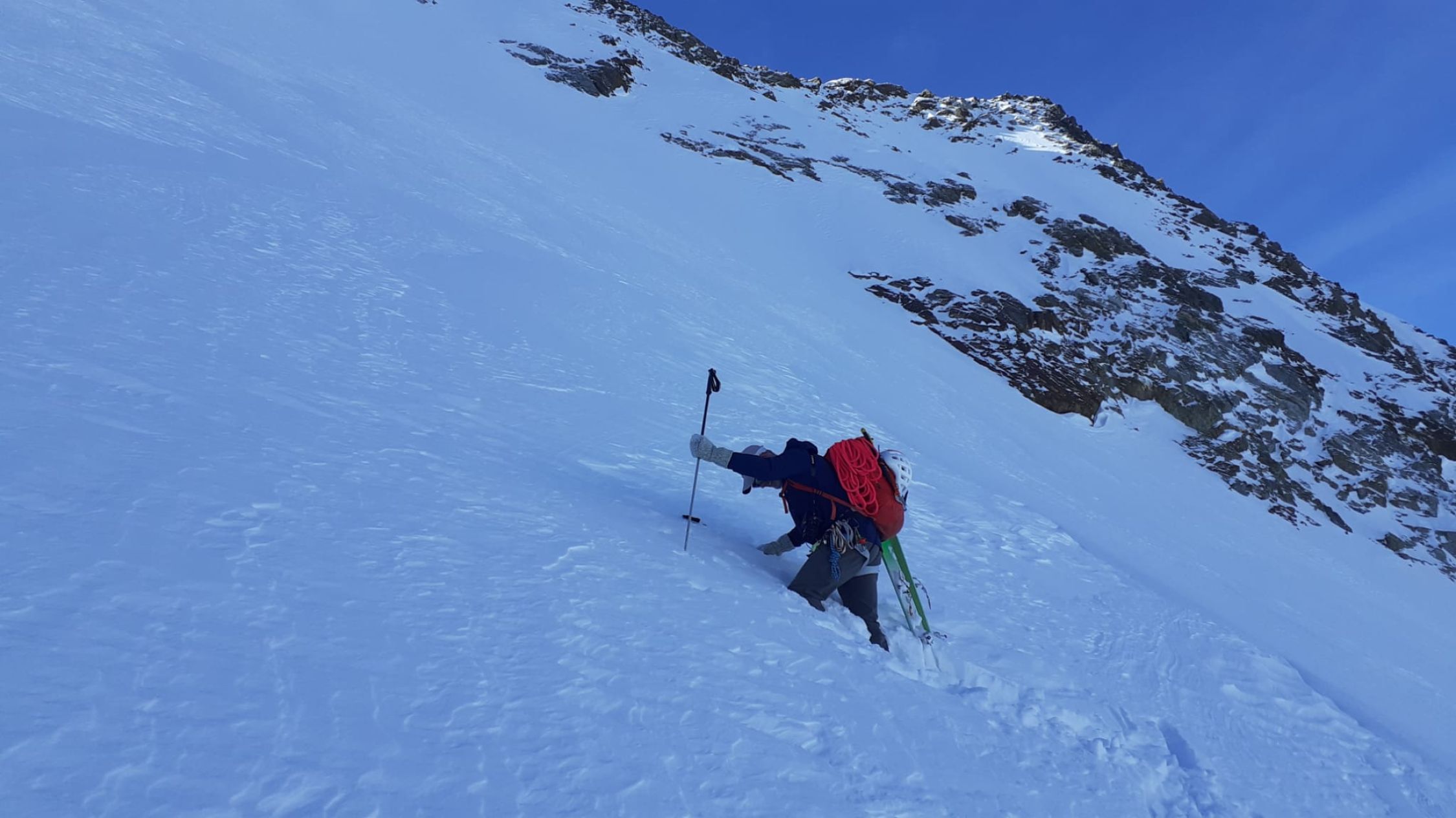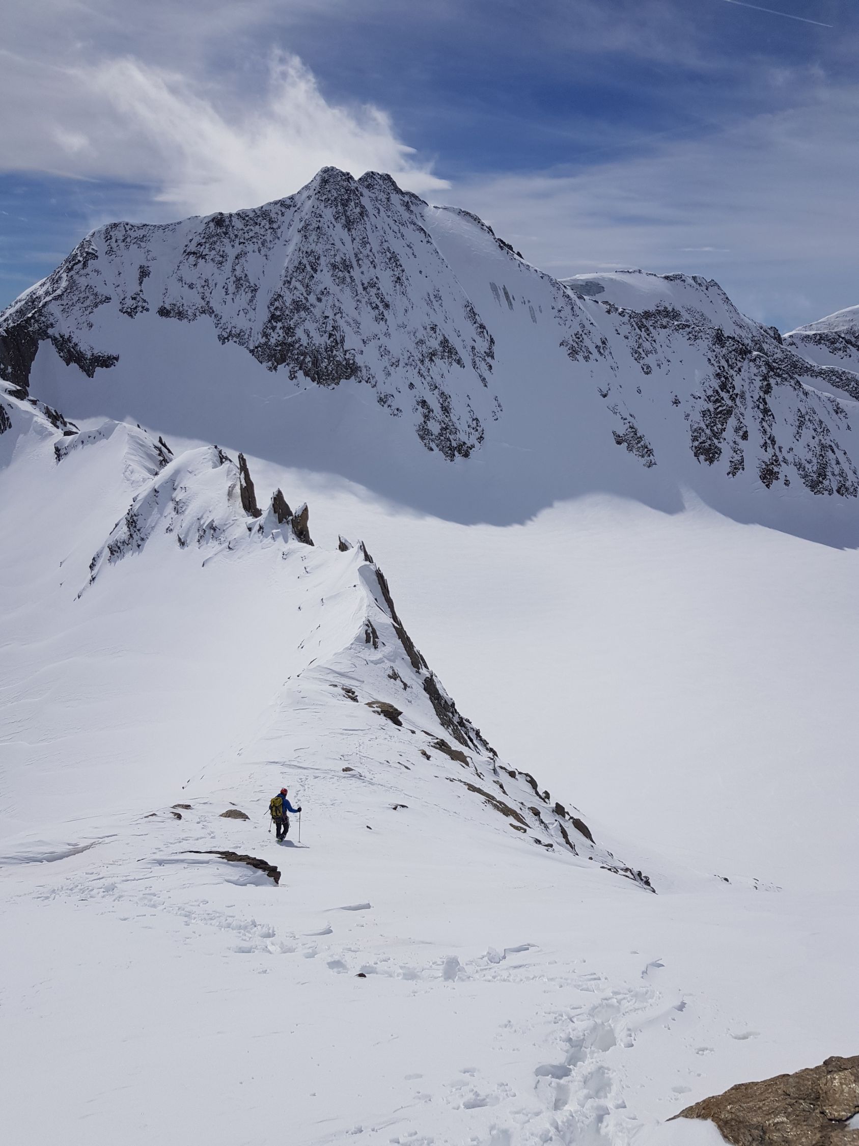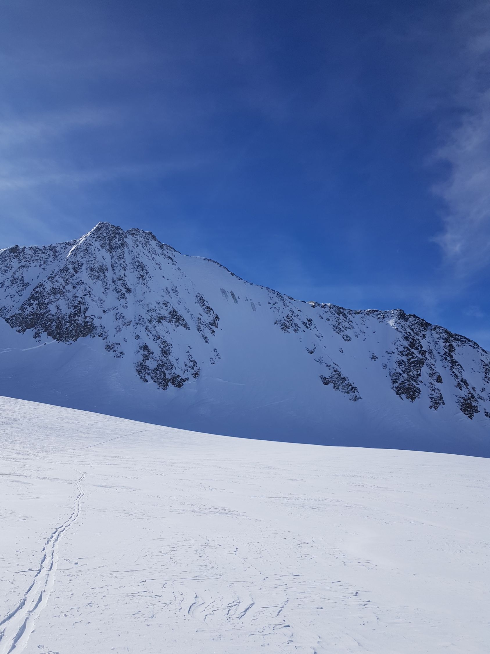 Untere Wandhälfte eingeweht, ein Meter unverfestigter Schnee. Im Ausstiegsbereich ebenfalls Schnee, wahrscheinlich ebenfalls eingeweht. War uns zu heikel. Abstieg/Abfahrt auf den Marzellferner runter sah machbar, aber nicht super aus. Wir sind dann zur Entschädigung zur Mutmalspitze rüber.
