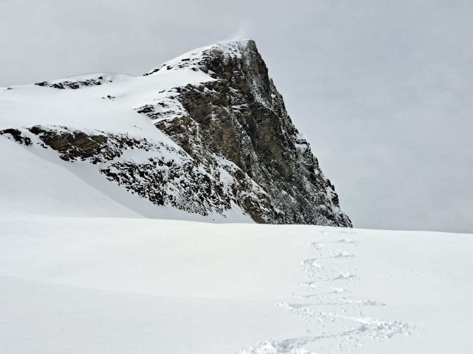 Am Morgen bis 2100m meist knapp tragend darüber 20cm Pulverschnee bis Wart und der Gipfelhang hart und stürmischer kalter Wind.