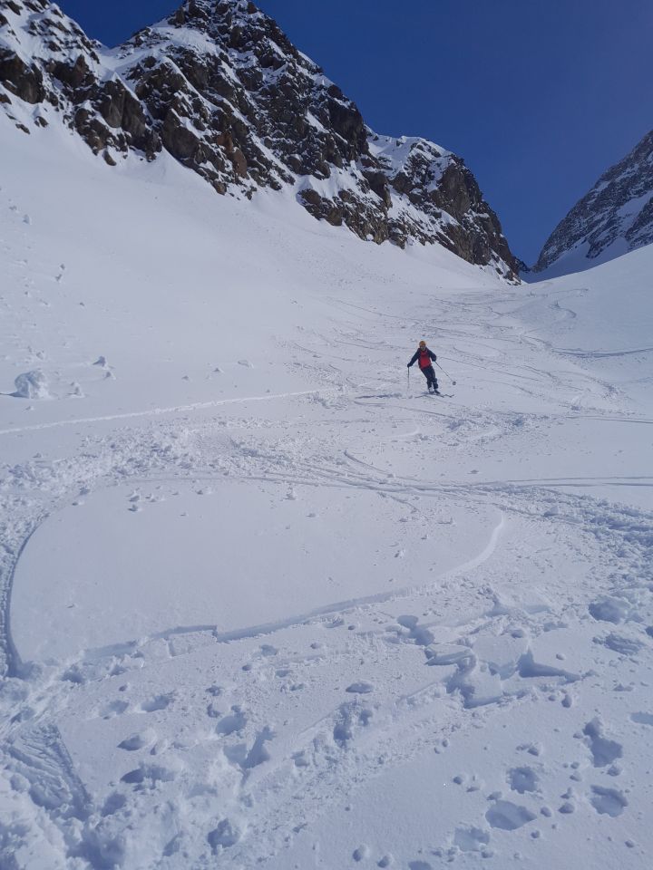 Ein erfahrener Türeler ist vom Sattel 3020m direkt nach Osten runter- coole Linie! (siehe Foto)