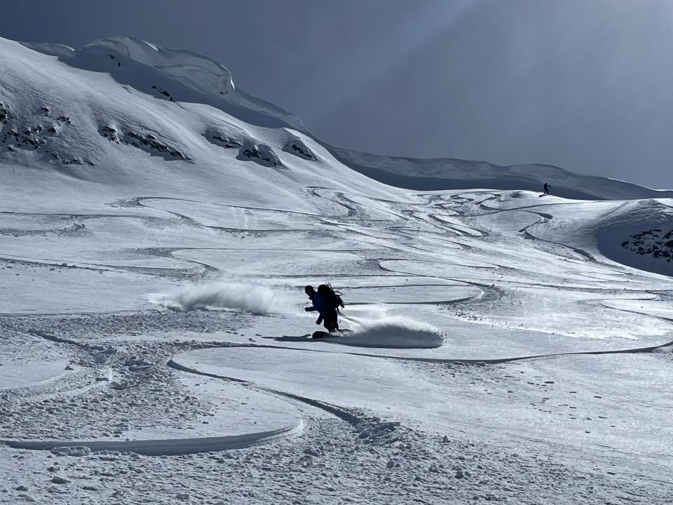 Start um 11:30, nur die ersten 200hm leicht weich, rest Pulver, es liegt eine gute Spur bis Gipfel 14:00: Hat noch Platz für eigene Spuren, Abfahrt top in Nordexpo Hängen. Sehr viel Schnee im Gebiet, am Pass 1m +