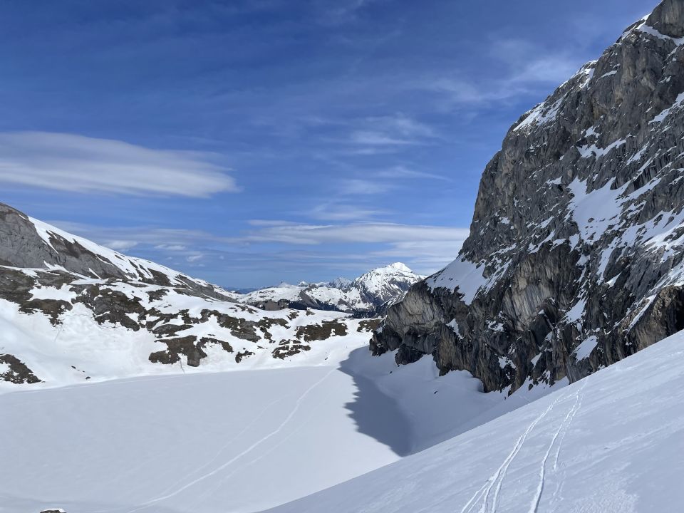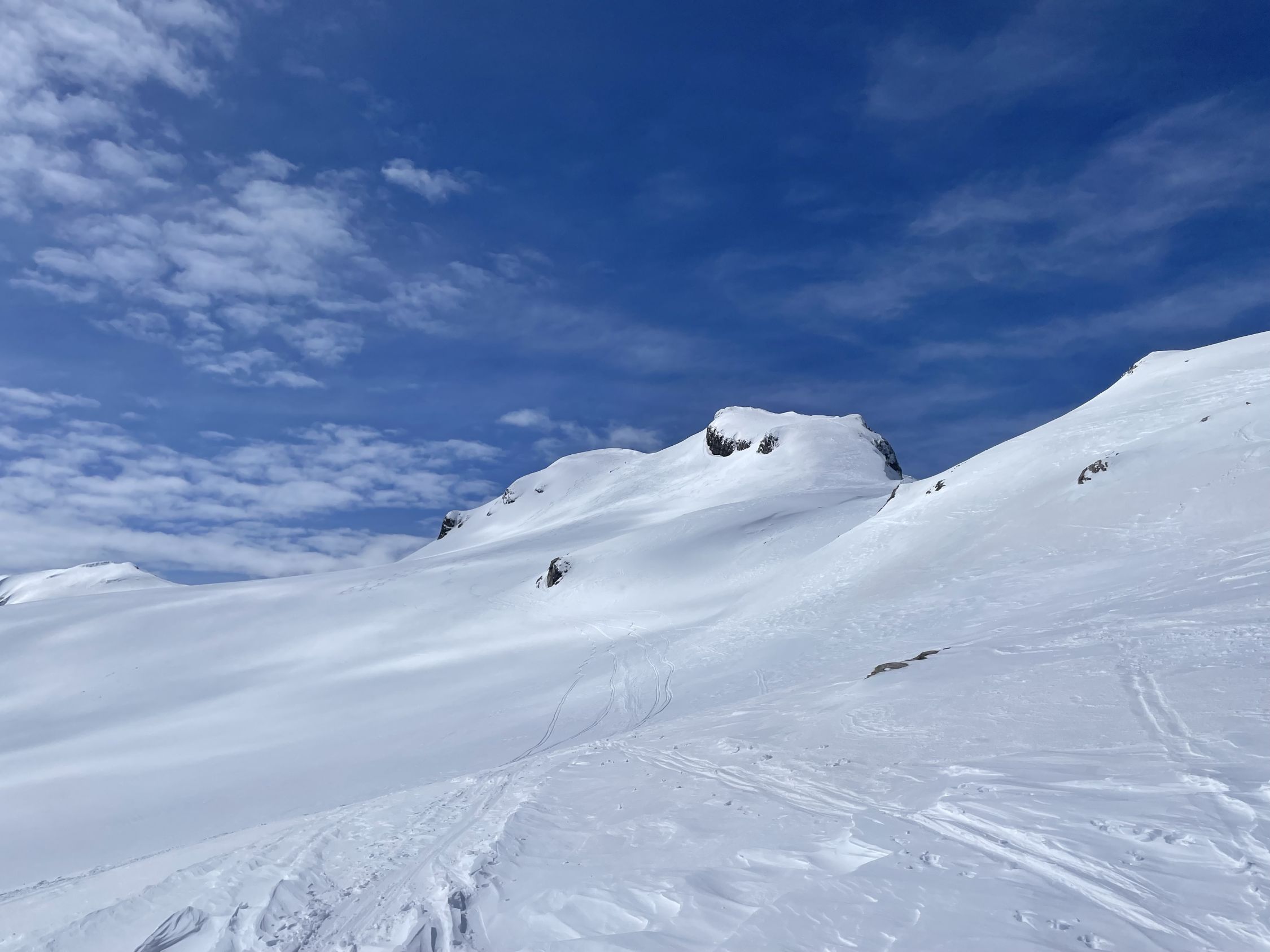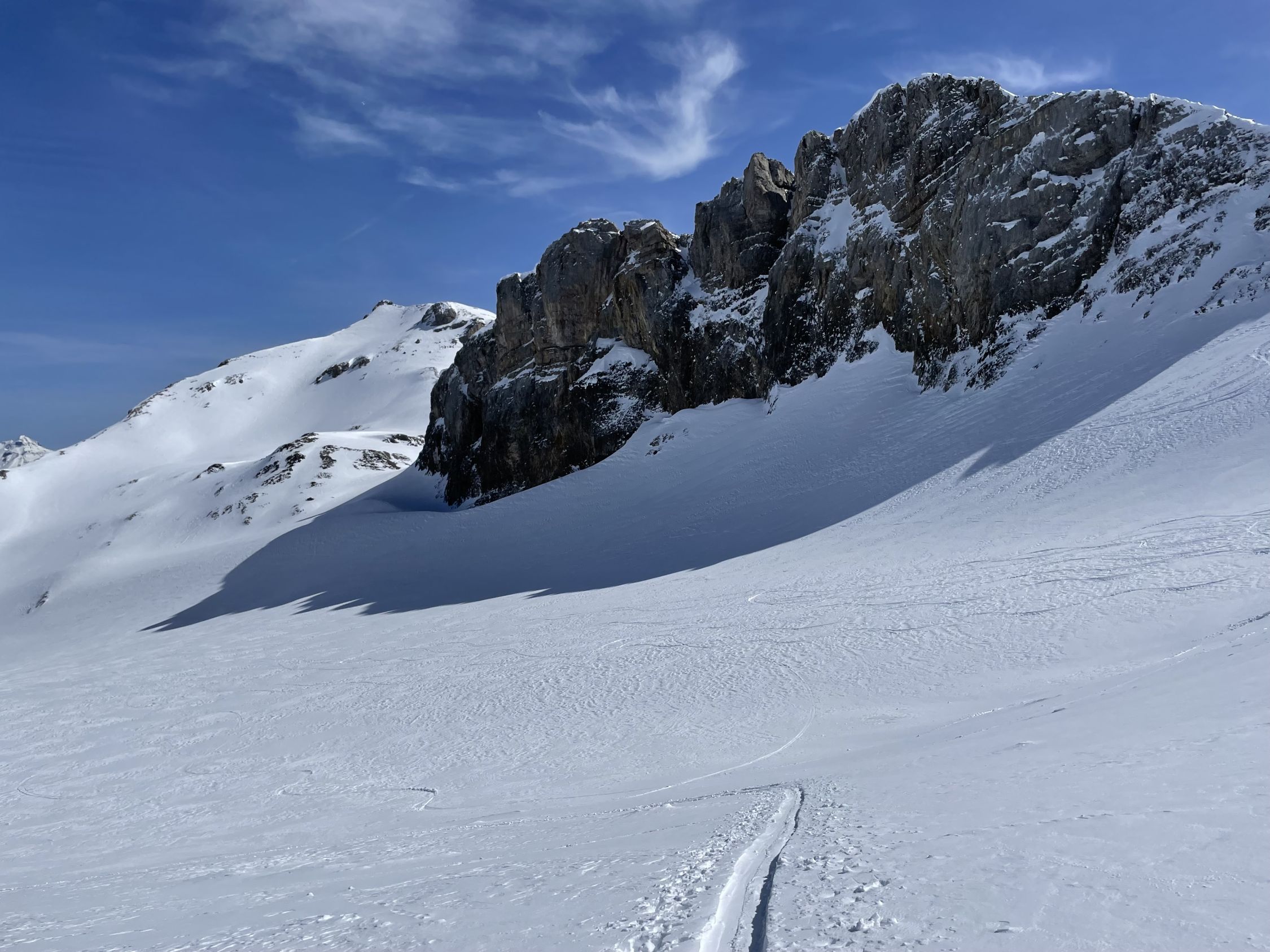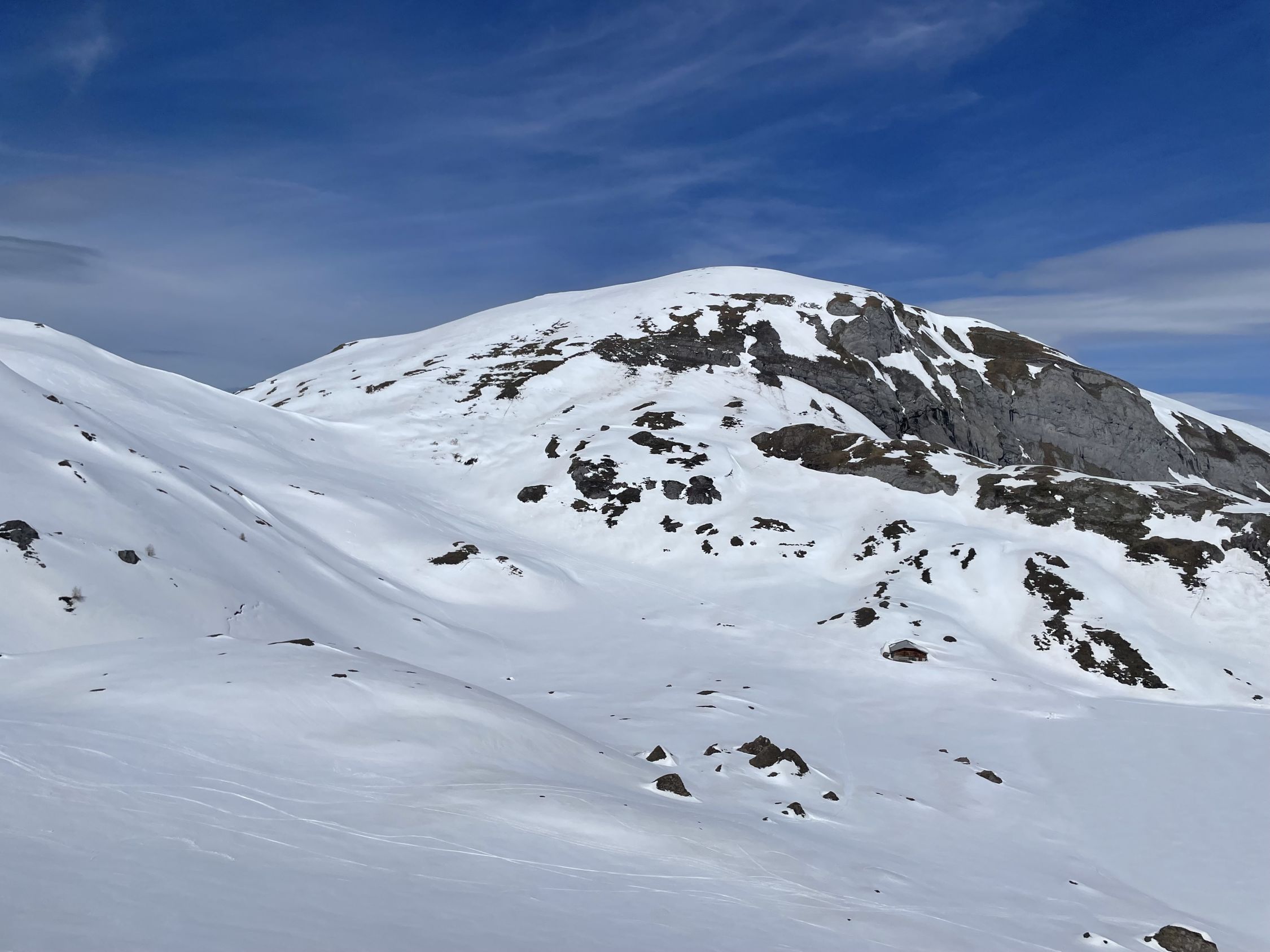 Spur trotzdem etwas rutschig. Ab Wildhornhütte relativ verblasen, was aber weder im Aufstieg noch in der Abfahrt gestört hat. Beim Chilchli genügend Schnee, so dass man gut um die Steine kommt. Aufschwung bei 2800 gut zu gehen, Spur aber schnell zugewindet (wie auch weiter zum Gipfel).
