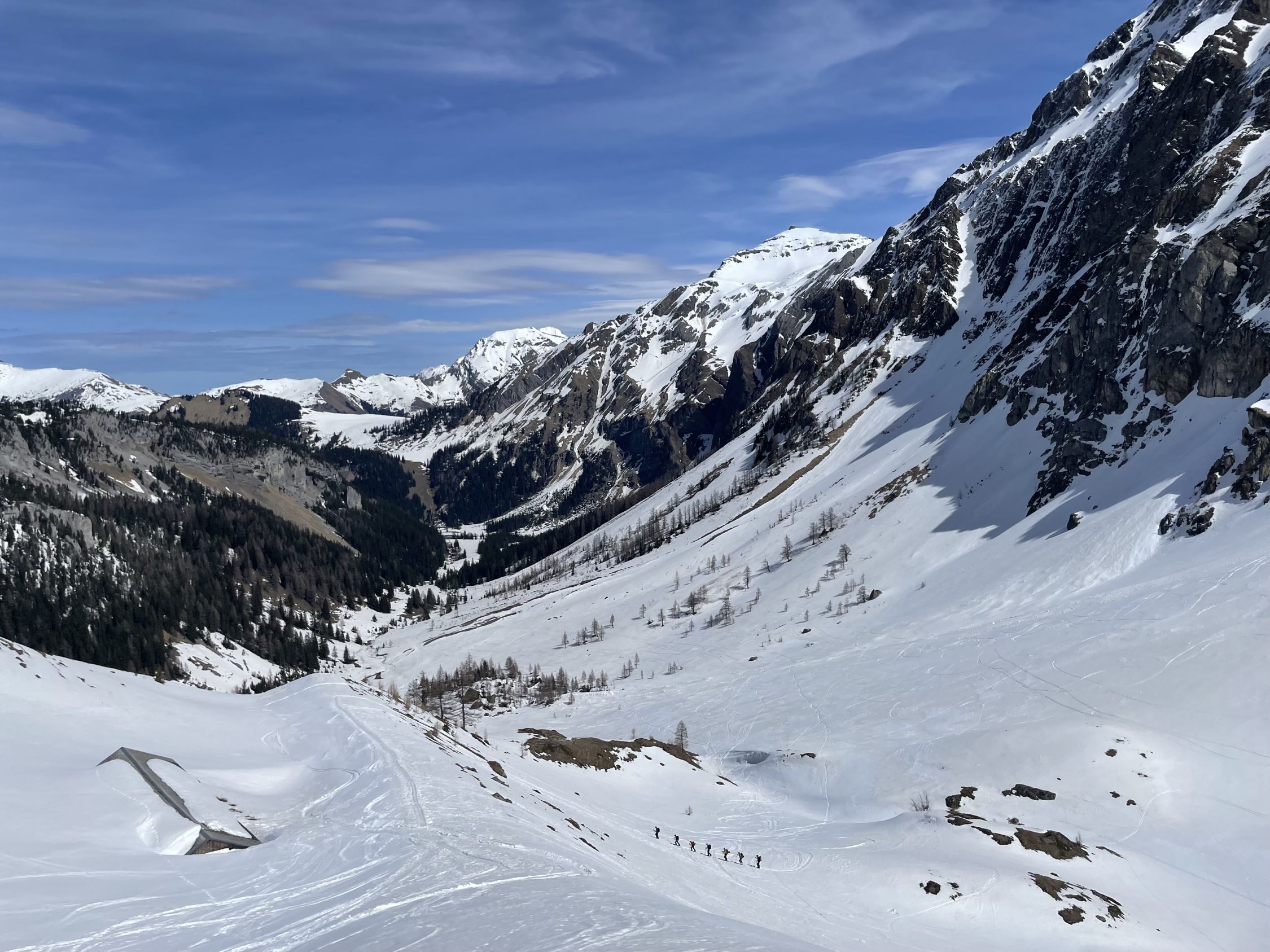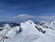 Der Schnee wechselt kleinräumig von Presspulver zu freigeblasenen Flächen. Auf letzteren an sonnexponierten Hängen auch auf 3000 m schon Sulz (Abfahrt 13.30). Weiter unten sulzt auch der Presspulver auf, ist aber dann eher bremsend. Morgen sicher besser, wenn der Schnee sich weiter umgewandelt hat und die Presspulverfläche weniger nachgibt.