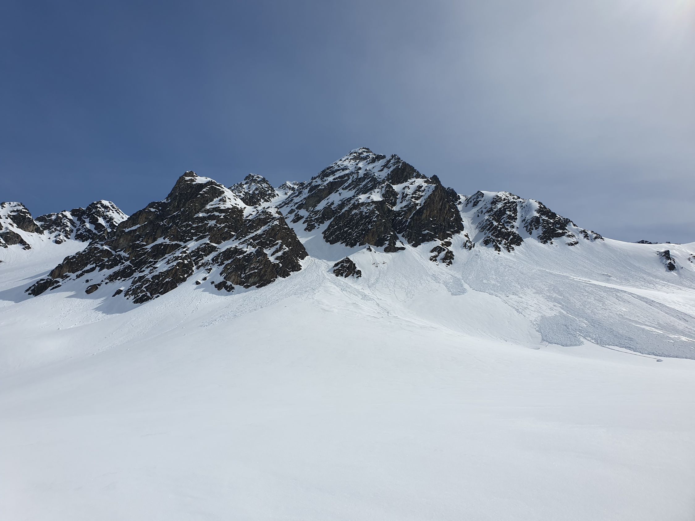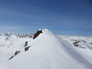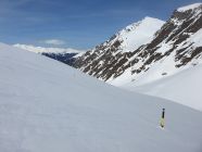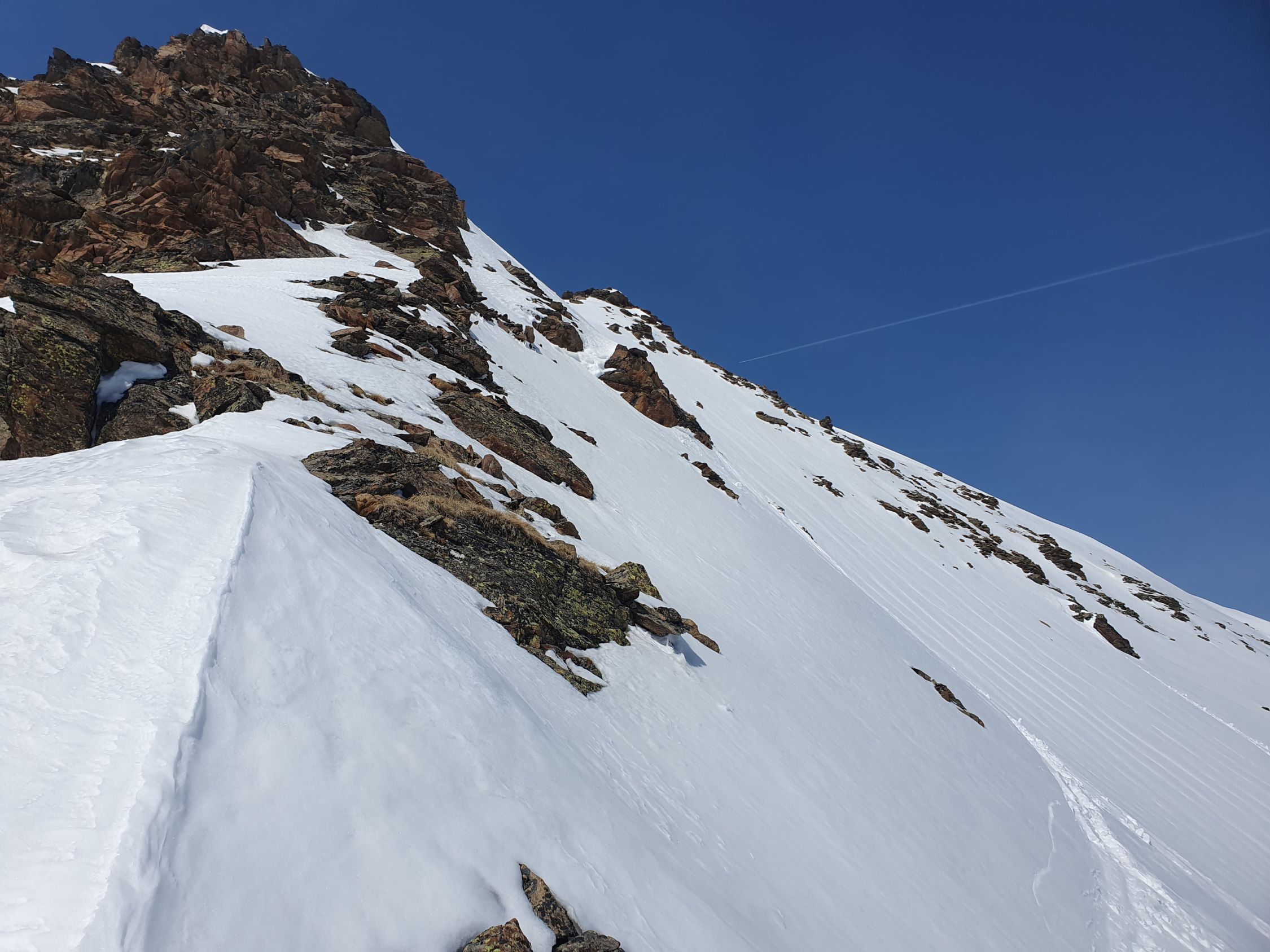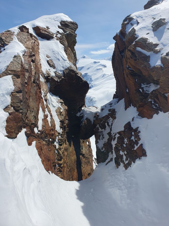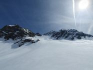 Ich bin da alles mit den Skis hianb, aber dieser Teil hat unter dem Schnee viele Steine (hier allenfalls besser zu Fuss) und kurz vor dem Sattel muss man in die steile Ostseite ausweichen. Da der Schnee schon ziemlich nass war habe ich seitlich extra ein paar Sprünge gemacht, um einen kleinen Rutsch auszulösen, damit die Stelle entschärft wurde. Das Gelände wäre sonst zu heikel gewesen um direkt vom Sattel abzufahren.