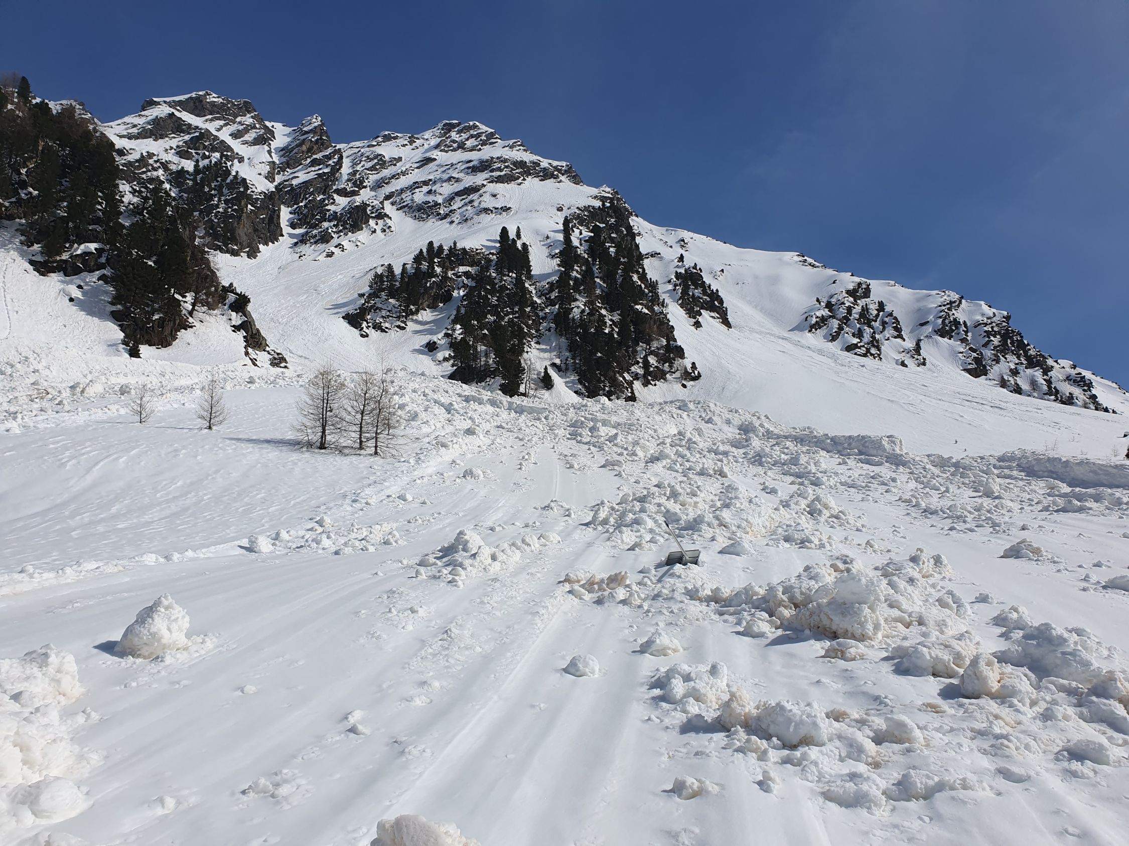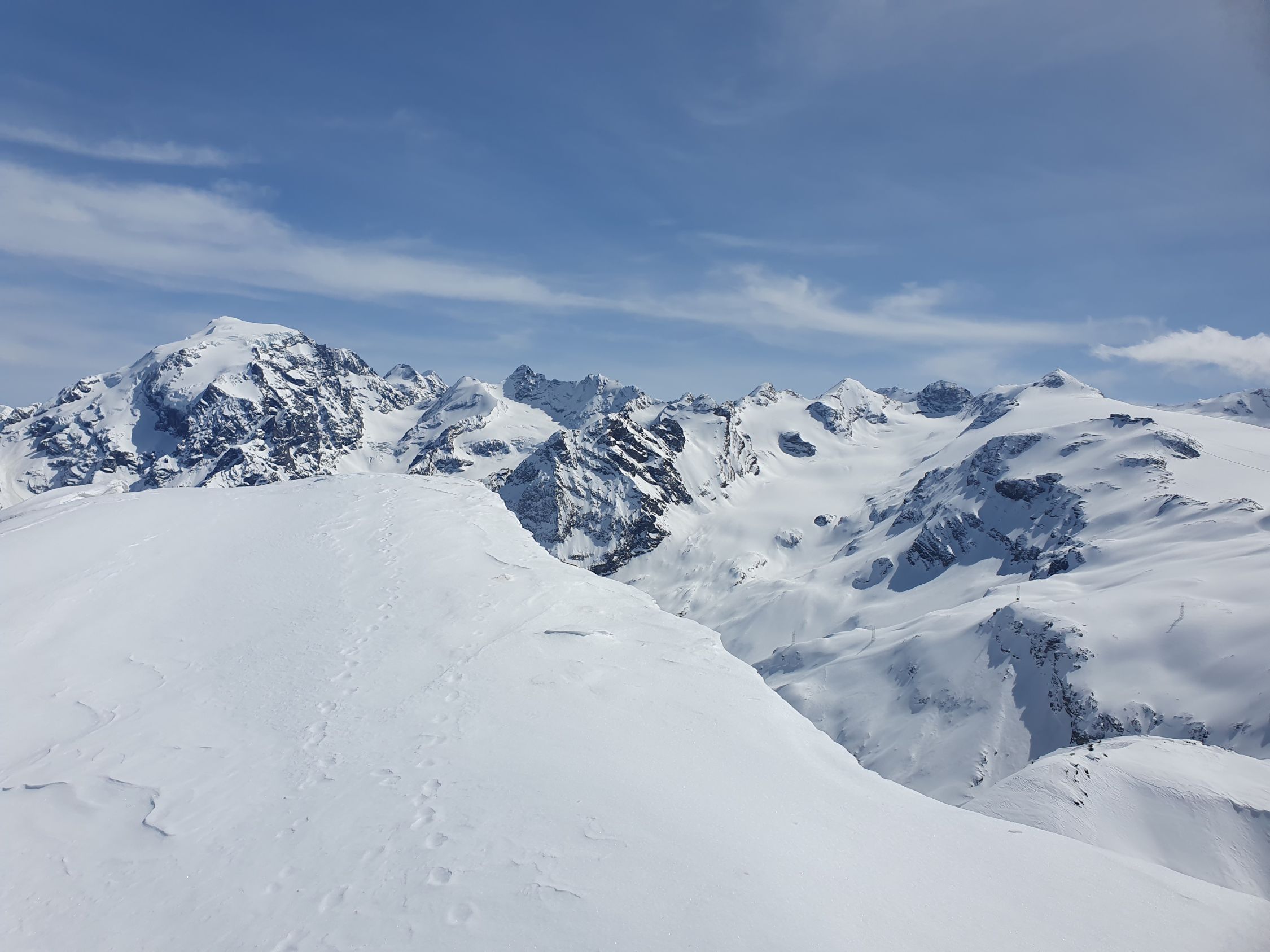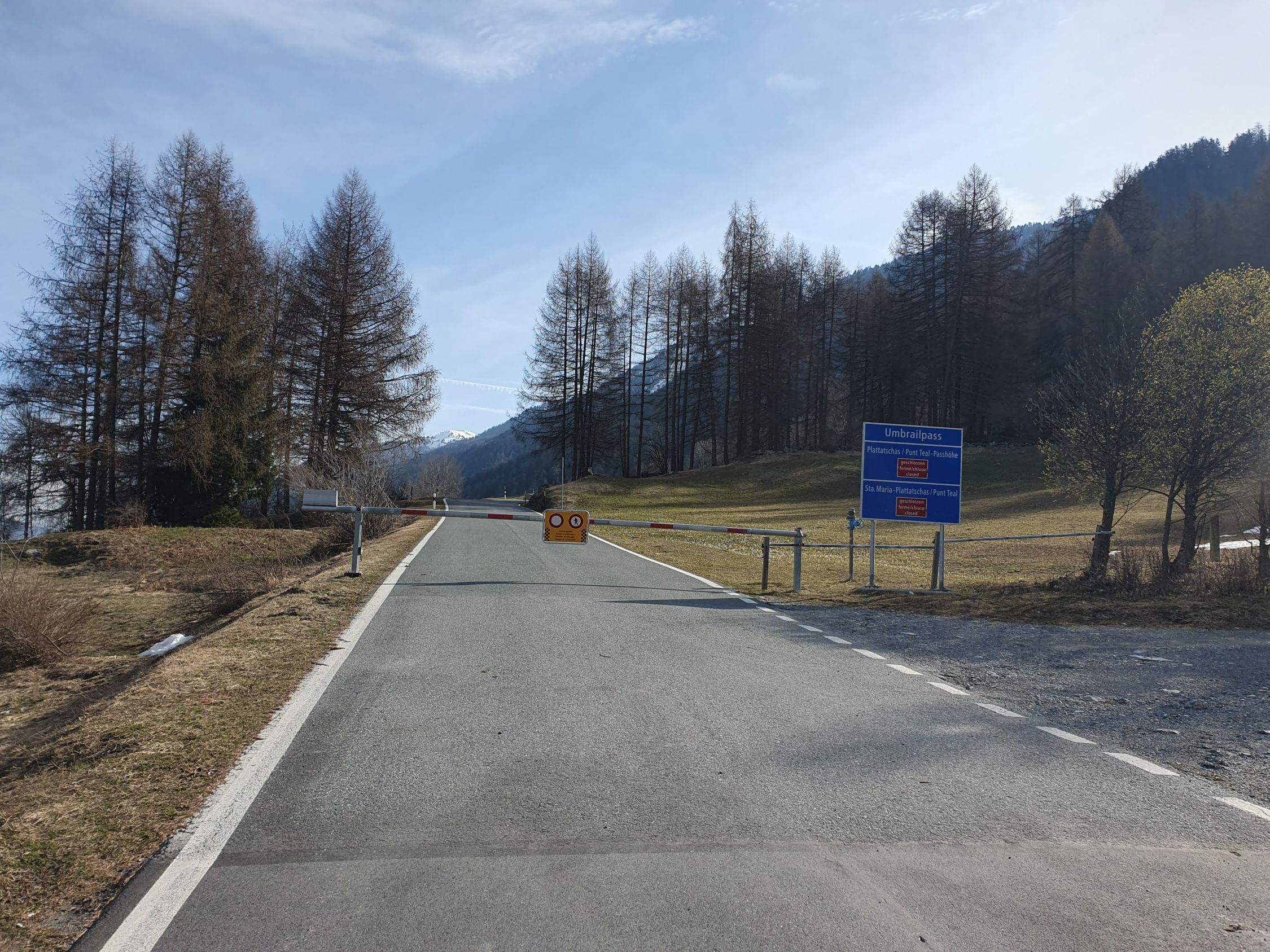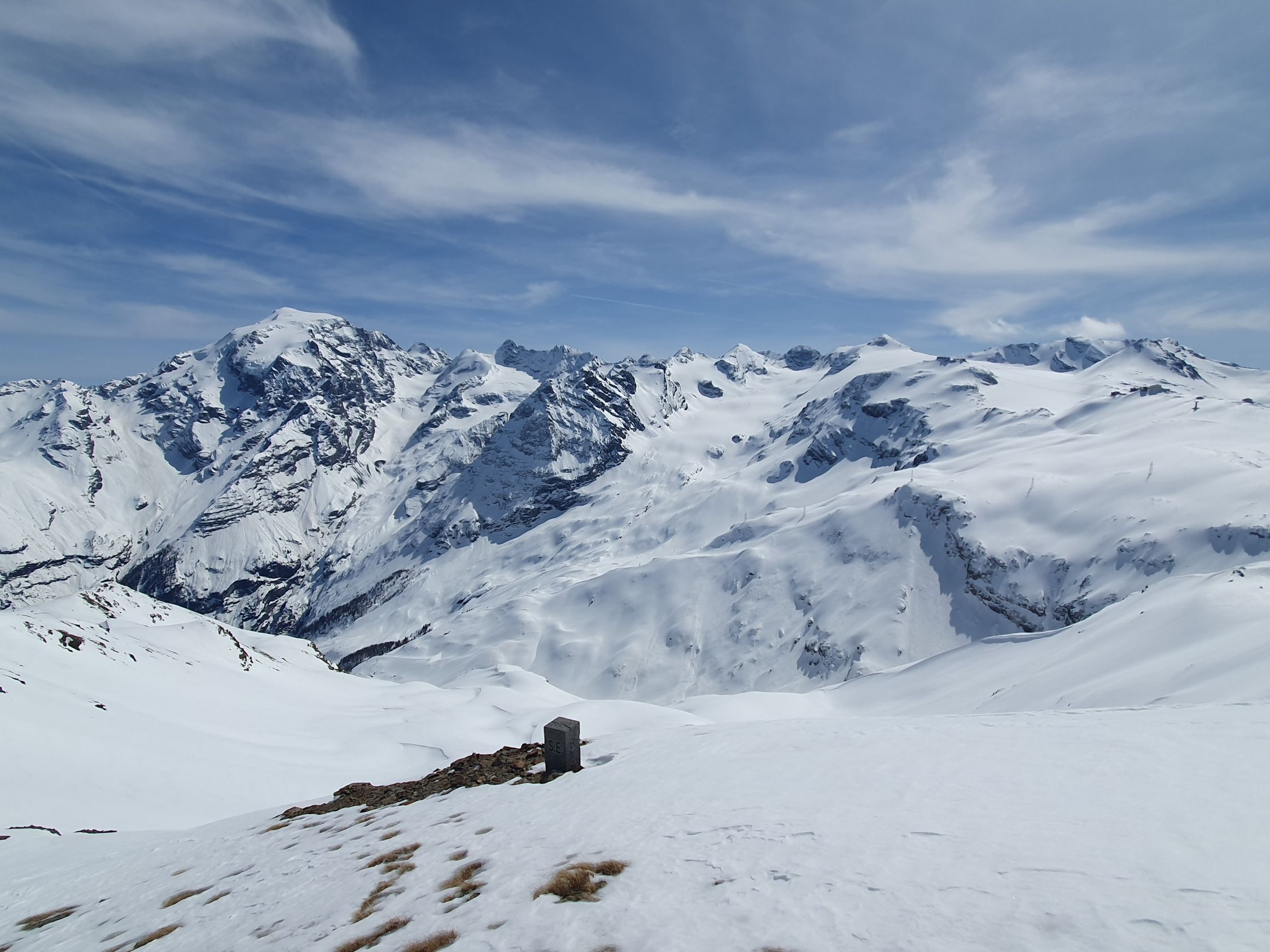 Ab P2845 habe ich den Pitschen-Chantun südlich traversiert, um möglichst direkt den Pass Umbrail zu erreichen. Ohne Stöckeln ging es aber doch nicht. Ab dem Pass ging es sehr langsam hinab ins Val Muraunza. Weiter unten muss man über gewaltige ältere Nassschneelawinen traversieren, um die Blockhütte wieder zu erreichen. Die ÖV-Stange "Sta. Maria Val M. Val Gronda" ist wegen einem Riesenrutsch total verbogen und muss wohl im Sommer ersetzt werden...