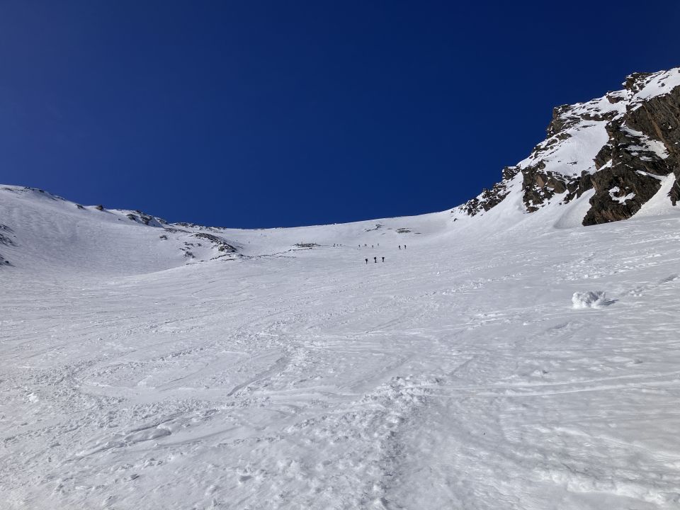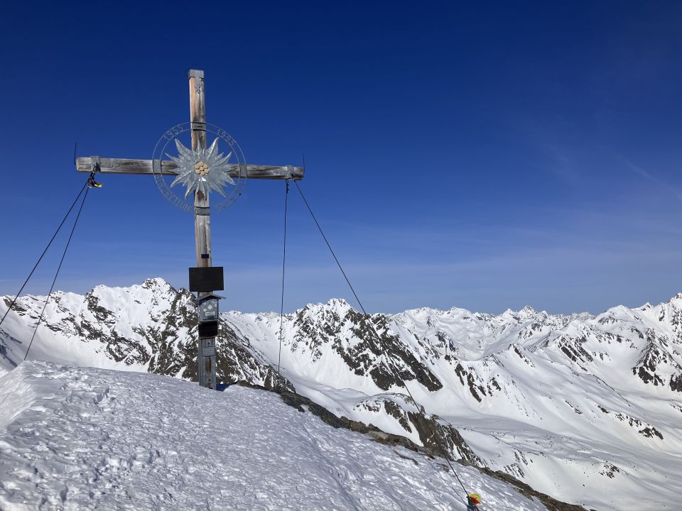 Start in Praxmar noch in der Dämmerung, Ski können kurz nach dem Gasthof bereits montiert werden. Aufstieg bretthart bis ca 2400 m, danach leichte Pulverschneeauflage. Fussaufstieg hart, aber gut zu gehen. An der Felsstelle Kette frei. Abfahren ab 9:45 Uhr heute perfekt, oben angefirnt, unten schon leicht sulzig, aber schön, später wäre unten Sumpf gewesen.