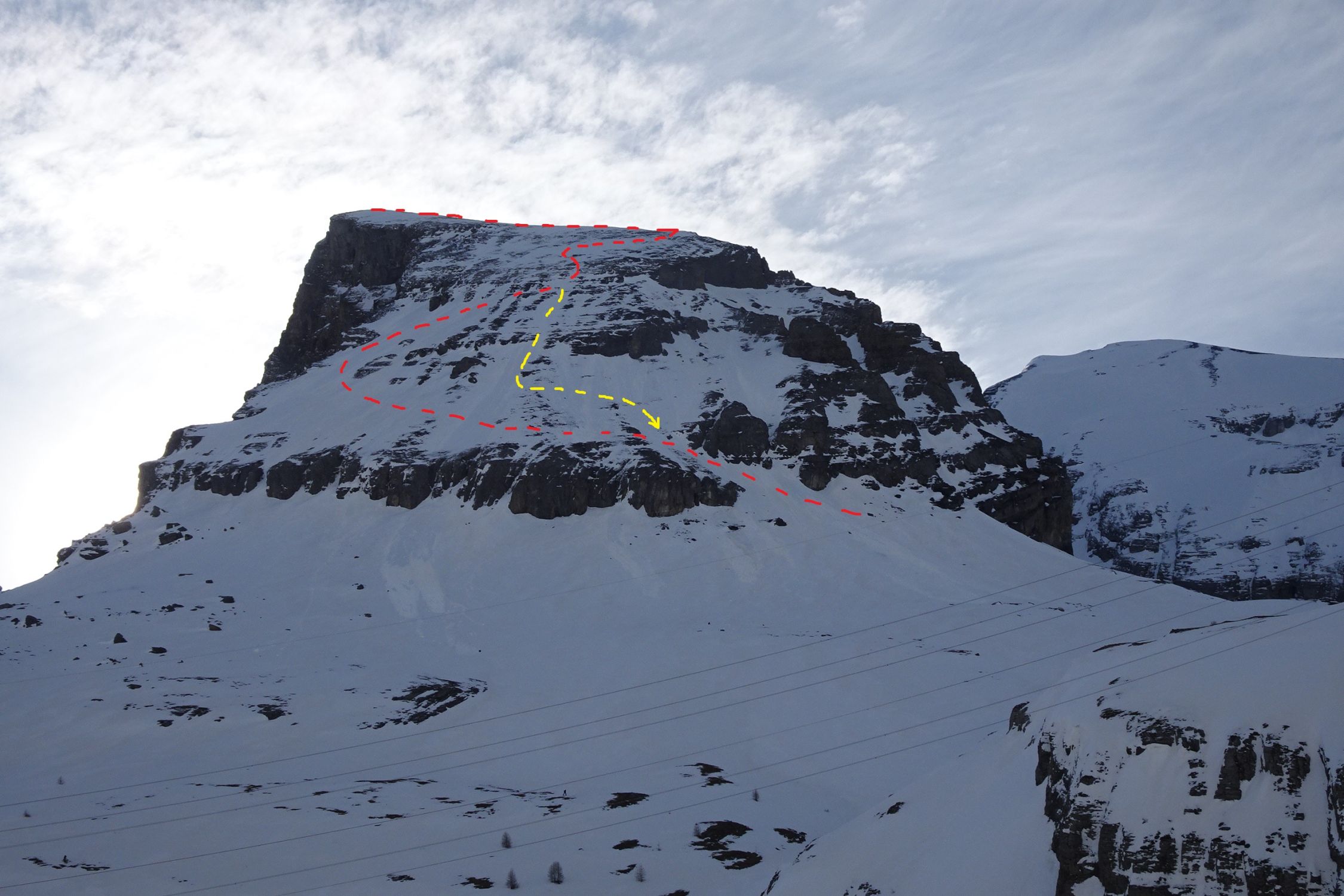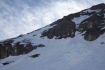 Zurzeit bombensichere Verhältnisse in der durchgehend 35-45° steilen, ausgesetzten Westflanke (Lawinen trocken/nass).