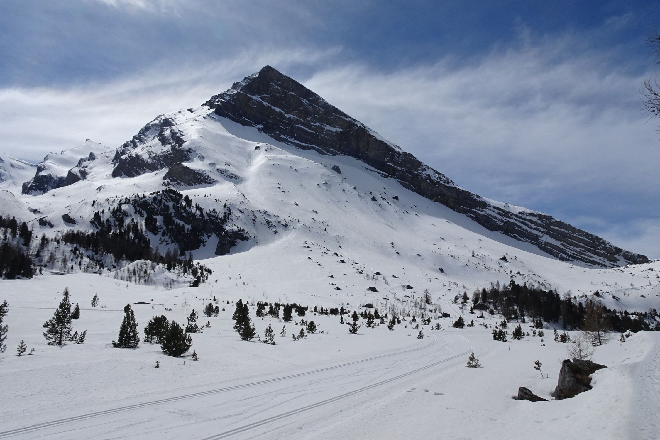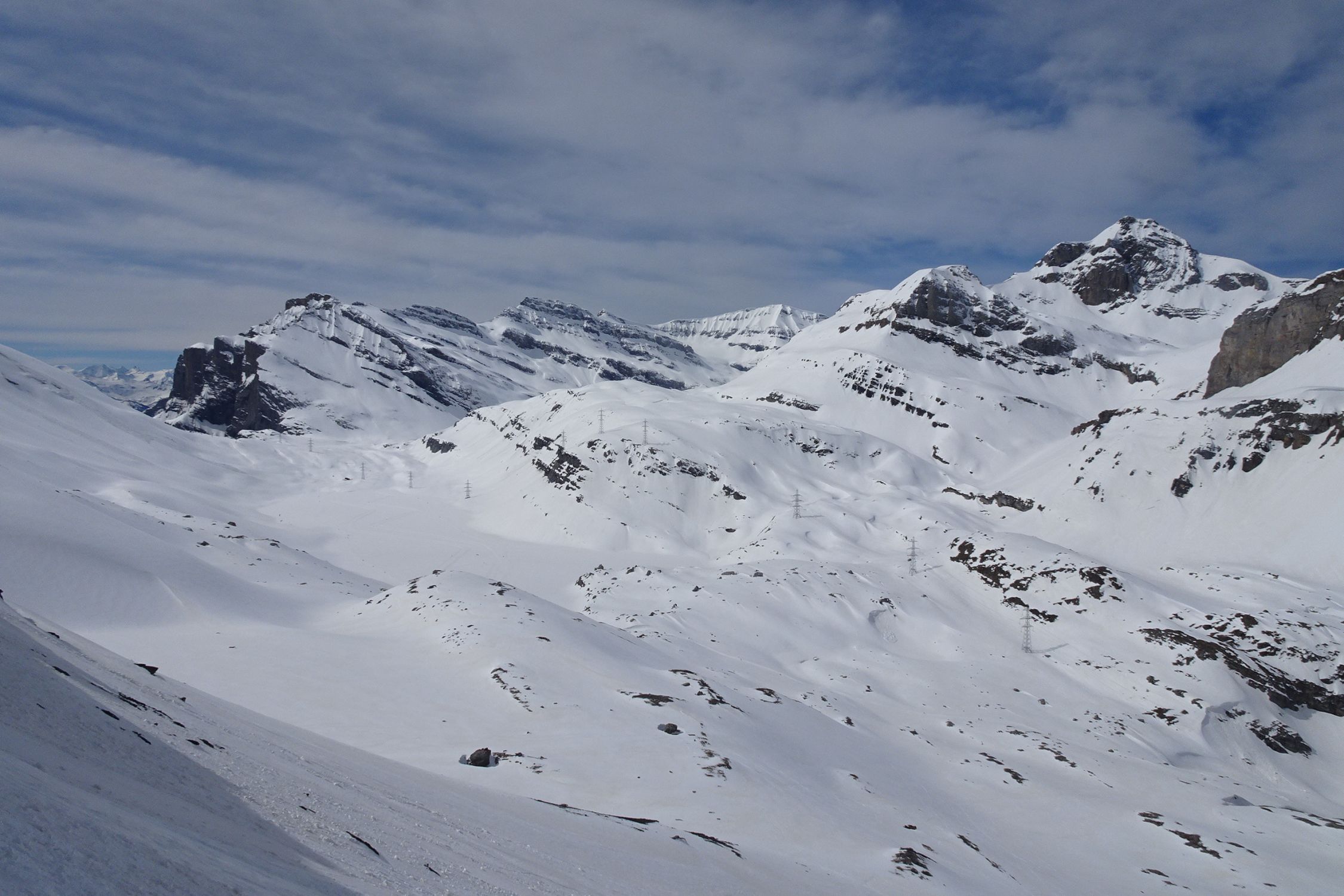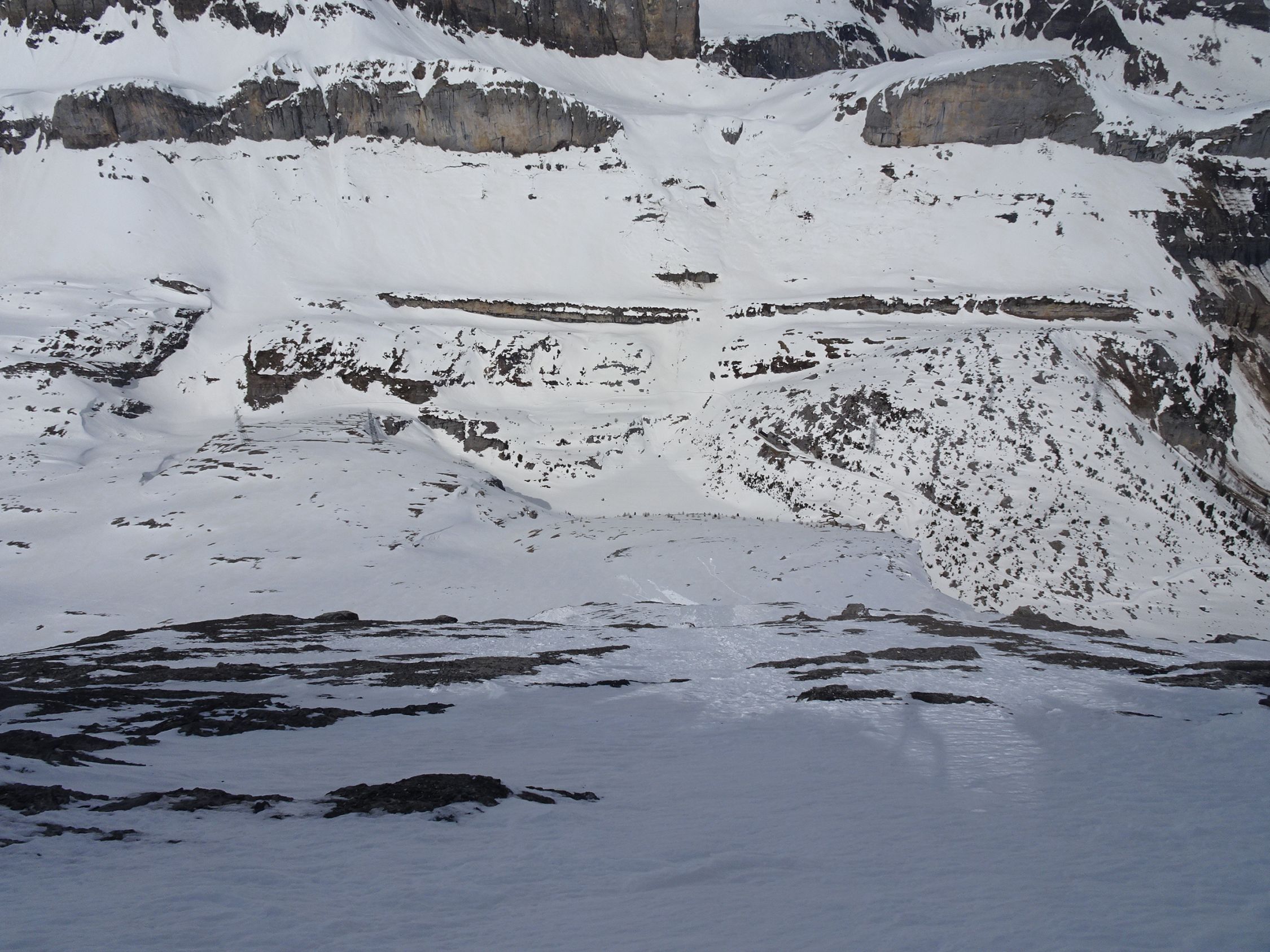Von unten nicht unbedingt zu glauben, aber ich habe Aufstieg und Abfahrt durchgehend mit Ski absolviert. Vor Ort fand sich immer wieder ein Schneeband. Das bedingt insbesondere im Aufstieg einwandfreie Technik. Stürzen ist an den drei Schlüsselstellen verboten. Im unteren Bereich, dort wo gestern Nassrutsche abgingen, vereiste Stellen: heikel. Sonst meist griffig und erstaunlich gut zu gehen. Bei der Abfahrt um 11:45 war in der Westflanke nicht mal ansatzweise Firn vorhanden, nach der Ausfahrt bis Schwarenbach schöner Sulz. Dank Wanderweg/Loipe ohne Pflotsch retour zur Bergstation.
