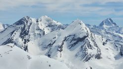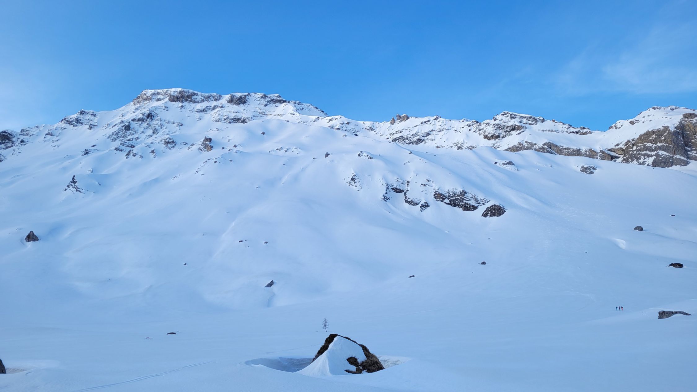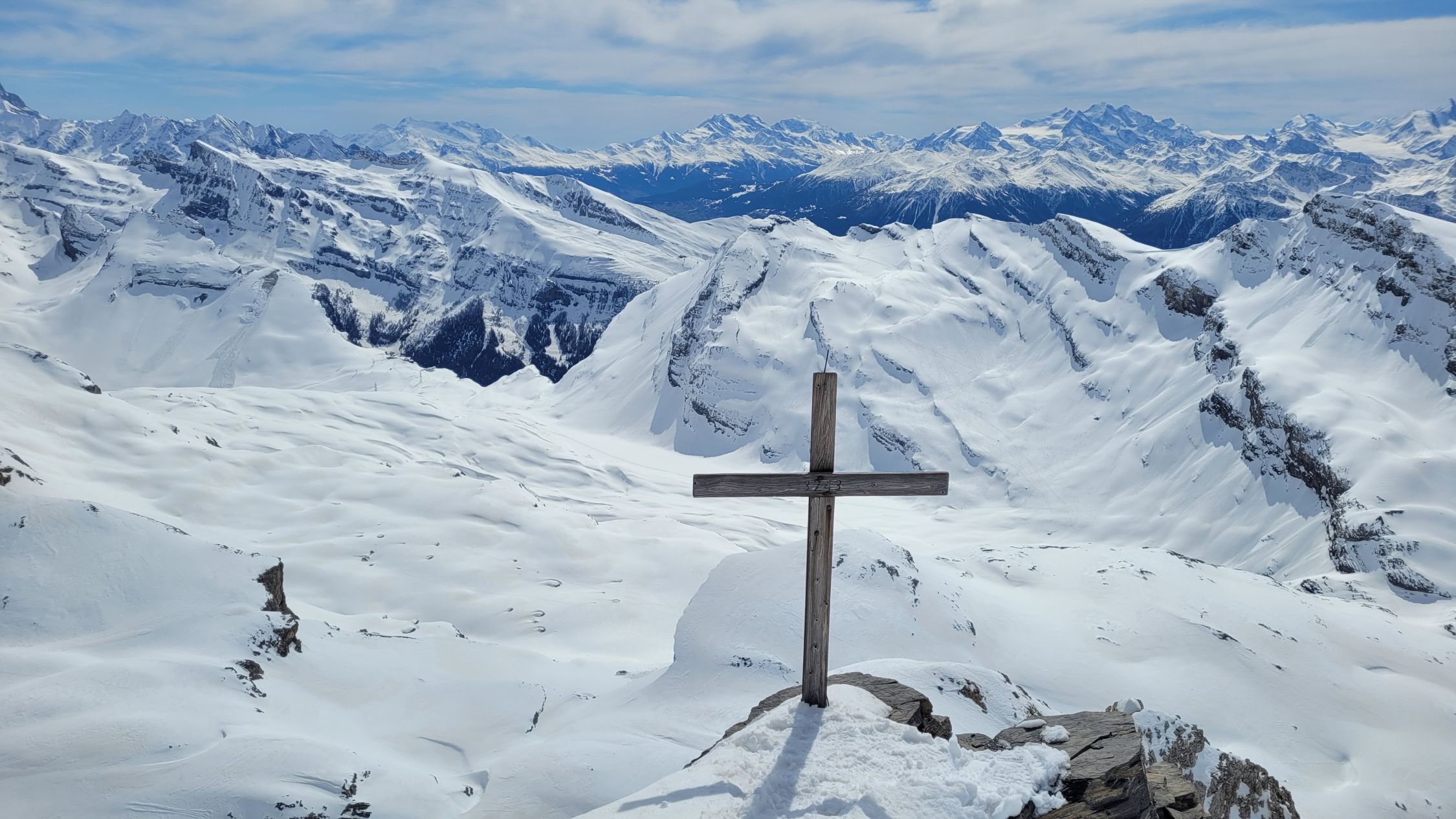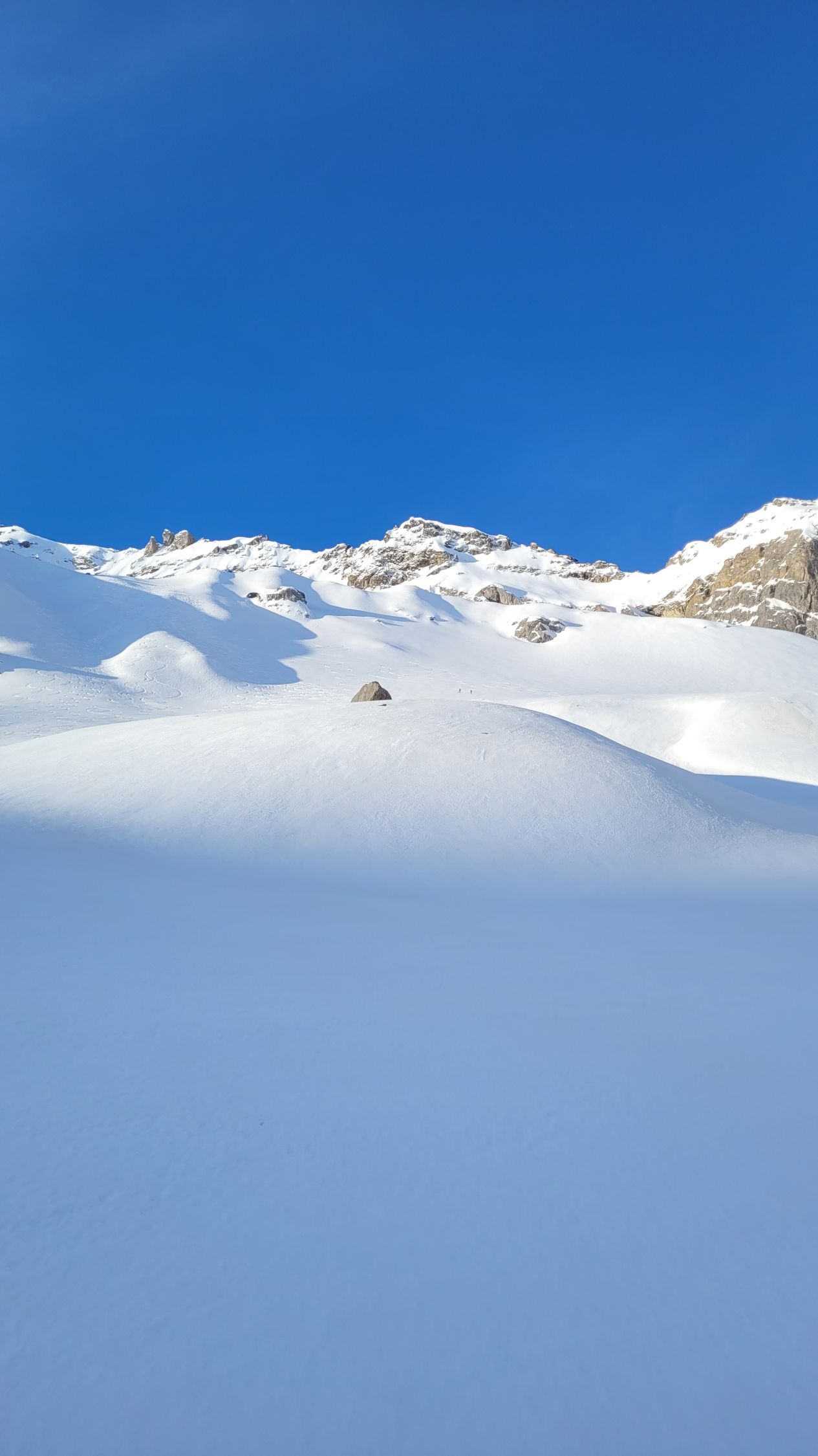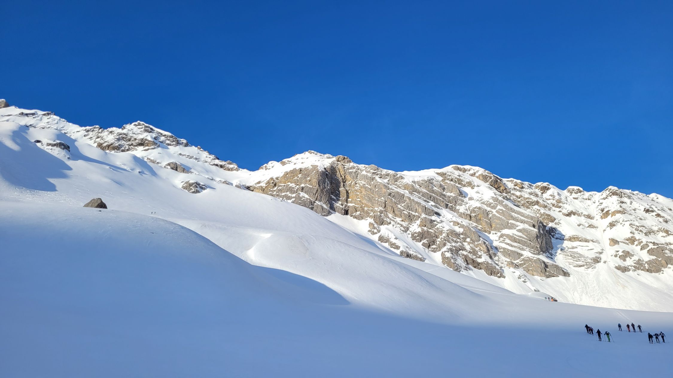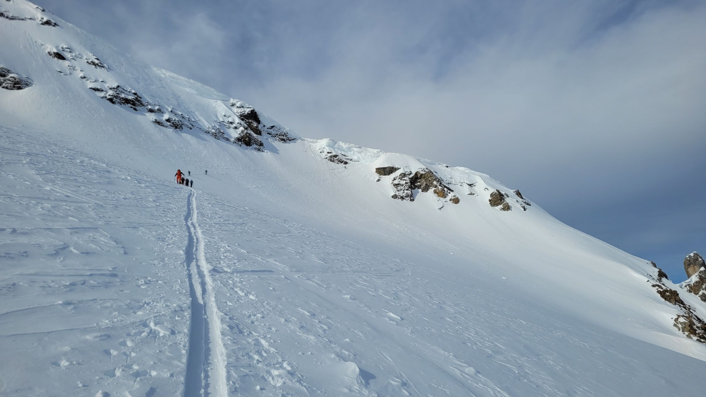 Frühstücksplatz, im Aufstieg mit Ski bis unter die Wächte, dann in gutem Trittschnee in wenigen Schritten hoch. Im Abstieg umgekehrt oder auch mit Ski möglich.