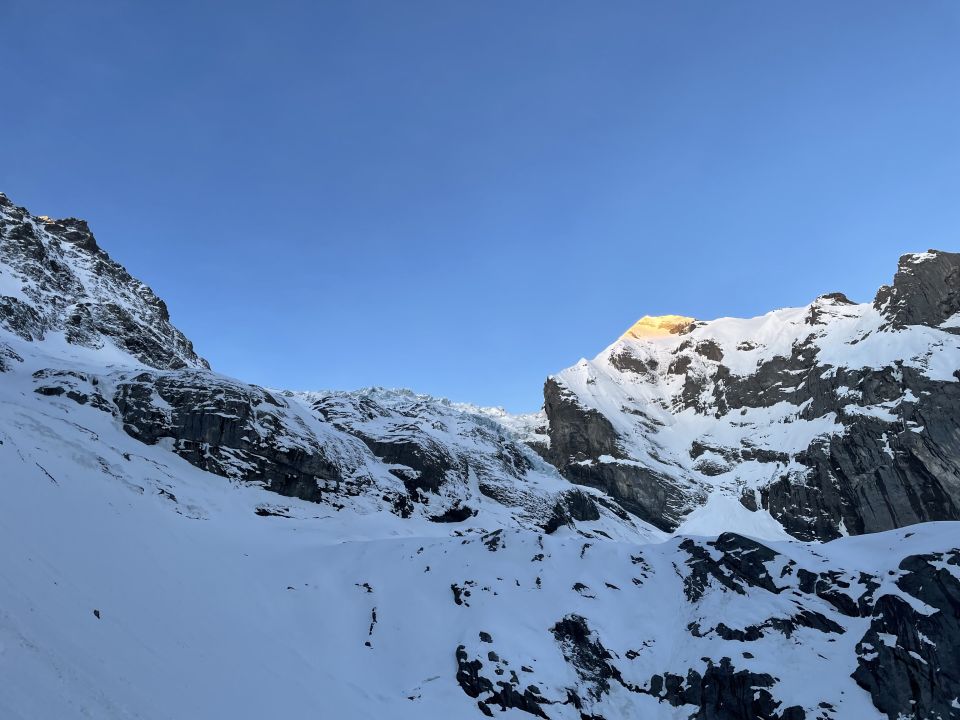 Ab PP Rosenlaui Portage durch aperen Wald. Schneedecke ab hindrem Gletscherhubel, zt mit groben Nassschneerutschen aus der Westwand der Engelhörner. Gute griffige Spur; Schnee nur teilweise gefroren bis ca 2500müM, jedoch tragend. Danach Presspulver. Austiegsspur dem Tossen entlang. Gletscher gut eingeschneit. Viel Betrien ab Wettersattel am Wetterhorn. Mit Südostexpo am Wetterhorn um 10 Uhr tiefe Trittspuren. Westflanke Mittelhorn uneinladend abgeblasen, zt blank, trotzdem gute Spur im Presspulver; ohne Harscheisen. Dank an die Vorbegeher. Skidepot auf ca 3600müM; Grataufstieg mit Pickel/Steigeisen,