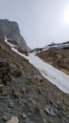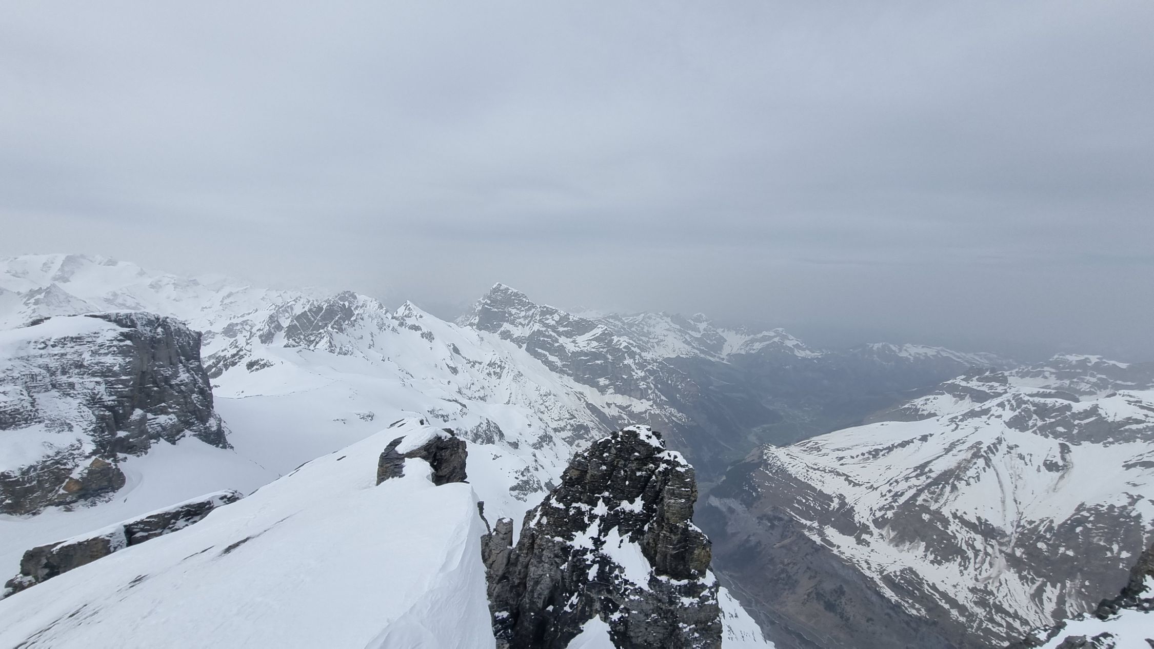 Genügend Schnee ab Hütte, aber erst ab ca 2500m tragend gefroren. Etwas Wind im Aufstieg, oben aber windarm. Fussaufstieg gut, erste und 3. Steilstelle können im guten Trittschnee bewältigt werden. Sicht zunehmend eingetrübt wegen Saharastaub. Warm.