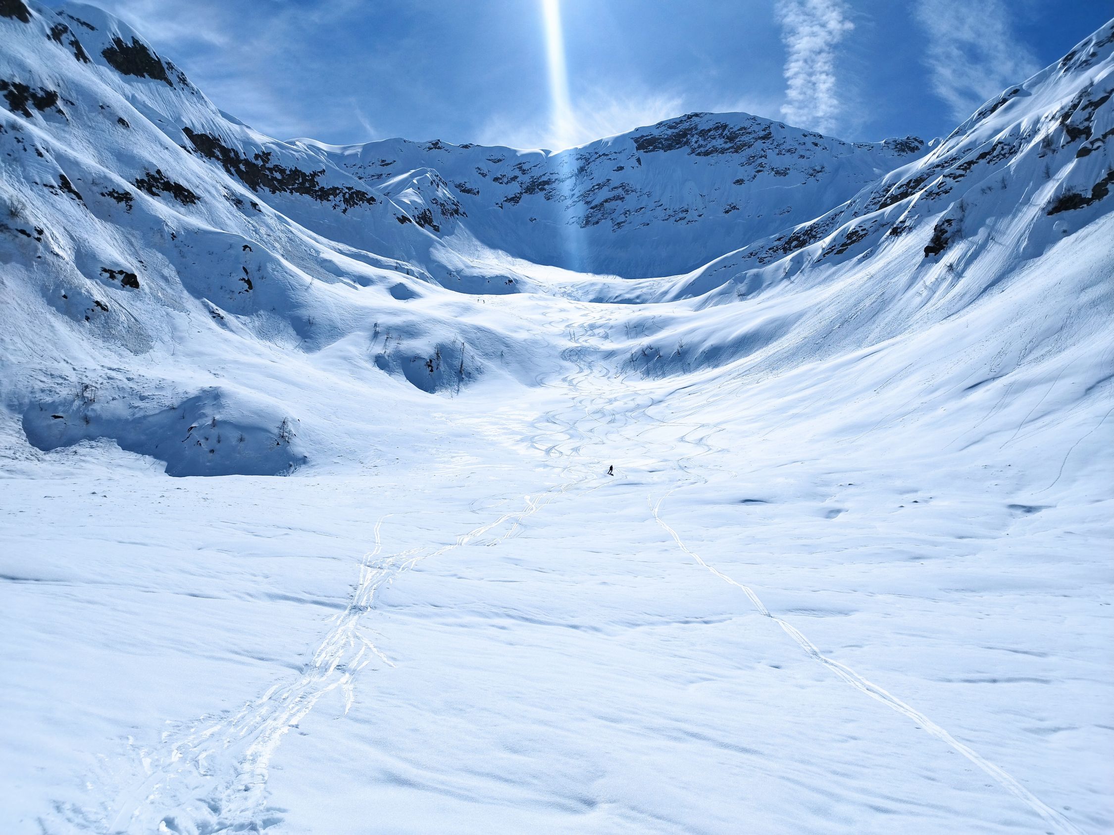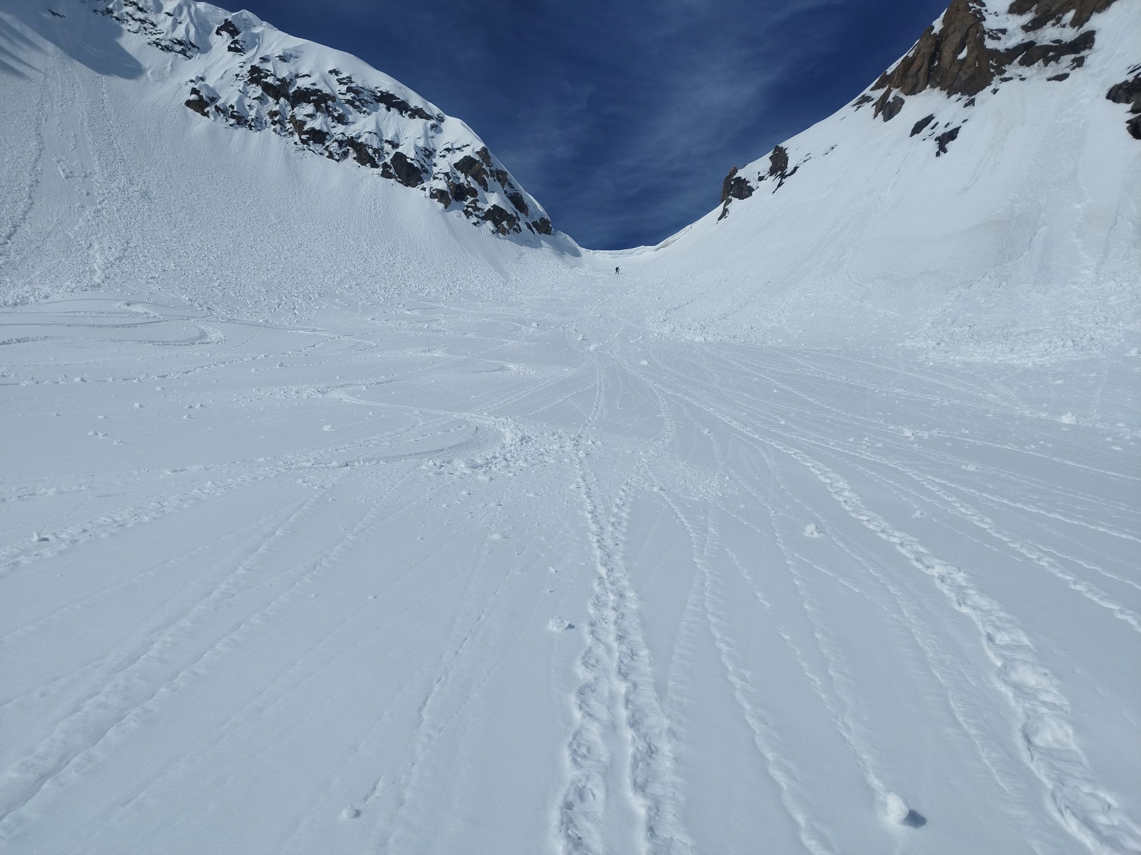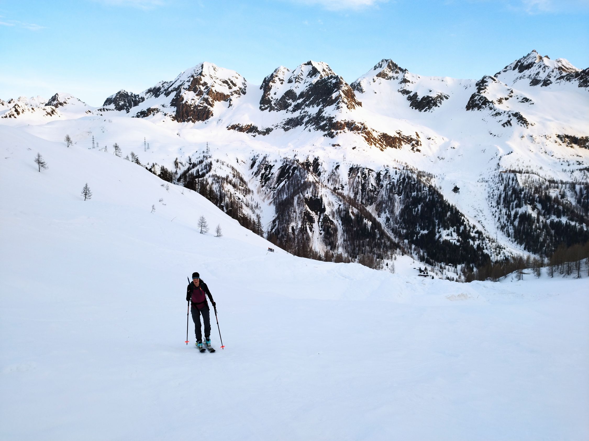 Wir sind zum Sattel gestiegen und haben versucht, die Wechte zu besteigen, aber das Schnee war recht nass und hat nicht gehalten. Deswegen haben wir das Gipfel ausgelassen. Abfahrt durch die Val Piana im feinsten Sulz bis P. 1883. Es gab danach mühsames Bremsschnee auf dem Wanderweg nach Selva.