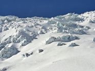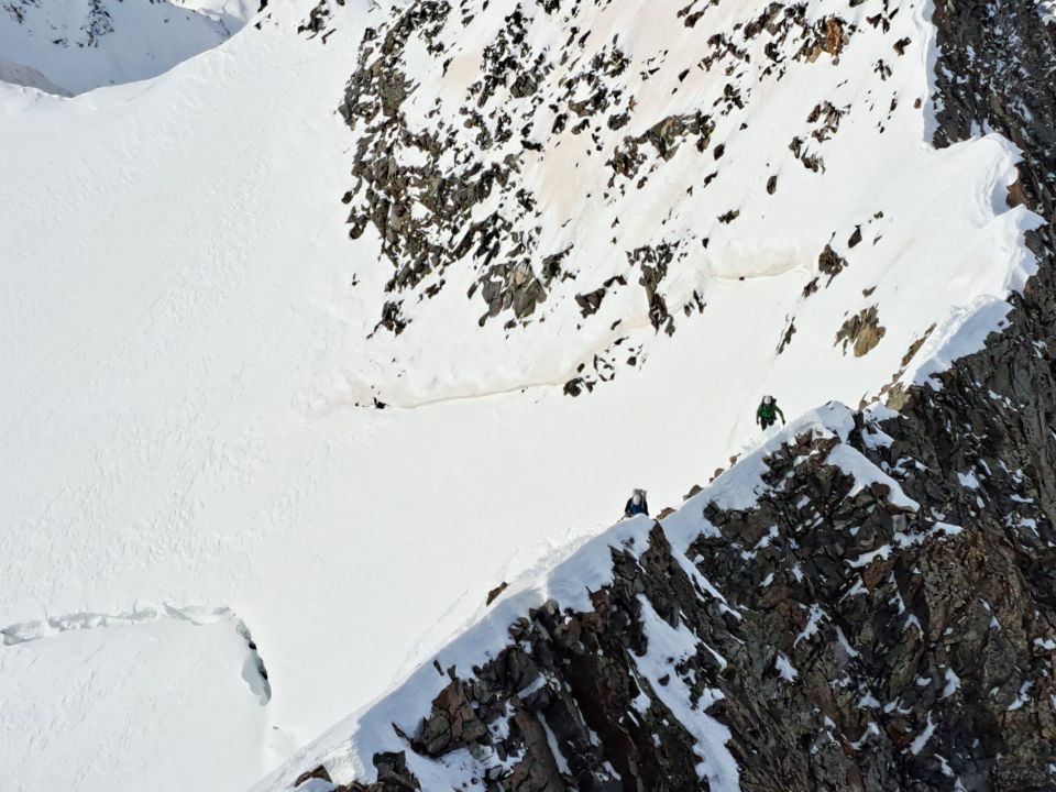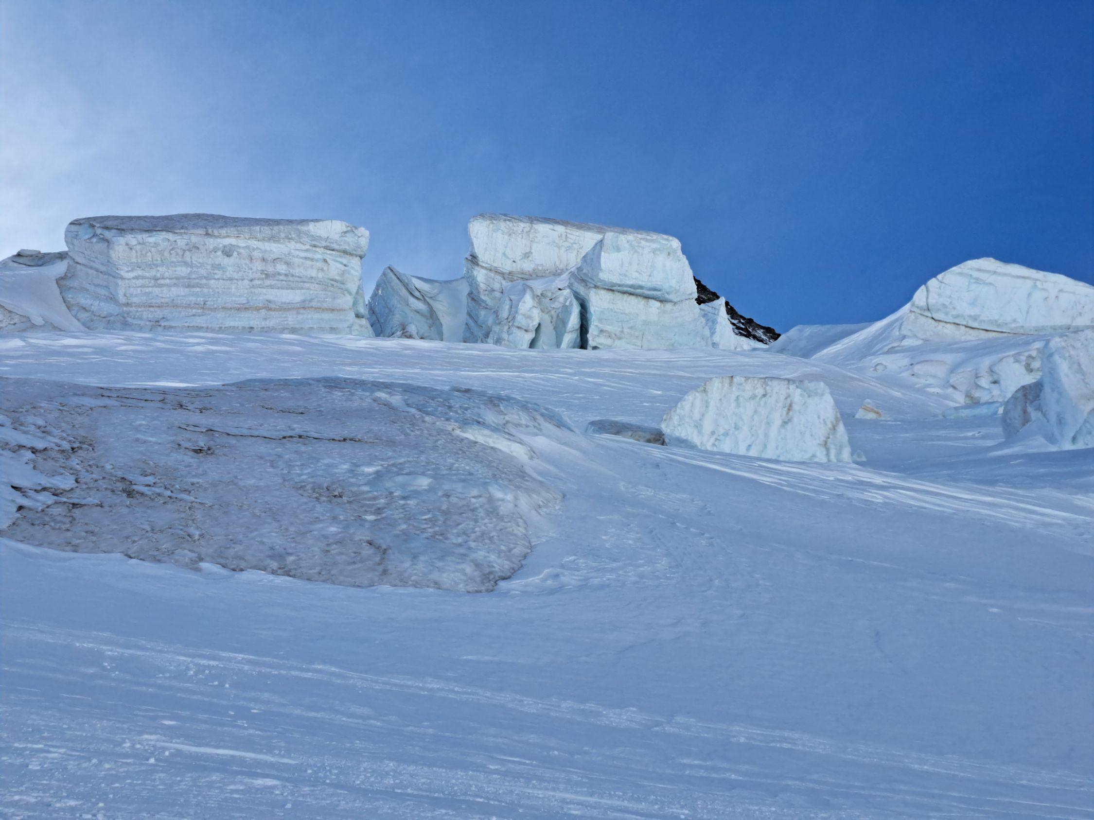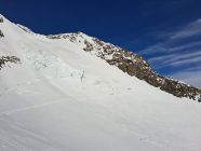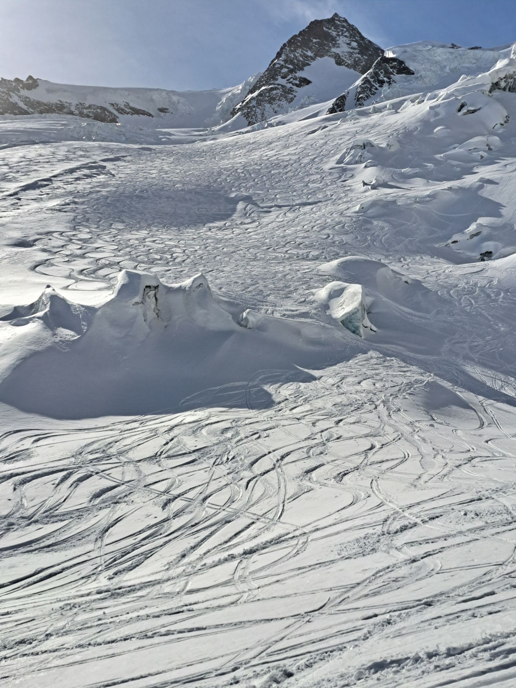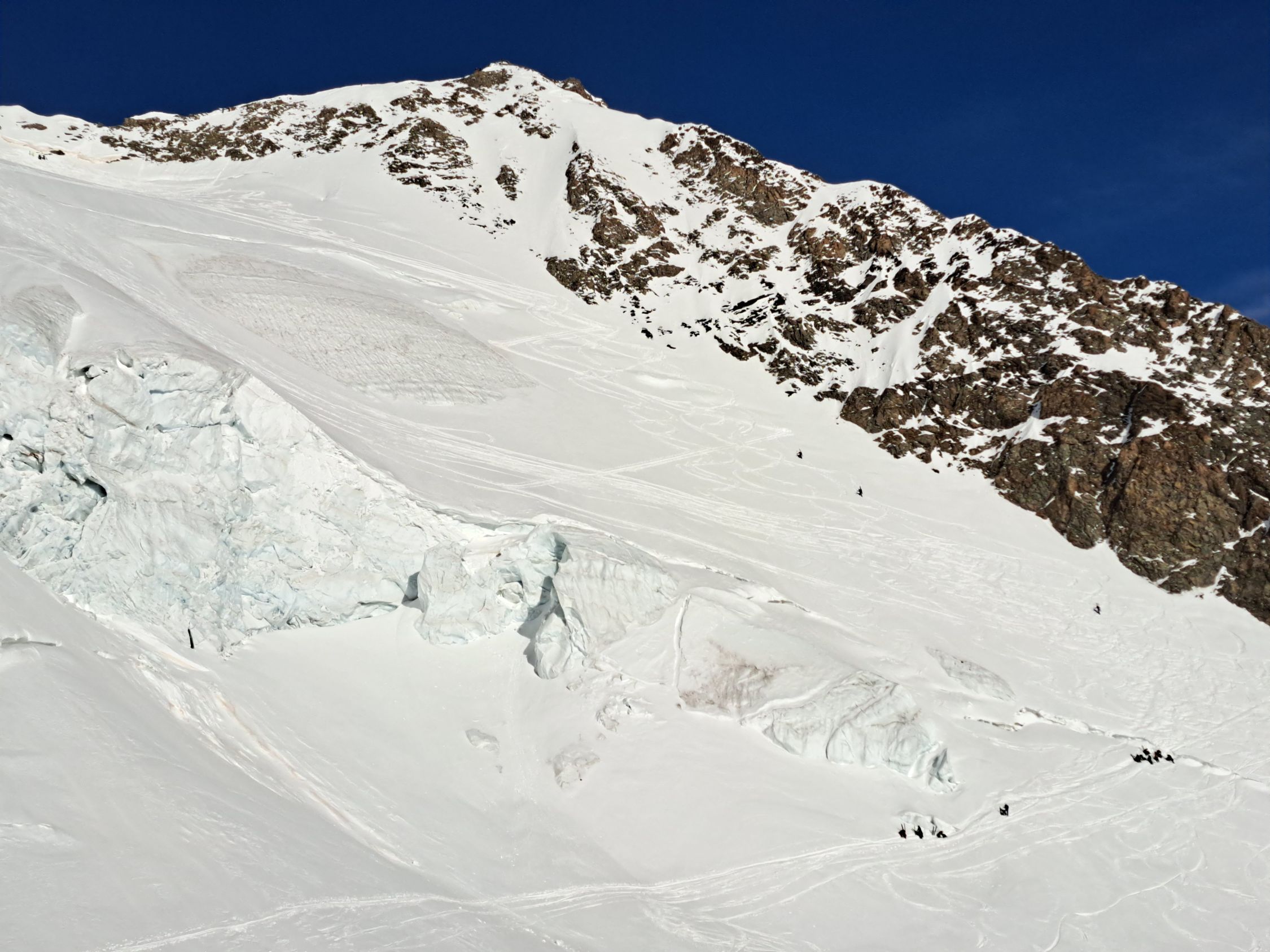 Durch die großen Schneemengen sind kaum Gletscherspalten sichtbar. Noch ist die Abfahrt bis Morteratsch Bahnhof gut möglich.