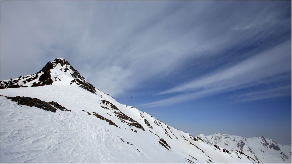 Bis etwa 2100m ist die Schneedecke stark durchnäßtman bricht teilweise bis zuem Boden durch. Danach ist die Schneedecke zunehmend tragfähiger aber relativ zerfurcht vom Vortag. Gipfelanstieg gut zu gehen, eigentlich kann man sogar bis zum Gipfel mit Skiern (rachts außen rum). Geht aber auch gut zu Fuß.