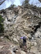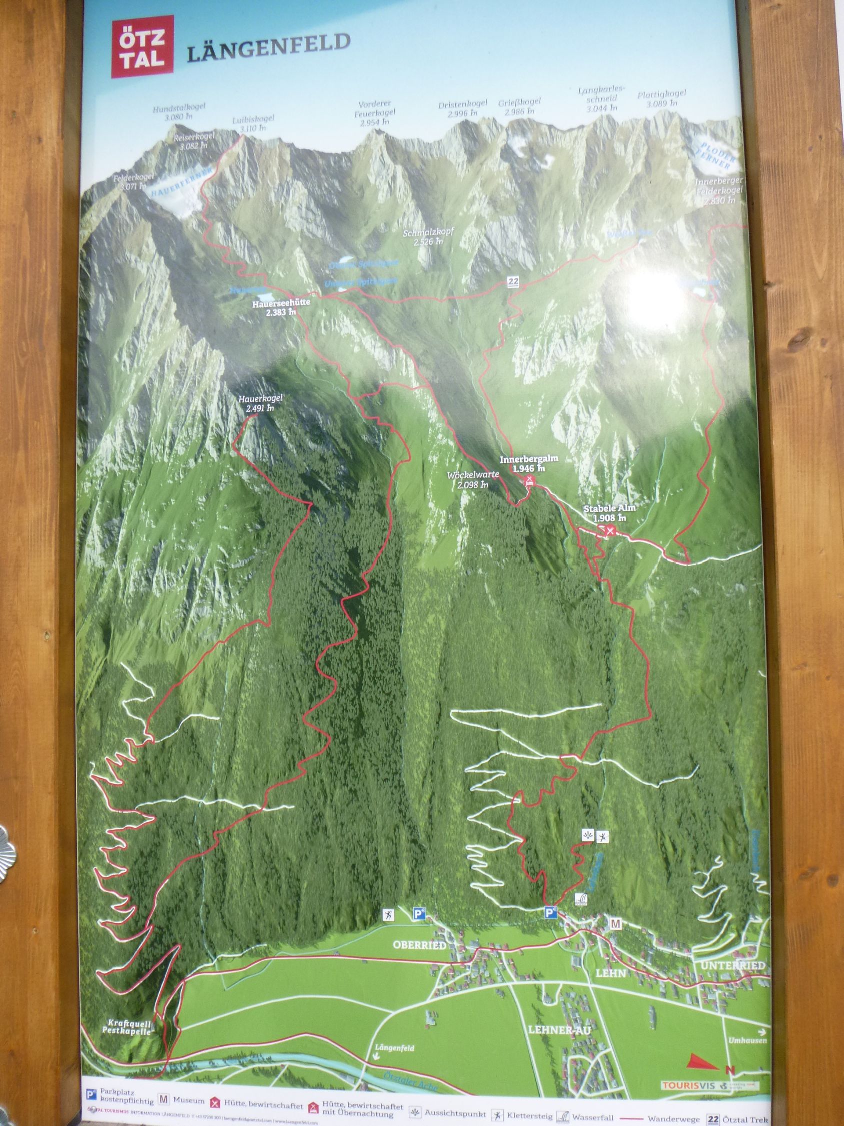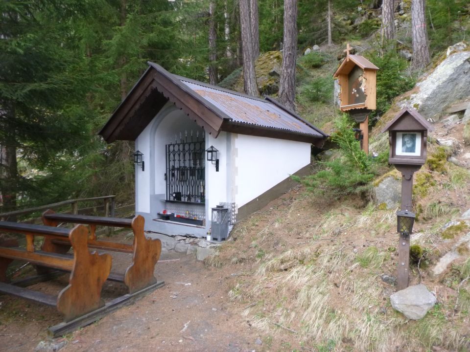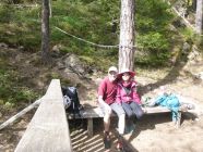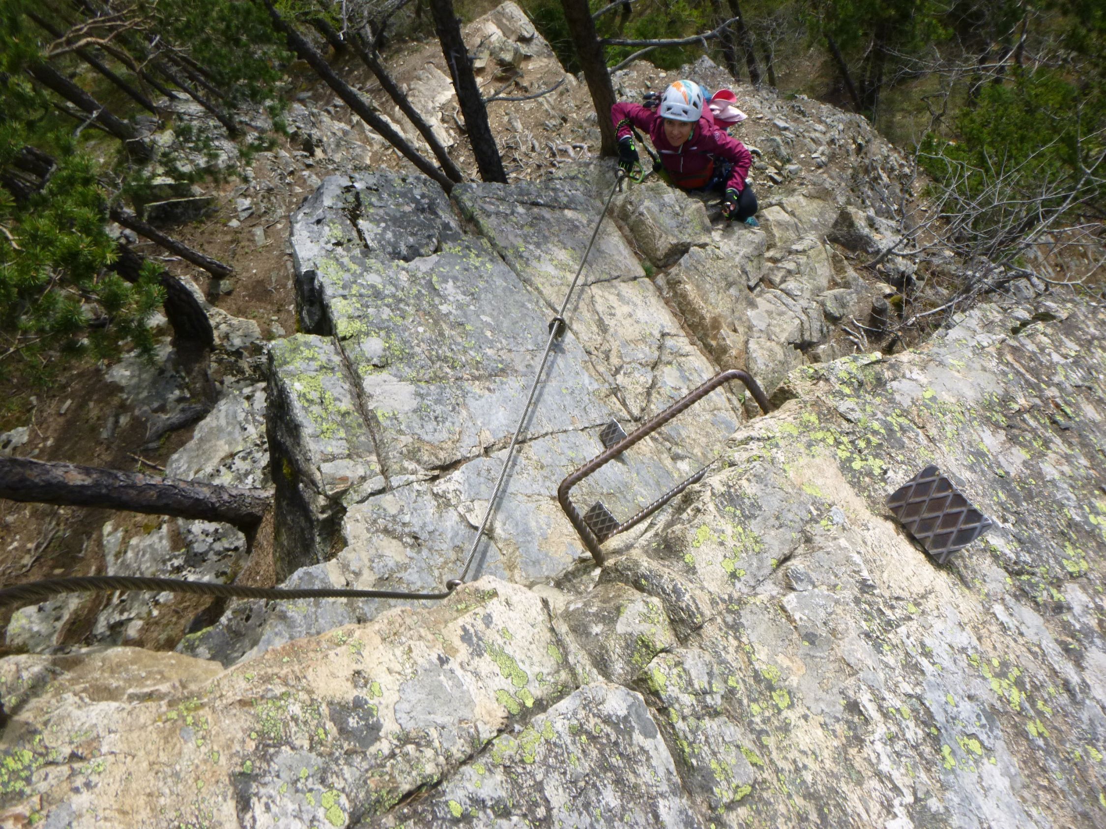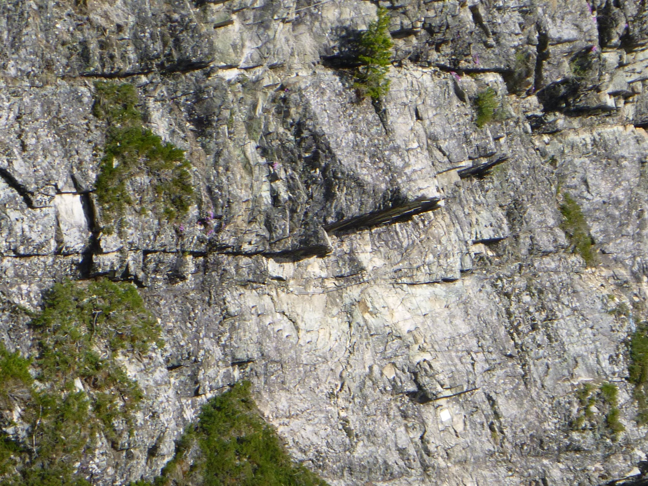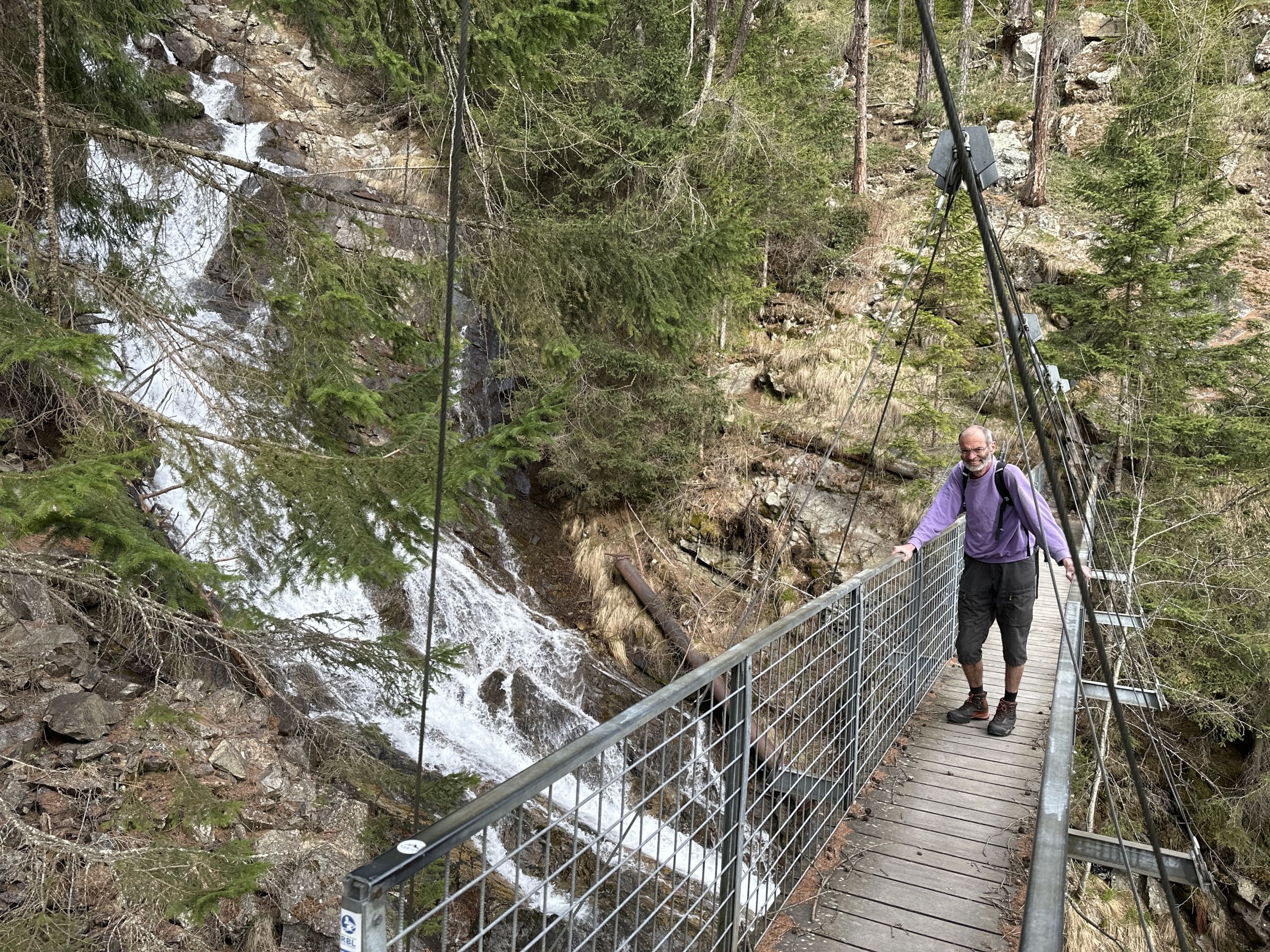 Nach uns kamen an der Wald-Kanzel mit dem Ausstiegsbankerl 3 Senior-Kletterer aus dem Inntal an. Gab nette Unterhaltung dort. Anschließend wollten sie zum Schiestl-Steig. Ich fragte sie, warum der Stuibenfall angeblich (Internet-Auskunft) gesperrt sei. Der Älteste von ihnen (72) telefonierte und meinte danach, der wäre noch nicht gewartet. Und die Restaurants sind noch zu. Meinte aber, kann man gehen. Wir entschieden uns, dorthin zu fahren. Ich war vor 12 Jahren diesen Steig mal durchgestiegen. Schlimmstenfalls kehrt man um bei herausgerissenem Seil, oder Felsbruch. Die 3 sind den Stuibenfall-KS schon mal im Winter nachts gestiegen. Das Foto befände sich im dortigen Steigbuch. (Nachtrag: Die Box fanden wir leer vor.)