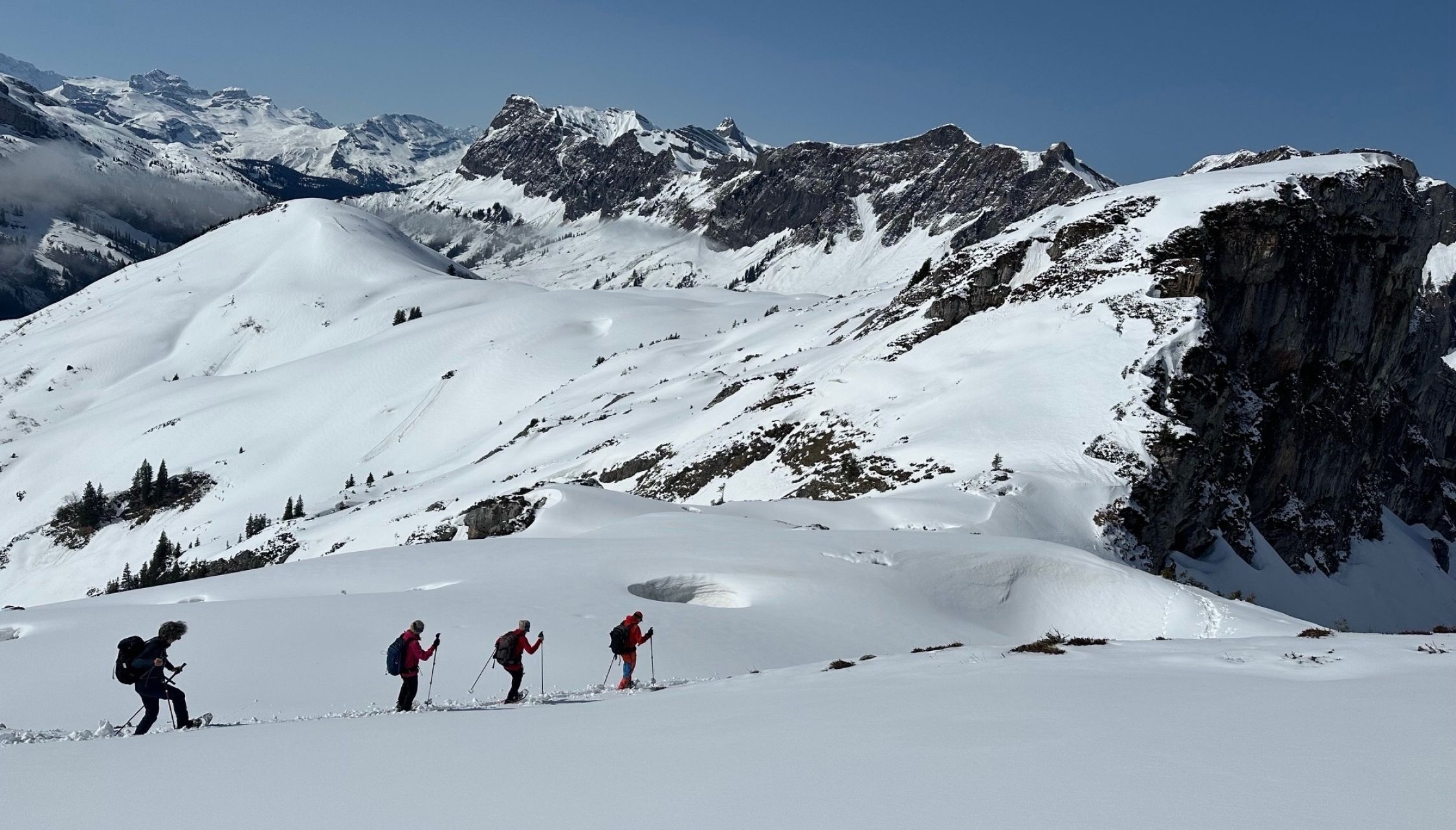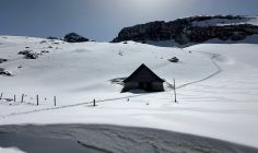 Ab. ca. 1300 Alt- und Neuschneedecke, ab hier Schneeschuhe unumgänglich. In den Nordhängen unterhalb des Übergangs noch reichlich Schnee (Presspulver)