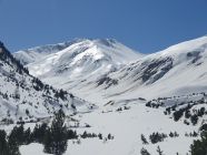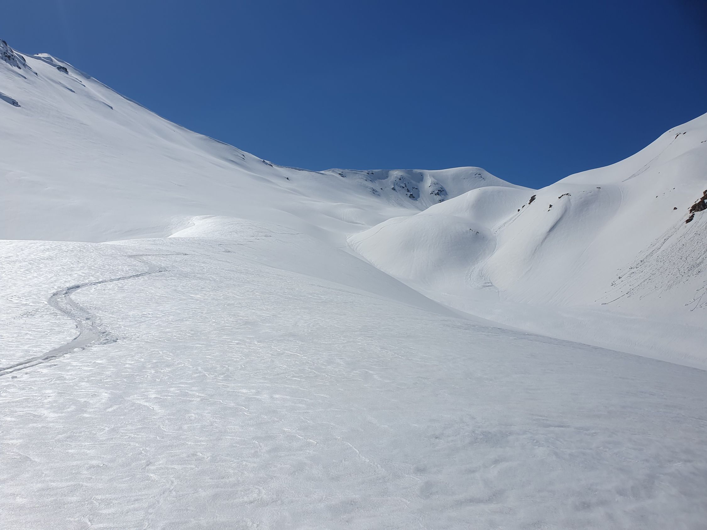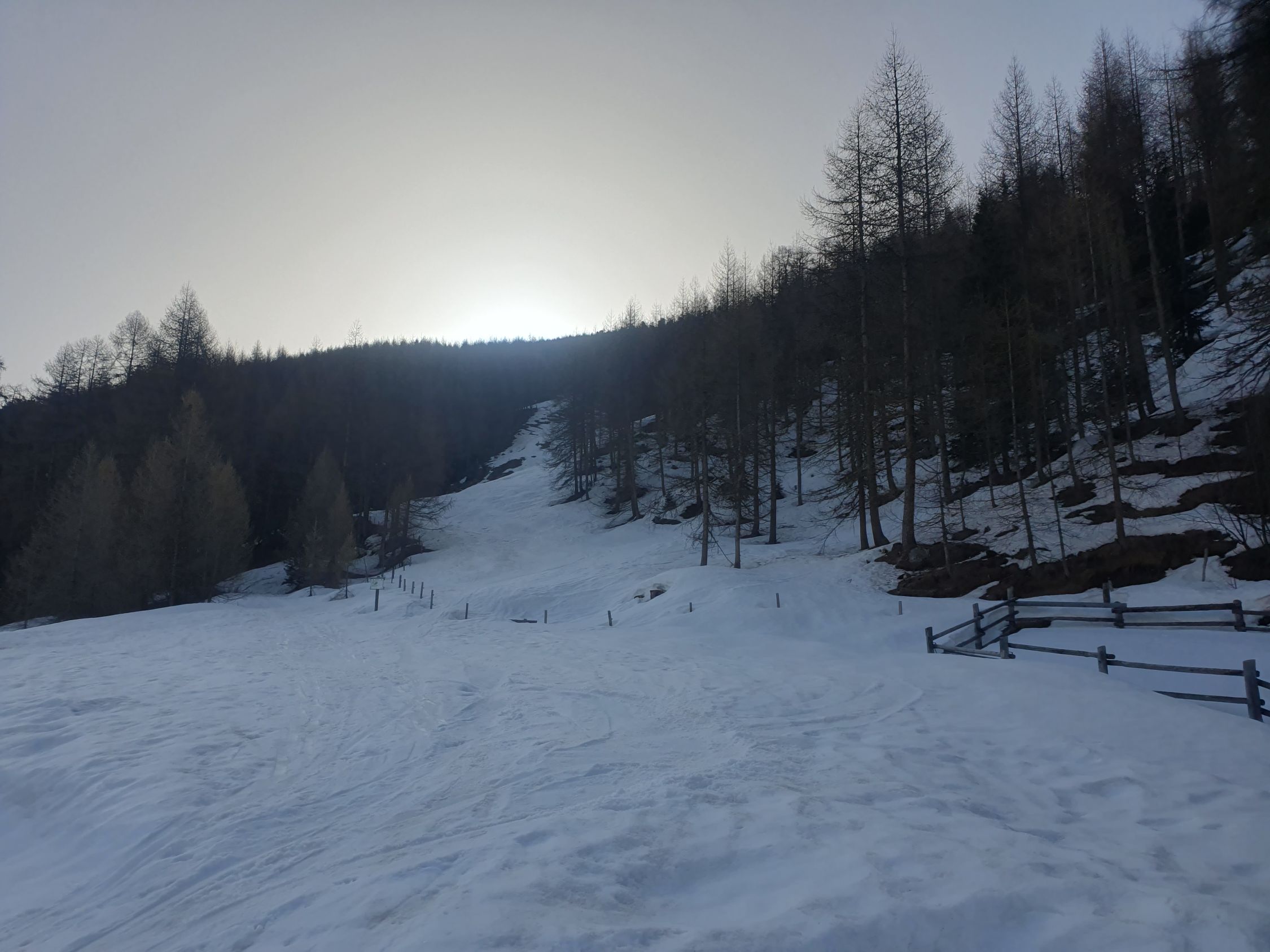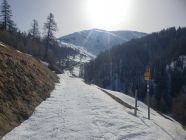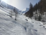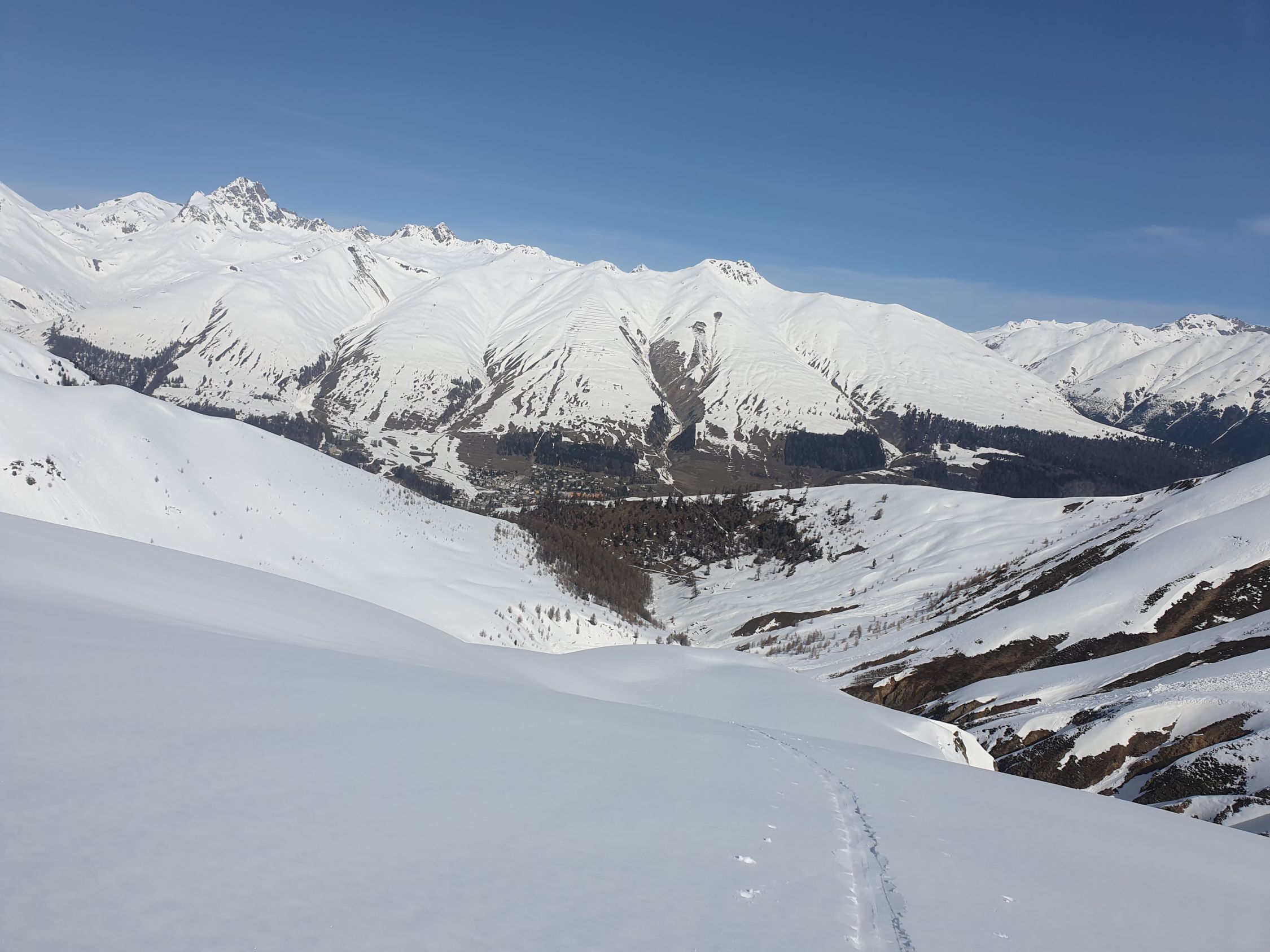 Ab hier ging es aus perfektem Sulz rassig hinab in die Valle del Leverone. Es ist wichtig, dass man den P2325 anvisiert und nicht nördlich in die Schlucht abfährt. Ab P2325 weiter auf tollem Sulz hinab in die Valle di Federia. Hier war, wie schon letzte Woche beim Munt Cotschen, die Abfahrt eher ein Krampf, da man nicht forwärts kam. Unterhalb von Muri ging es wieder flot hinab bis P1859. Ab da Skis tragen in 30 Min. bis zur Busstation von Livigno.