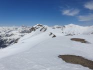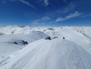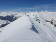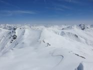 Nun bis P2856 abgefahren und wieder mit Skis unschwierig in 30 Min. zum Il Corn hochgestiegen. Auch die Abfahrt zur Fuorcla Vaüglia ging ohne Probleme. Beim il Corn muss nichts zu Fuss gemacht werden (Skitourenkarte hat hier 2 Punkte drinnen). Danach etwas steiler hoch zum namenlosen P2947 und wieder hinab zu P2877. Ab da auf dem schmalen Grat hoch zum Piz Vaüglia. Nach einer erneuten Abfahrt zur Fuorcla Chaschanella geht's via P2906 ebenfalls auf einem schmäleren Grat hoch in insgesamt 5 Std zum Piz Chaschanella. Kurz wieder zurück auf dem Grat geht's in südlicher Richtung hinab zur Fuorcla Chaschauna. Nun muss der P2917 westlich unten hochtraversiert werden, bis man die Fuorcla Lavirun erreicht.