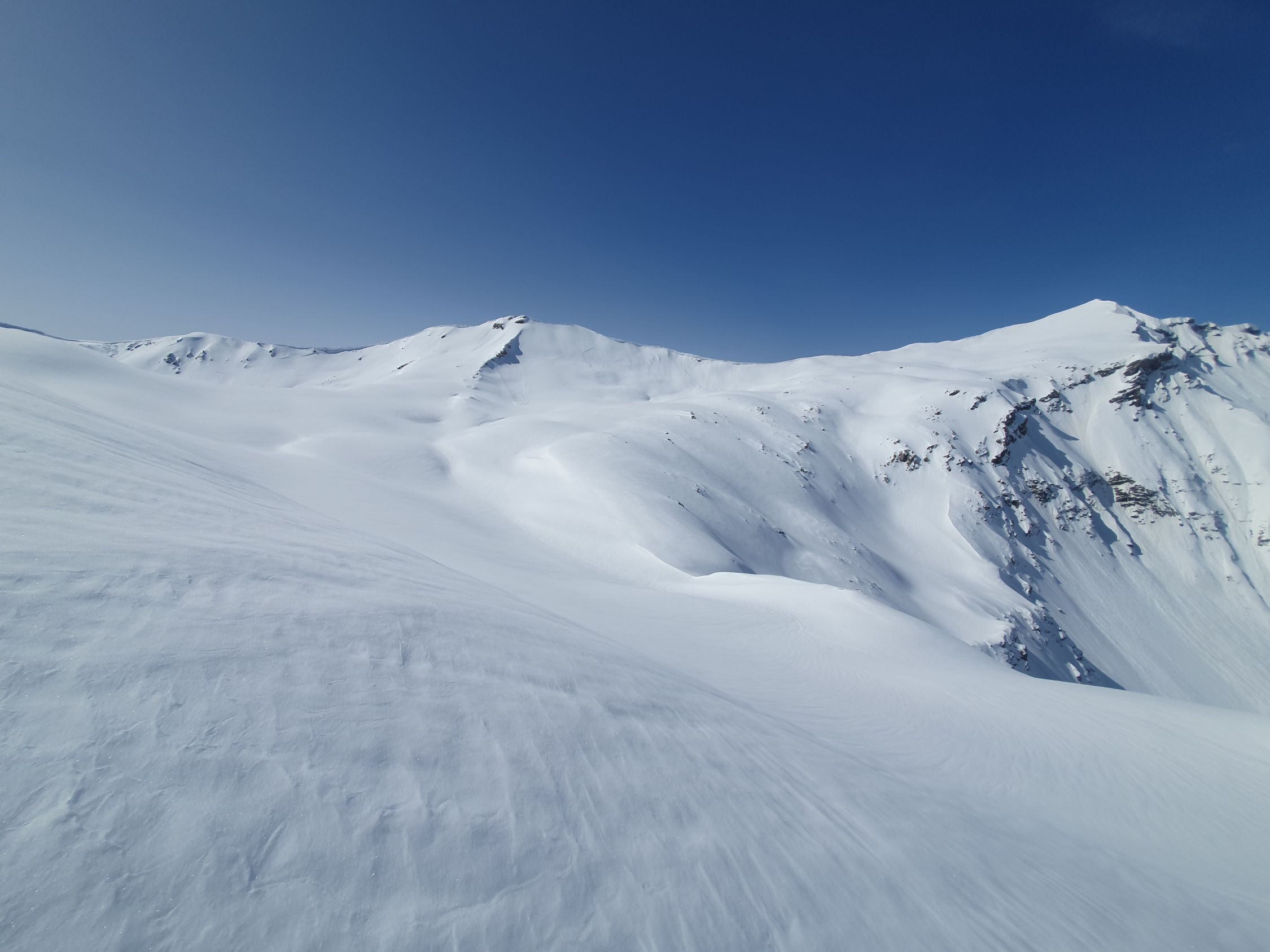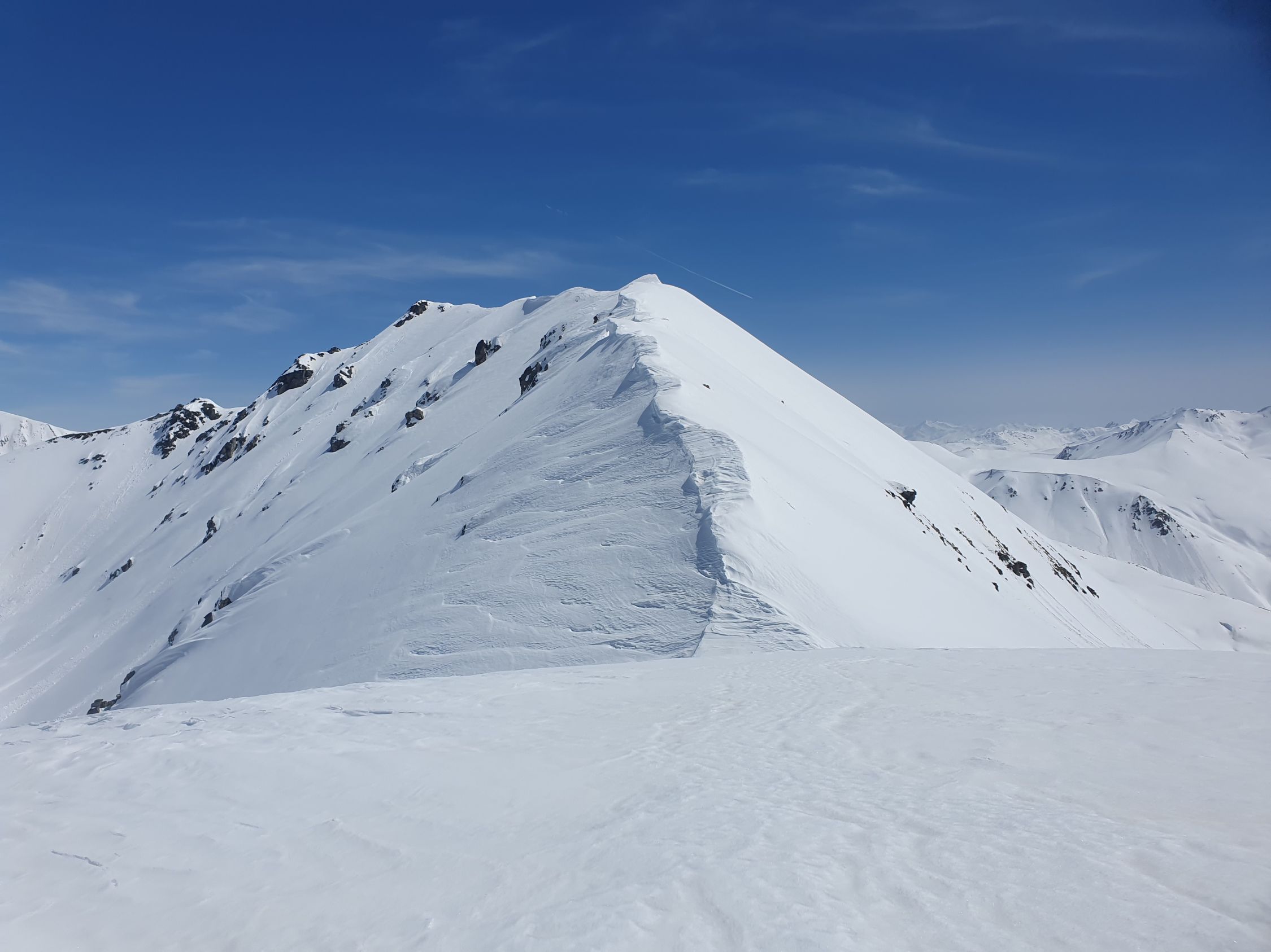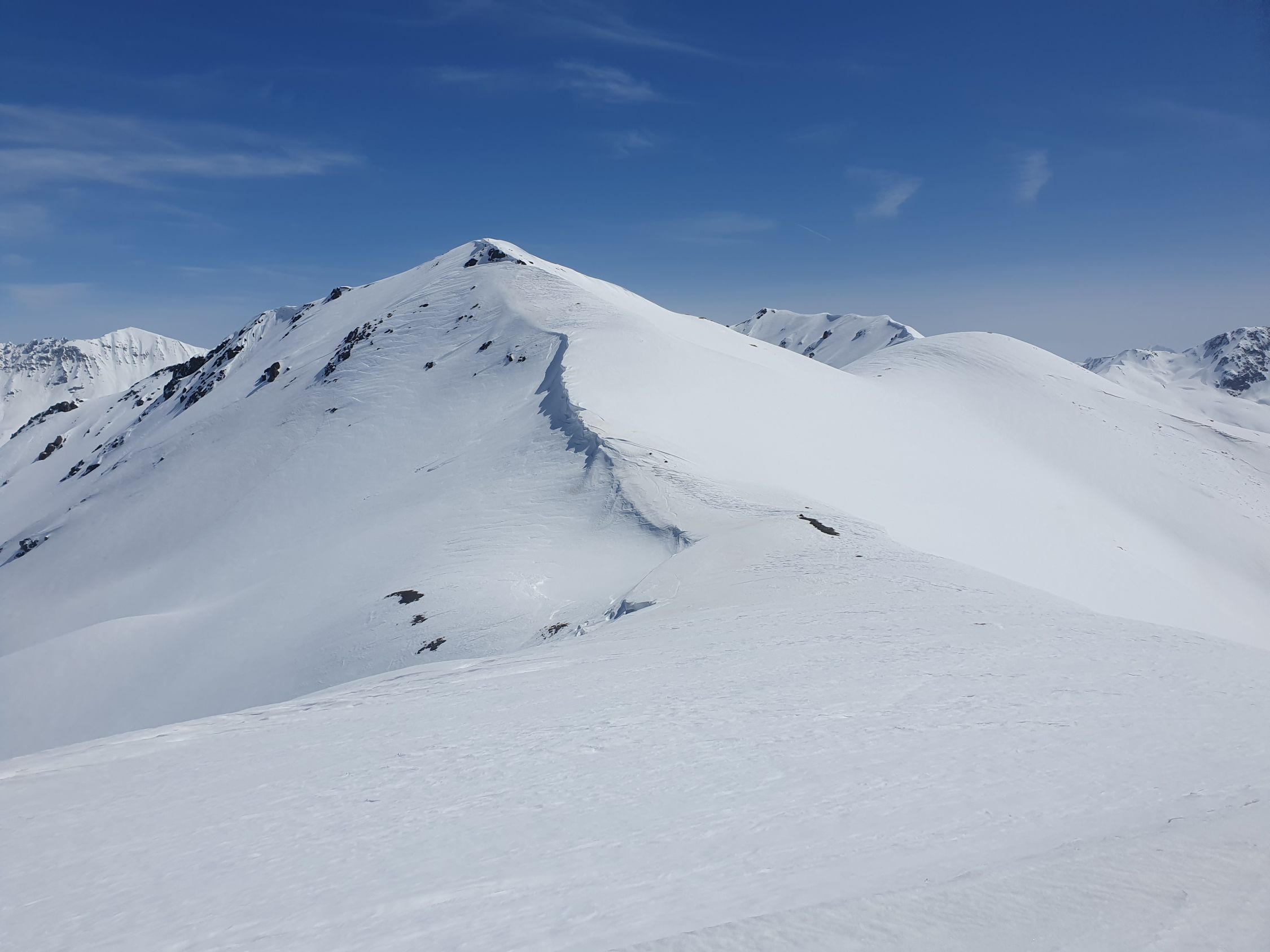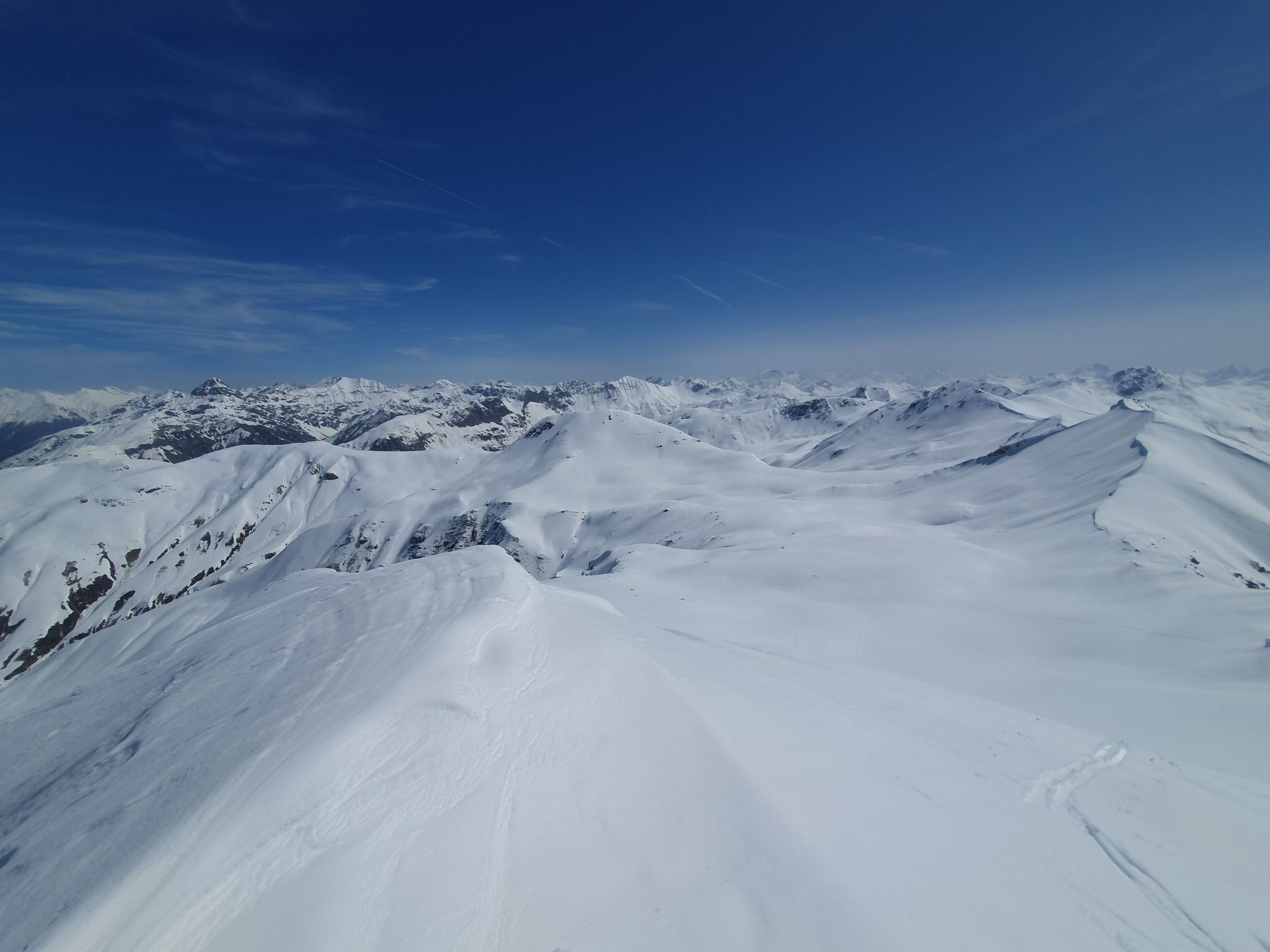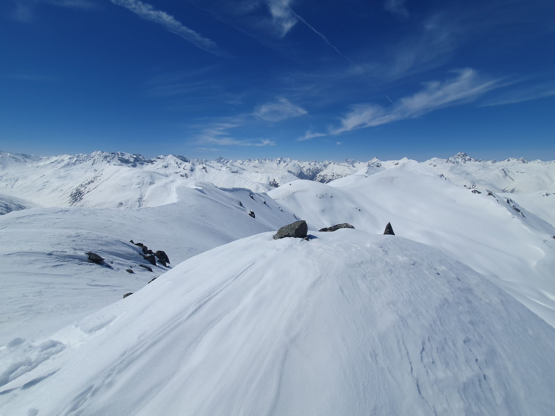 Die Überschreitung vom Piz Mezzaun Ostgipfel bis zum Piz Chaschanella ist im Winter eine Empfehlung wert. Ich wusste nicht, ob es überhaupt möglich war, aber der Versuch war geglückt. Der Grat ist auf der Winterkarte zwar nicht eingezeichnet, aber er ist einfach und lässt sich alles mit den Skis überqueren.