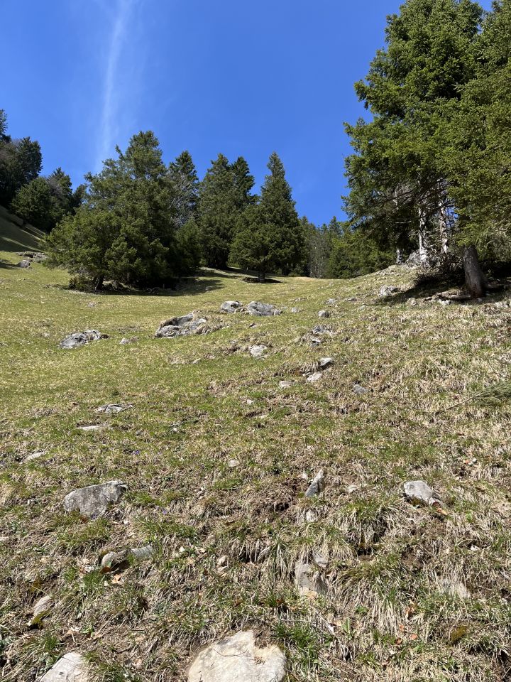 Abstieg via Blatti. Da dabei streckenweise auf dem Pfad auf die Nordflanke ausgewichen wird, bedecken Schneereste den Pfad. Diese können aber sicher gequert werden.