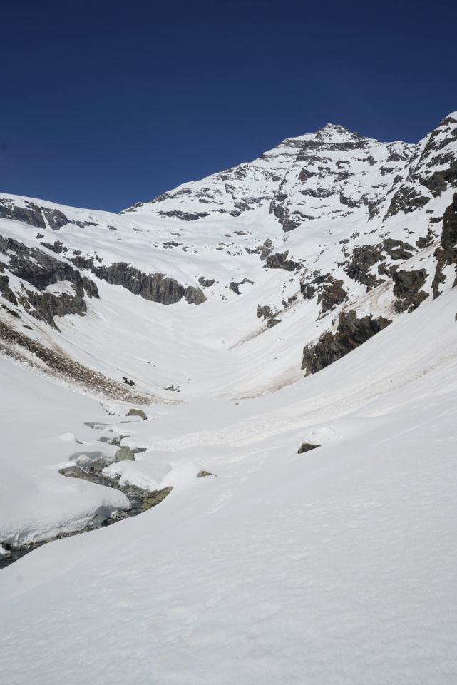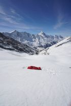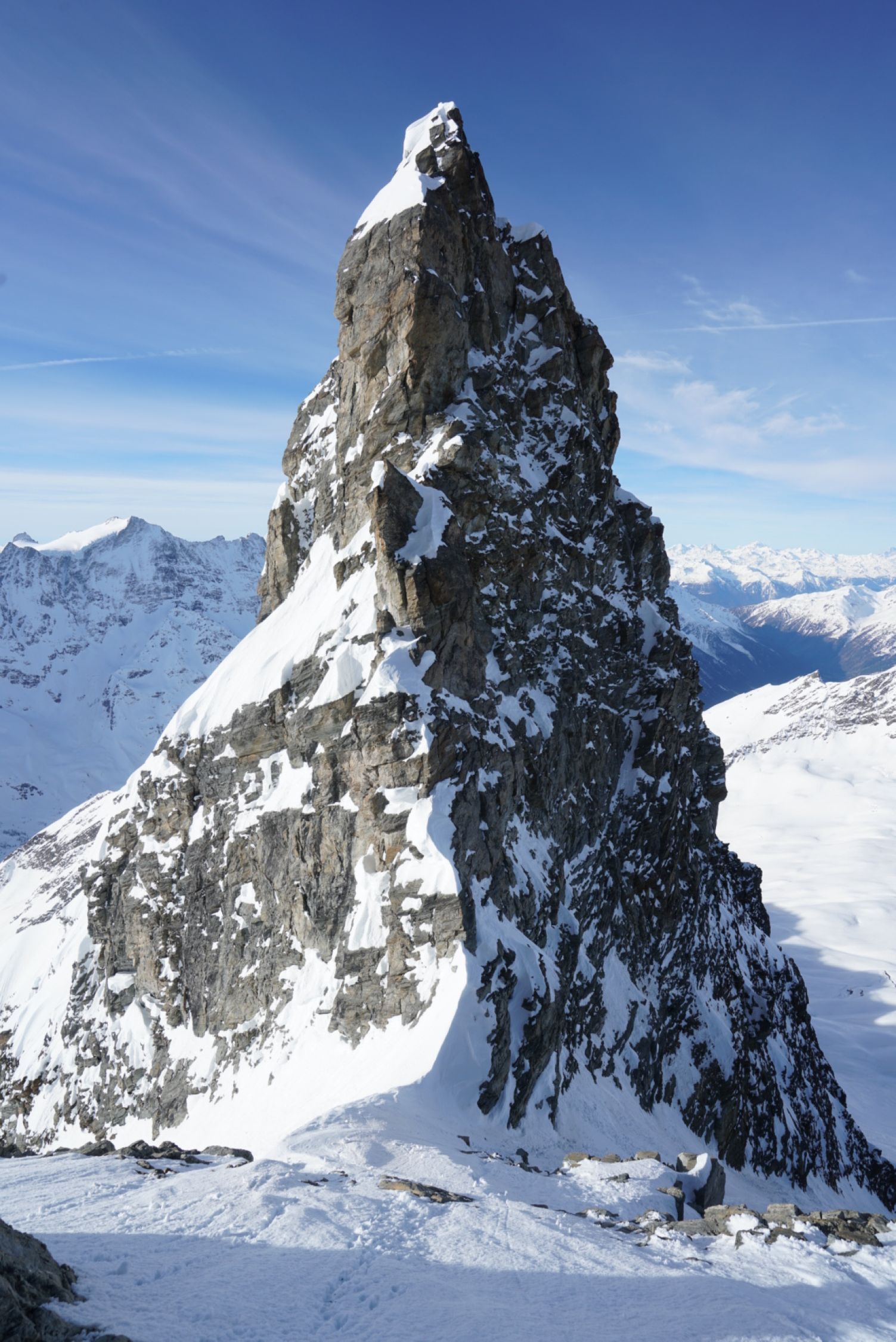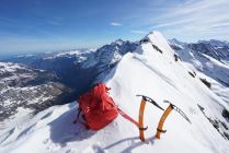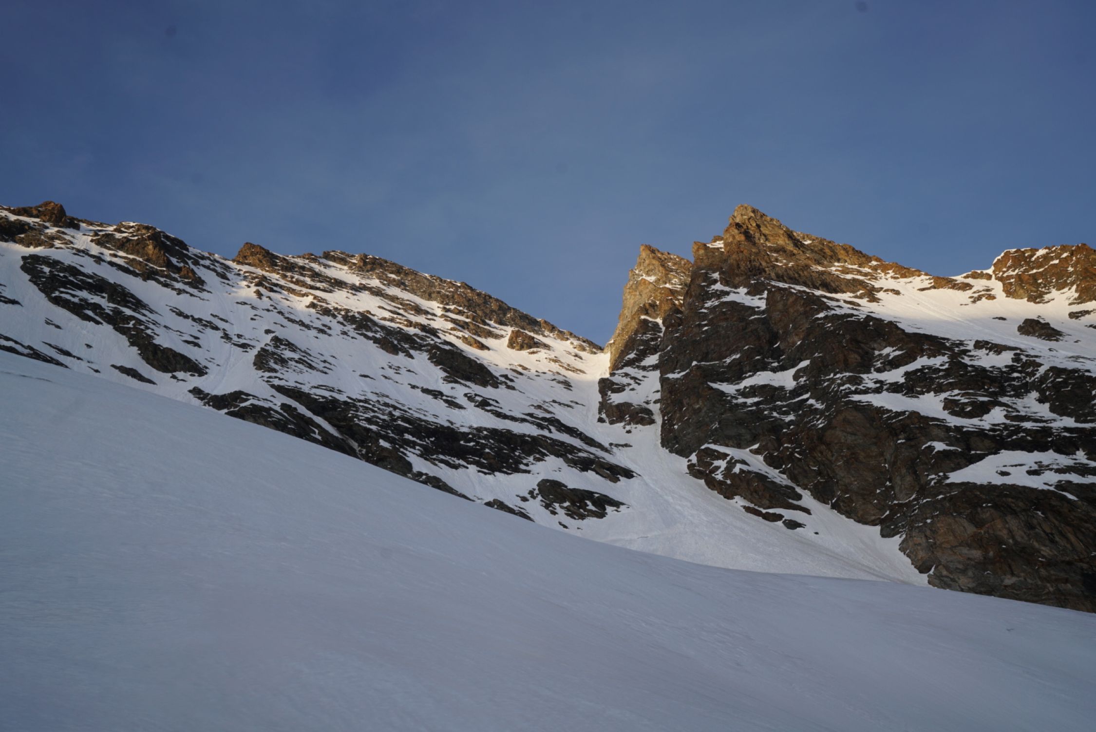 Heute Start gegen viertel nach sechs und ab etwa 3100 m Bootpack mit den Ski. Im Couloir sind schon Rutsche/Lawinen abgegangen, so dass der Weg rauf recht angenehm ist, man sinkt wenig ein. Bis in die Lücke bei etwa 3550 m geht es sehr gut. Dann auf etwa 3600 m ca. 15m etwas heikles, aber machbares Mixed-Gelände (III, etwas Eis). Hiervor habe ich die Ski deponiert. Darüber gut gangbare Schneeflanke bis zum Gipfelgrat. Ich bin oben zum Grat nach links (Westen) rausgequert und dann den Grat zum Gipfel (einmal II, ausgesetzt). Etwa um halb zehn am Gipfel. Wunderschöne Fernsicht von Gipfel.