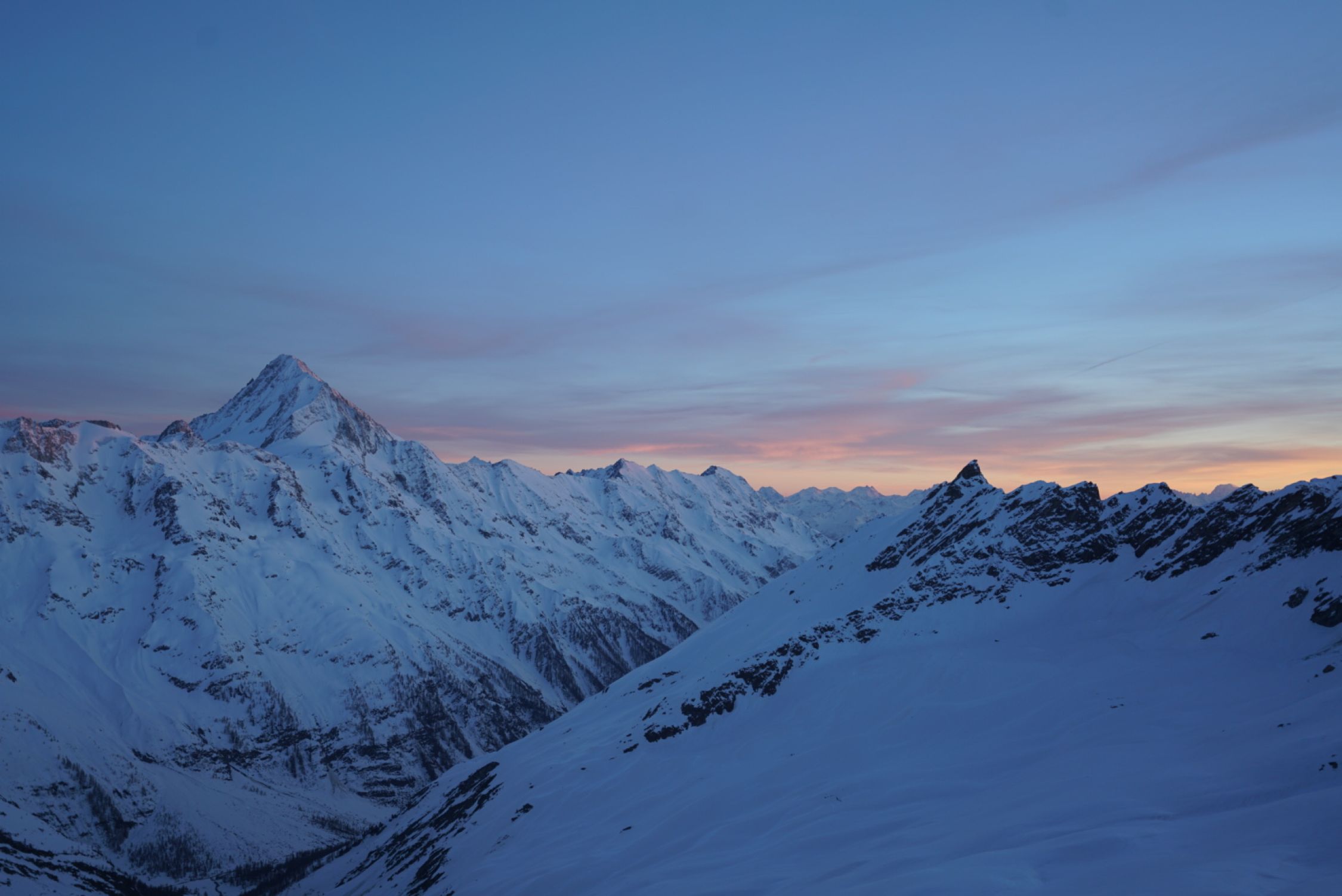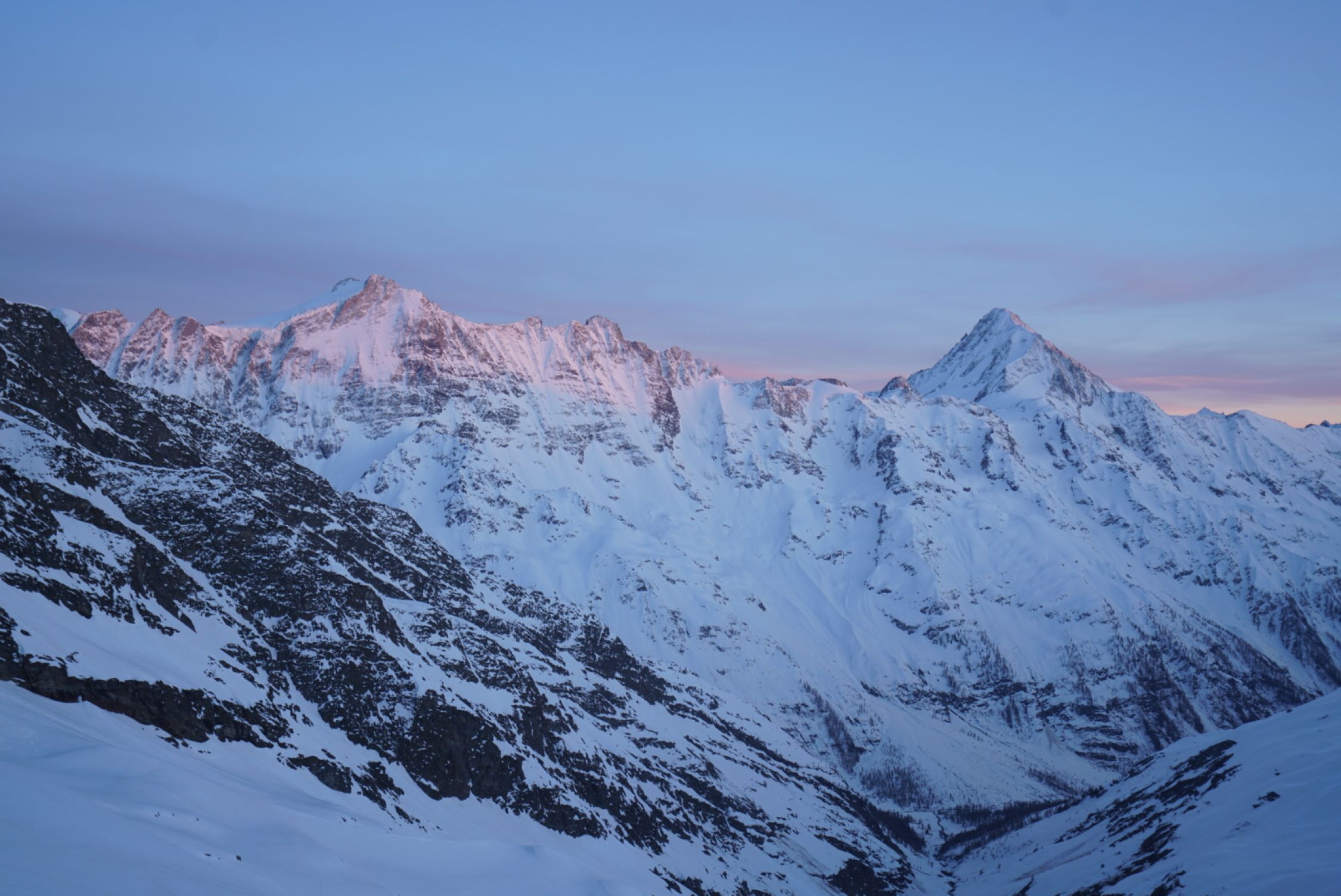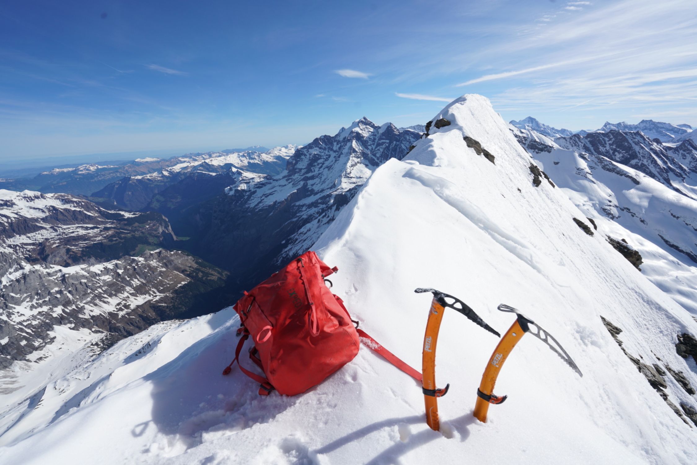 Heute Start gegen viertel nach sechs und ab etwa 3100 m Bootpack mit den Ski. Im Couloir sind schon Rutsche/Lawinen abgegangen, so dass der Weg rauf recht angenehm ist, man sinkt wenig ein. Bis in die Lücke bei etwa 3550 m geht es sehr gut. Dann auf etwa 3600 m ca. 15m etwas heikles, aber machbares Mixed-Gelände (III, etwas Eis). Hiervor habe ich die Ski deponiert. Darüber gut gangbare Schneeflanke bis zum Gipfelgrat. Ich bin oben zum Grat nach links (Westen) rausgequert und dann den Grat zum Gipfel (einmal II, ausgesetzt). Etwa um halb zehn am Gipfel. Wunderschöne Fernsicht von Gipfel.