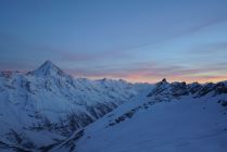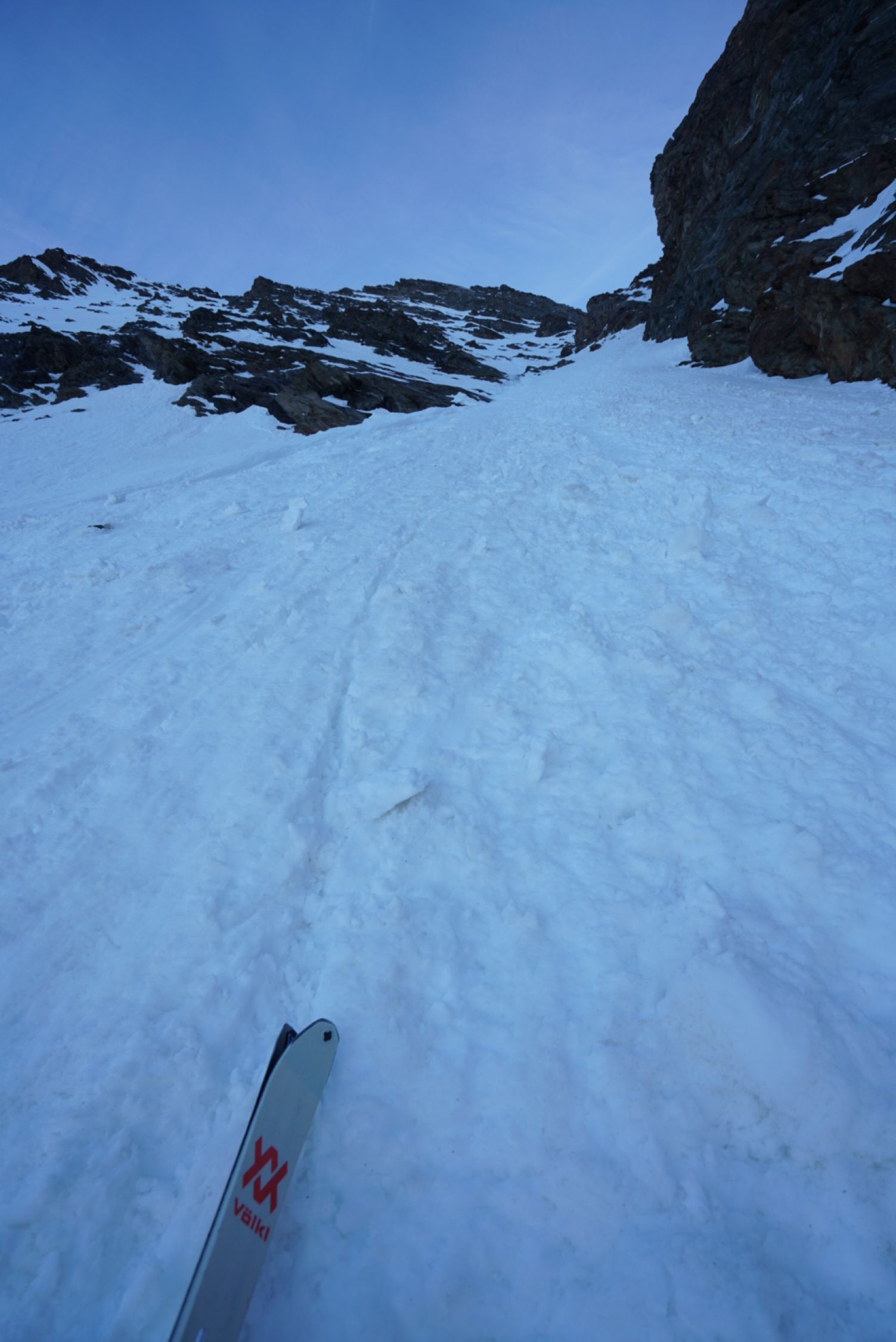 Abstieg wie Aufstieg. Ich bin das ganze SW-Couloir runtergelaufen, da es mir zu hart für eine Abfahrt erschien (war eigentlich geplant). Unten bin ich probeweise noch etwas gefahren, sehr ruppig und unangenehm. Man muss wohl später am Tag fahren, wenn es aufgefirnt hat. Auf der SE-Seite von der Lücke beim kleinen Breithron scheint ein spannendes Couloir zu sein, was fahrbar erschien und aufgefirnt hatte, allerdings waren meine Biwaksacken auf der falschen Seite. Nach dem Couloir dann feiner Sulz, ab 2600 m etwas schwer. Abfahrt bis Blatten.