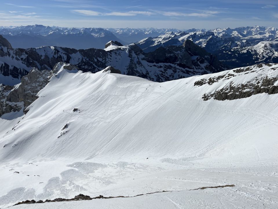 Abfahrt vom Chalberensäntis bei schönem Sulz. Unter der Wagenlücke sogar noch etwas pulvriges gefunden. Oberhalb Kanonenrohr an der Sonne nochmals schönsten Sulz. Im mittleren Couloir abgefahren, schon sehr weich. Unterhalb Mesmer dann Bremsschnee bis ca. 1300