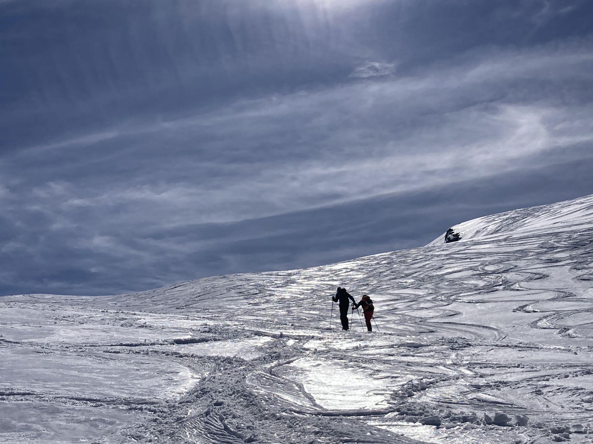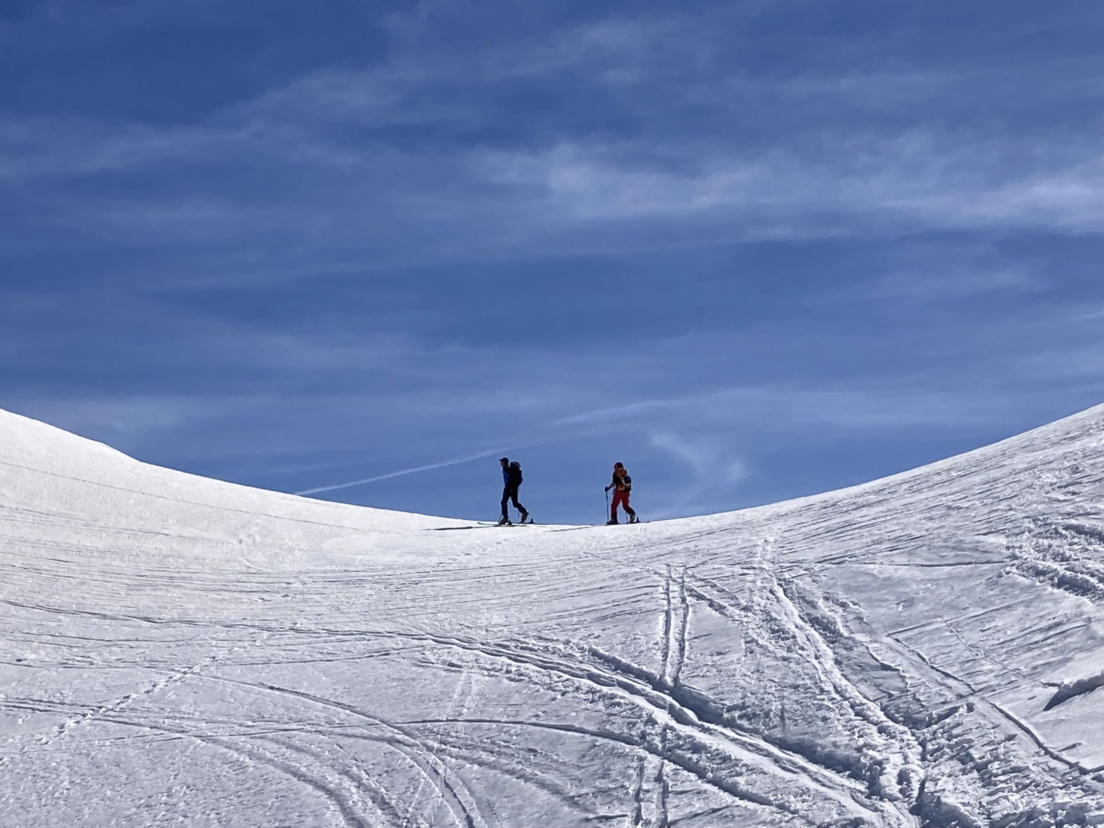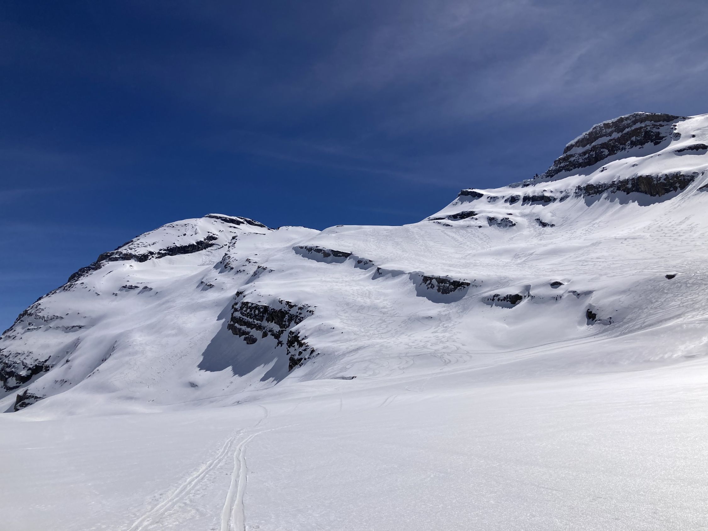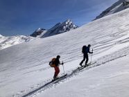 Gute Aufstiegsspur, am Morgen im Steilen noch etwas glasig (Harscheisen hilfreich). Im Schlussaufstieg vom Skidepot zum Gipfelkreuz guter Trittschnee. Abfahrt um 12.00 mit schönem Sulzschnee.