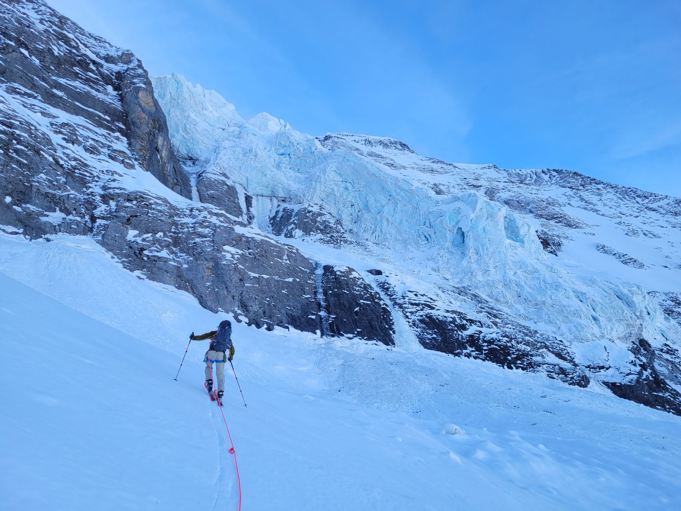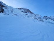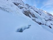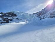 Die Abfahrt über die Aufstiegsroute ist mit zunehmender Sonneneinstrahlung und der offensichtlichen Gefahr von Eis/Steinschlag nur bedingt zu empfehlen.