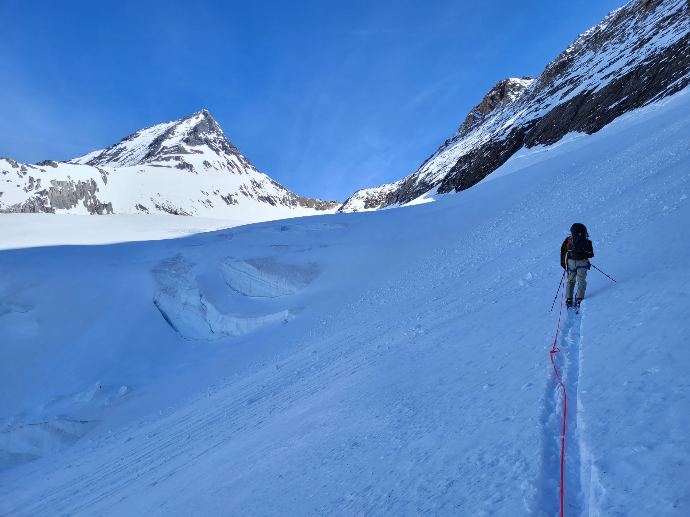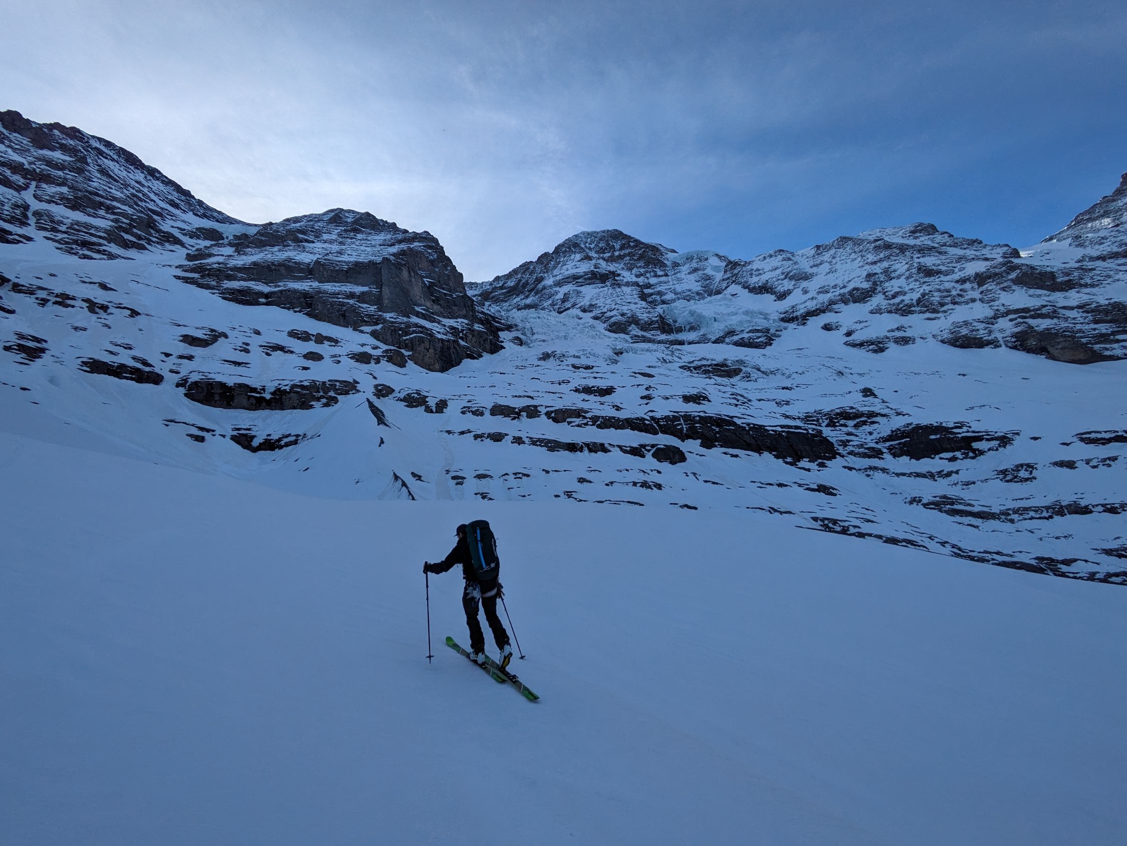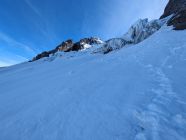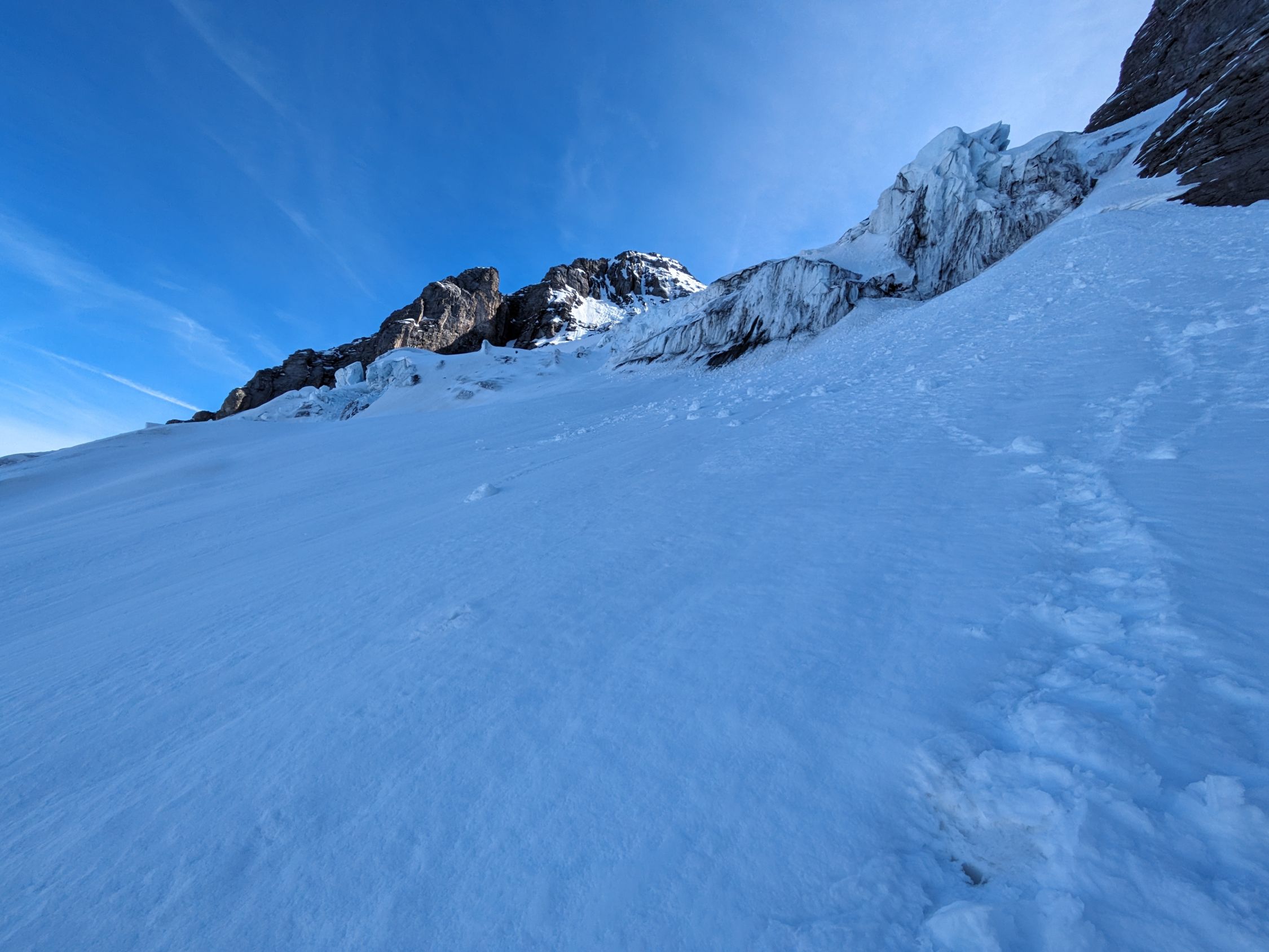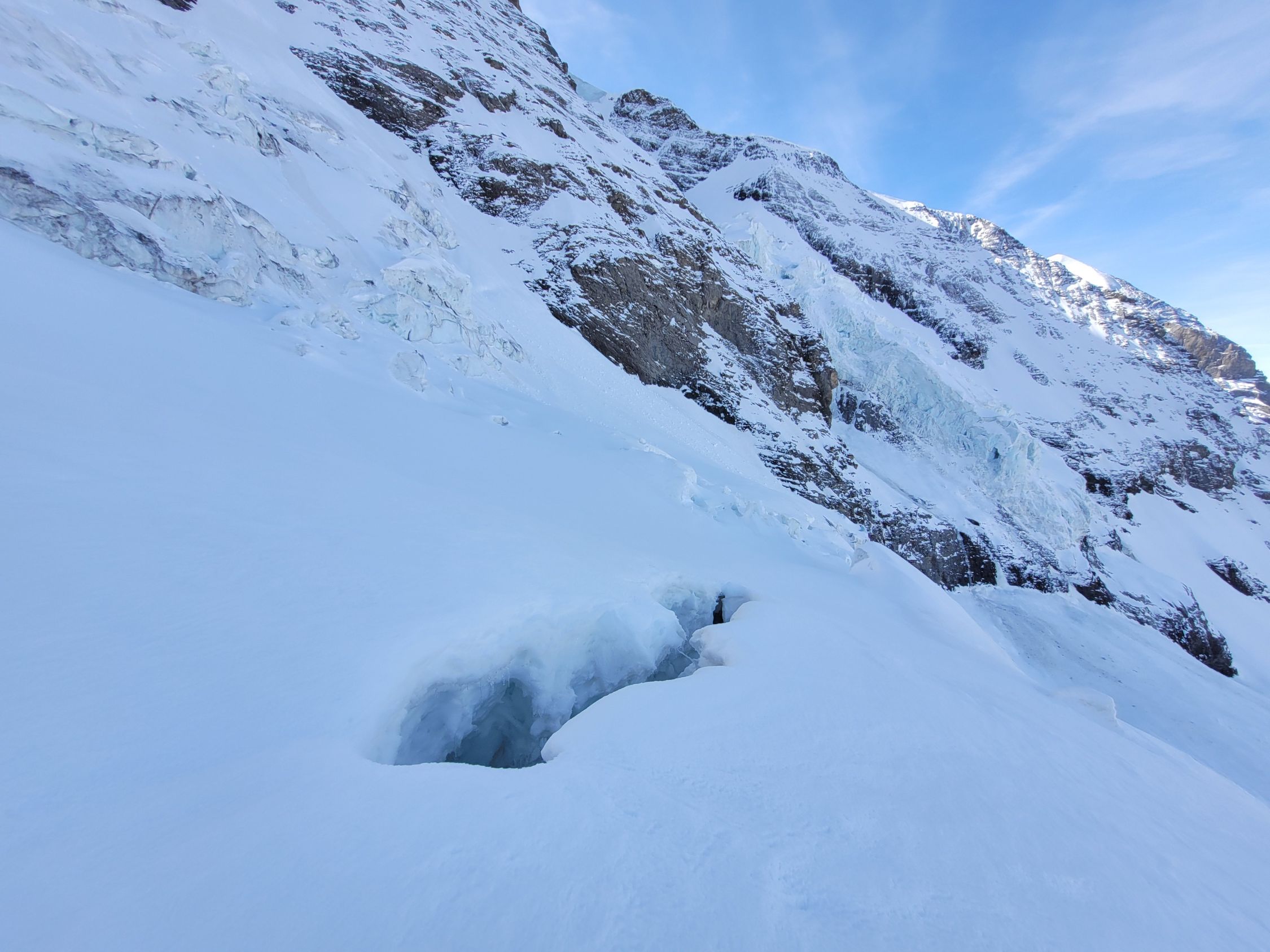 In den teils steilen, hart gefrorenen Aufschwüngen des Eigergletschers sind je nach persönlichem empfinden Steigeisen hilfreich.