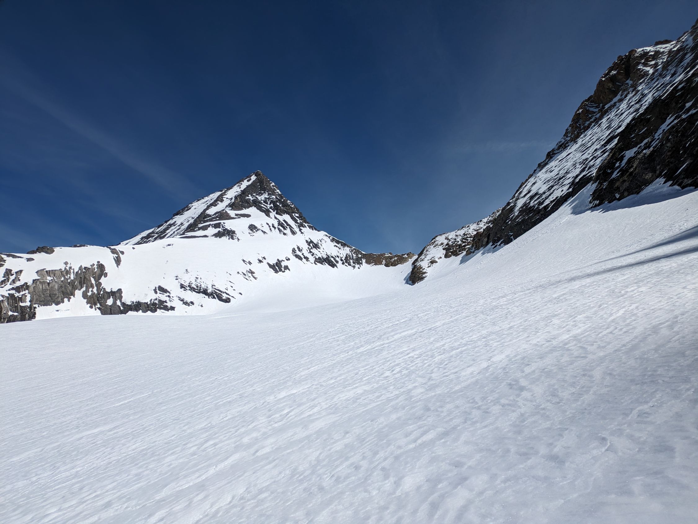 Wir konnten den Aufstieg bis 20hm unter das Joch durchgehend mit Ski und wo nötig Harscheisen bewältigen.