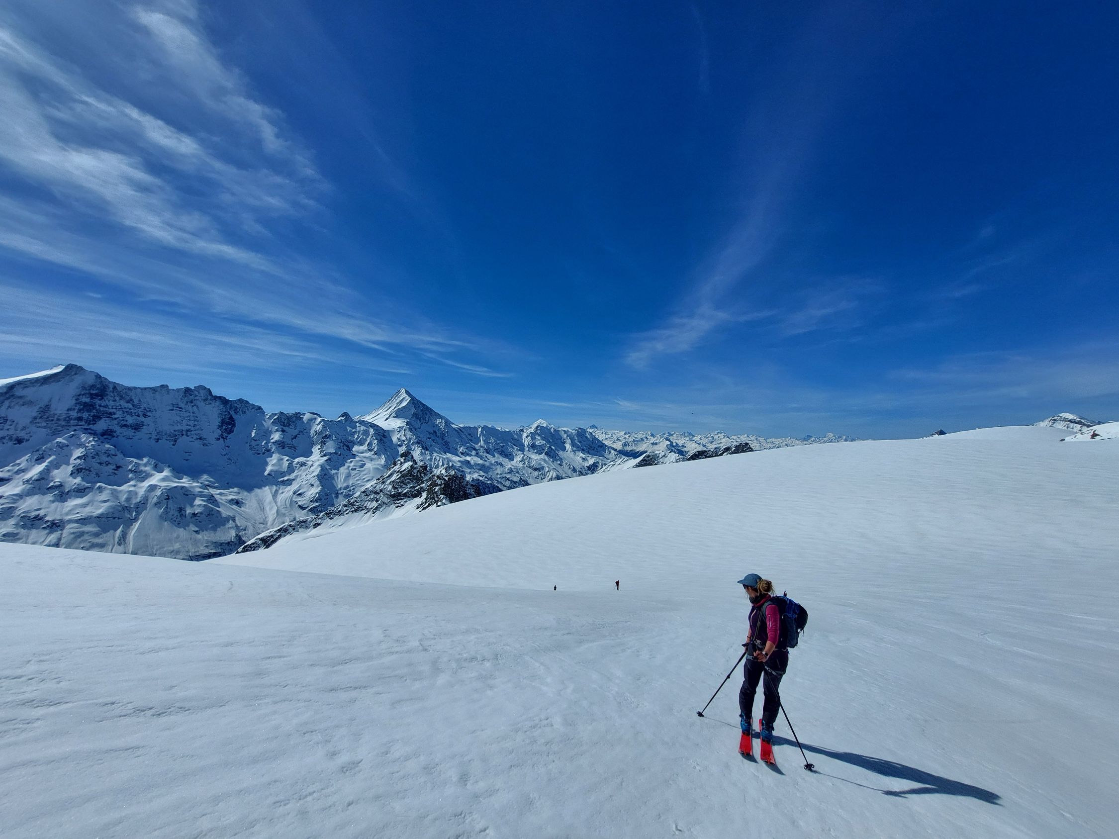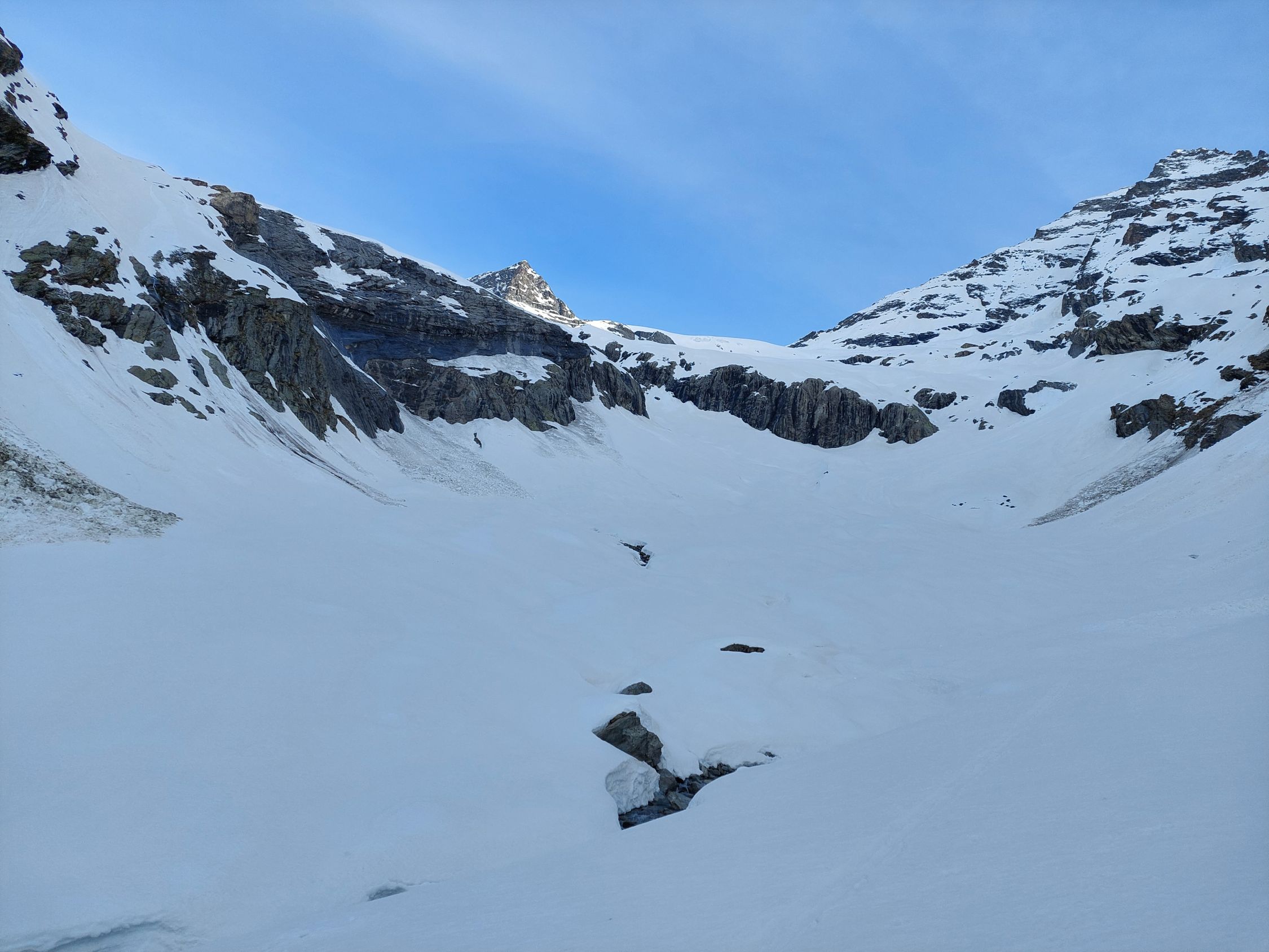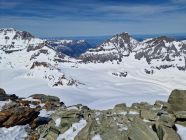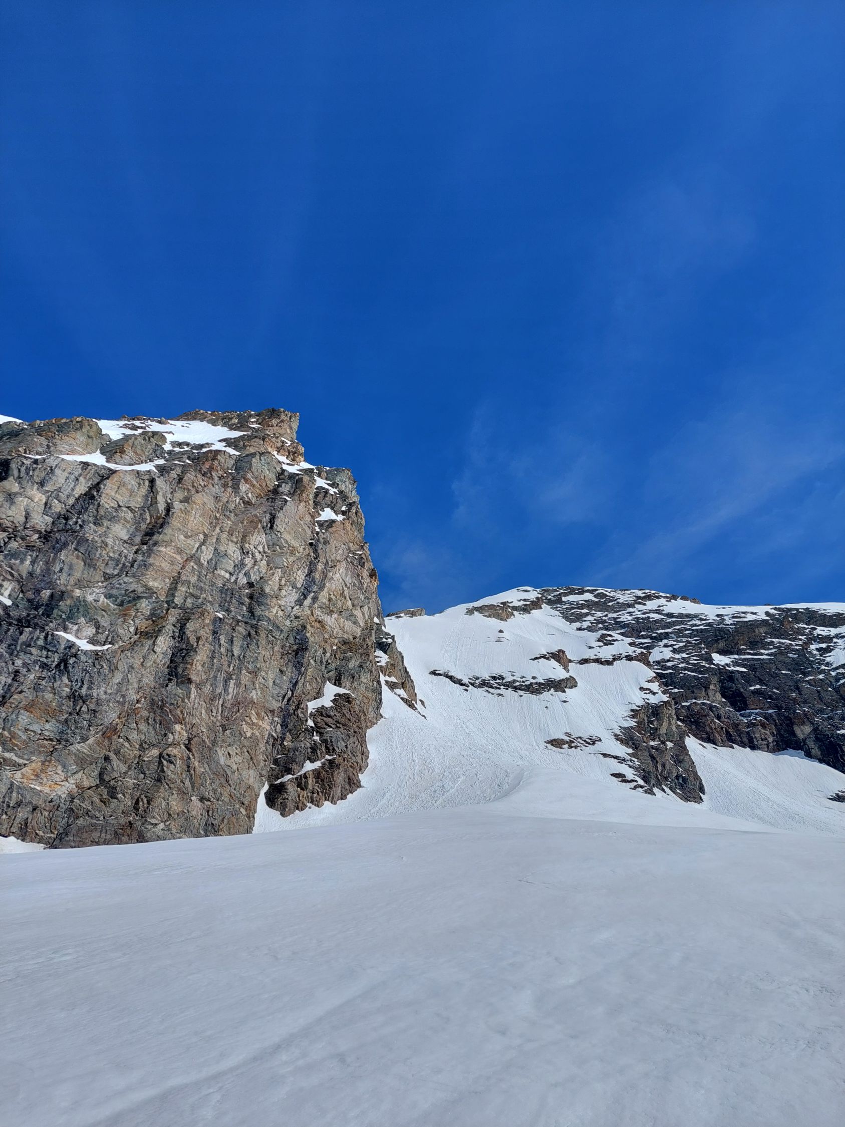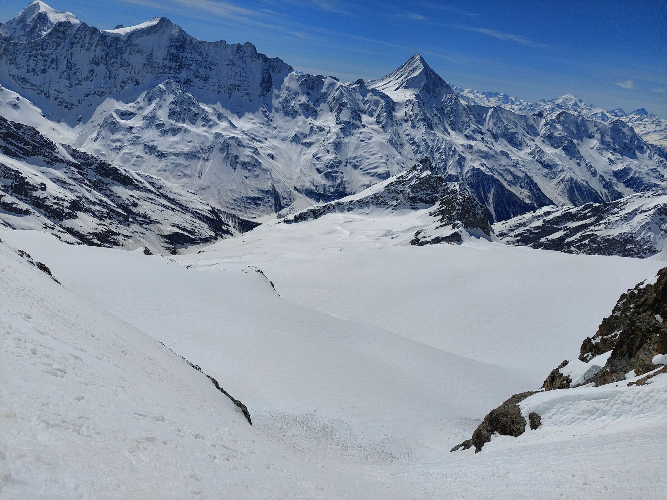 Aufstieg: Von Blatten Richtung Fafleralp, dann durch das Inners Tal hoch zum Talgletscher und zum Tschingelhorn Skidepot. Bis auf eine Höhe von 2400m ü. M. hatte es vielfach Bruchharsch. Danach war der Schnee im Schatten hart und weiter oben in den besonnten Bereichen sulzig. Ab Skidepot hatte es Nassschnee, den man ohne Steigeisen begehen konnte. Da wir etwas spät im Aufstieg waren, kehrten wir in der Scharte zwischen Gross- und Klein-Tschingelhorn auf der Höhe von 3440m ü. M. um.