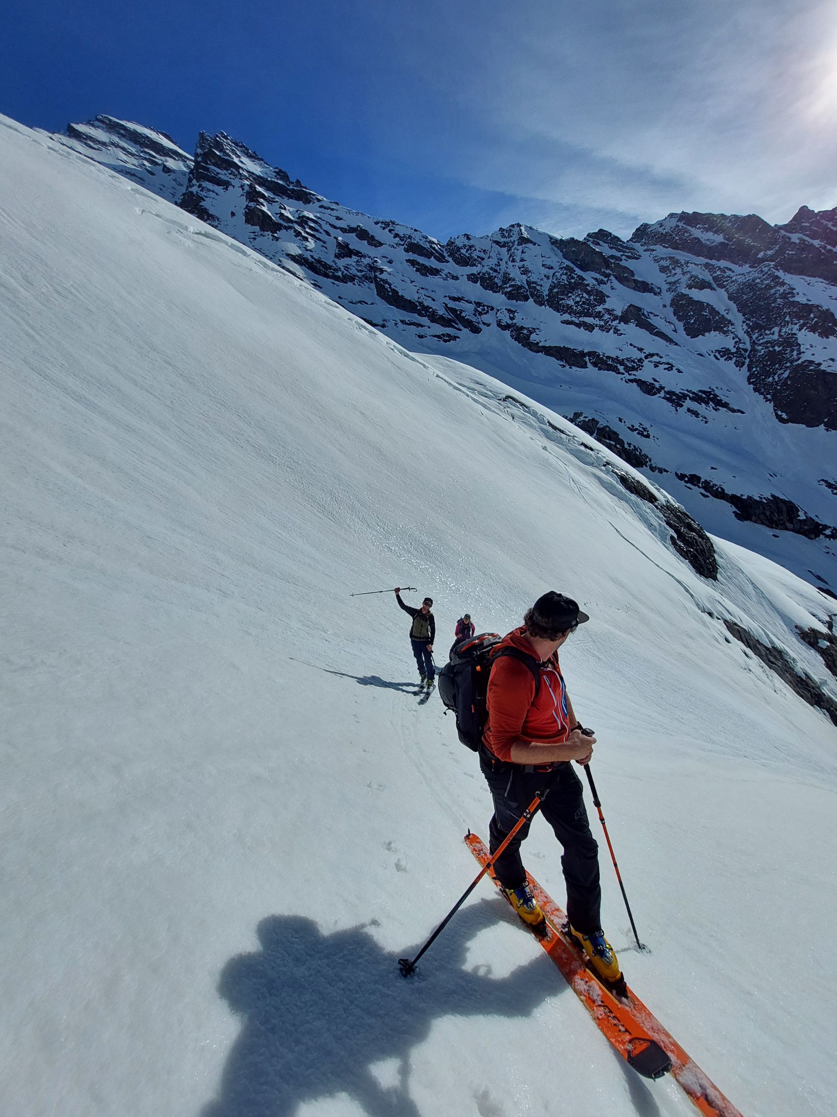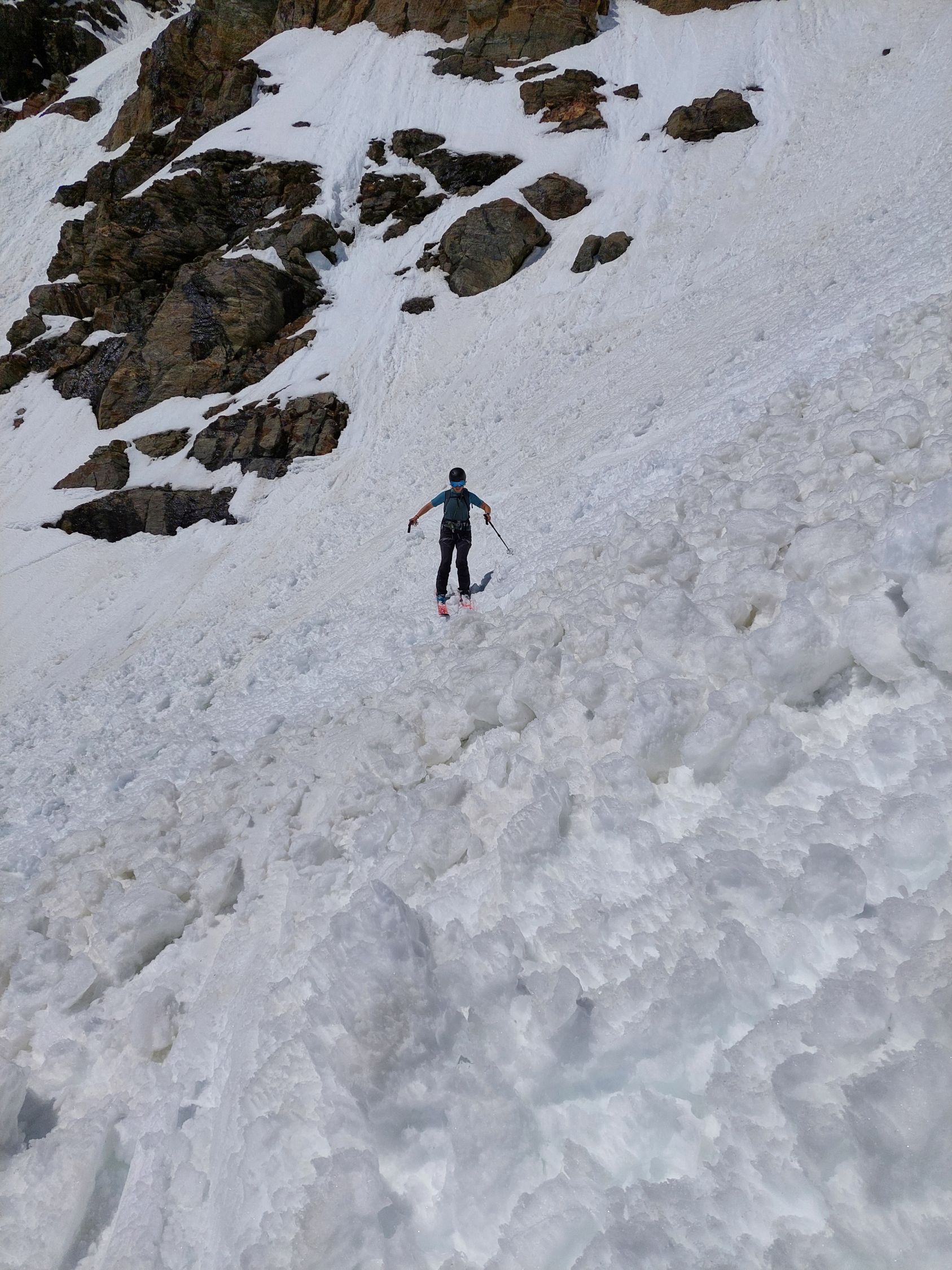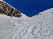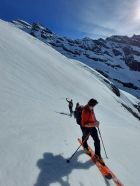Abfahrt: Ca. 13.00 Uhr. Bis auf eine Höhe von 2800m ü. M. hatte es Nassschnee, der aber noch gut zu fahren war. Im steilen Couloir hatte es nur noch Nassschnee mit kleinen Lawinen durchsetzt. Dies war dann kein Genuss mehr zum Runterfahren.