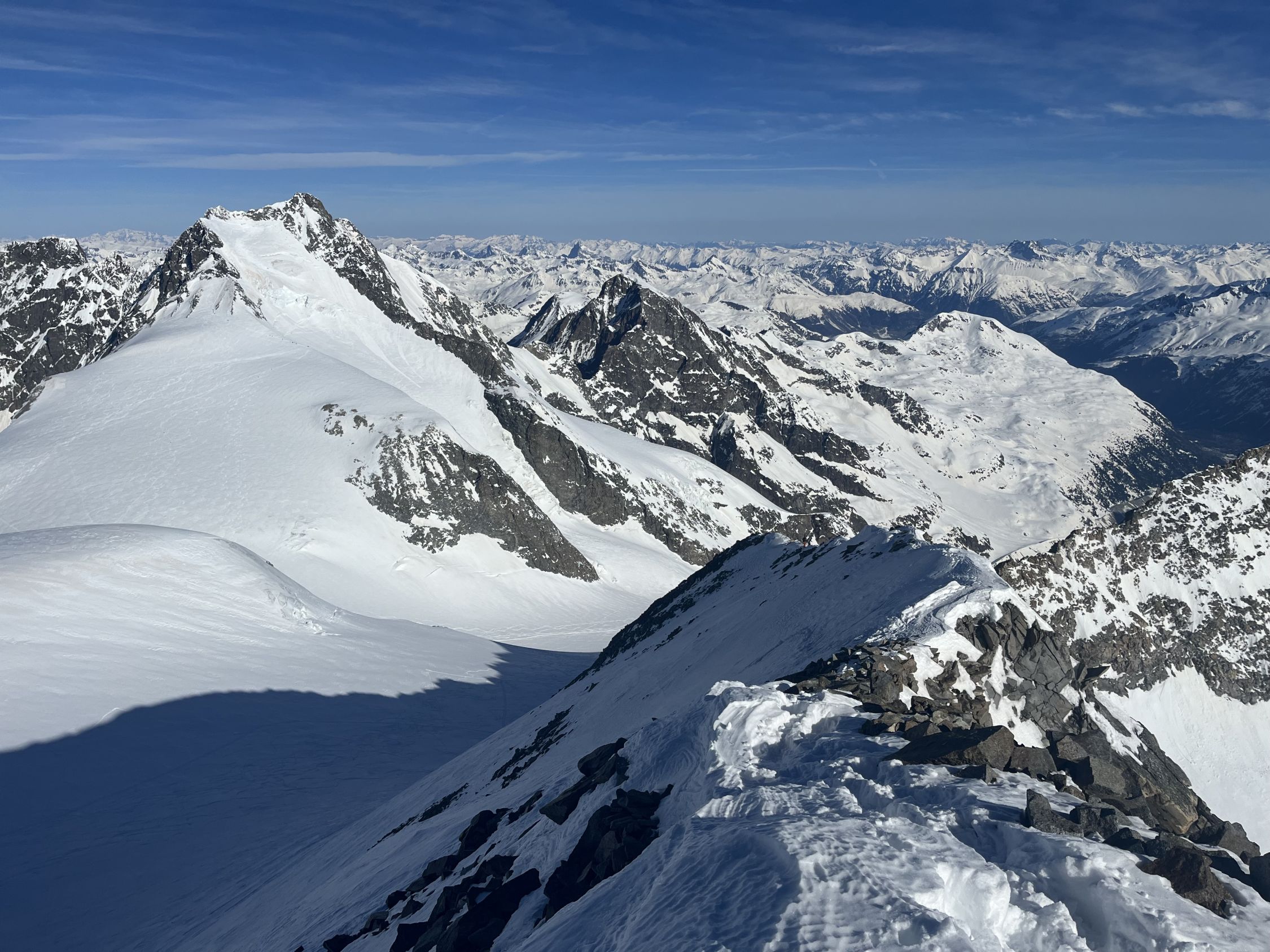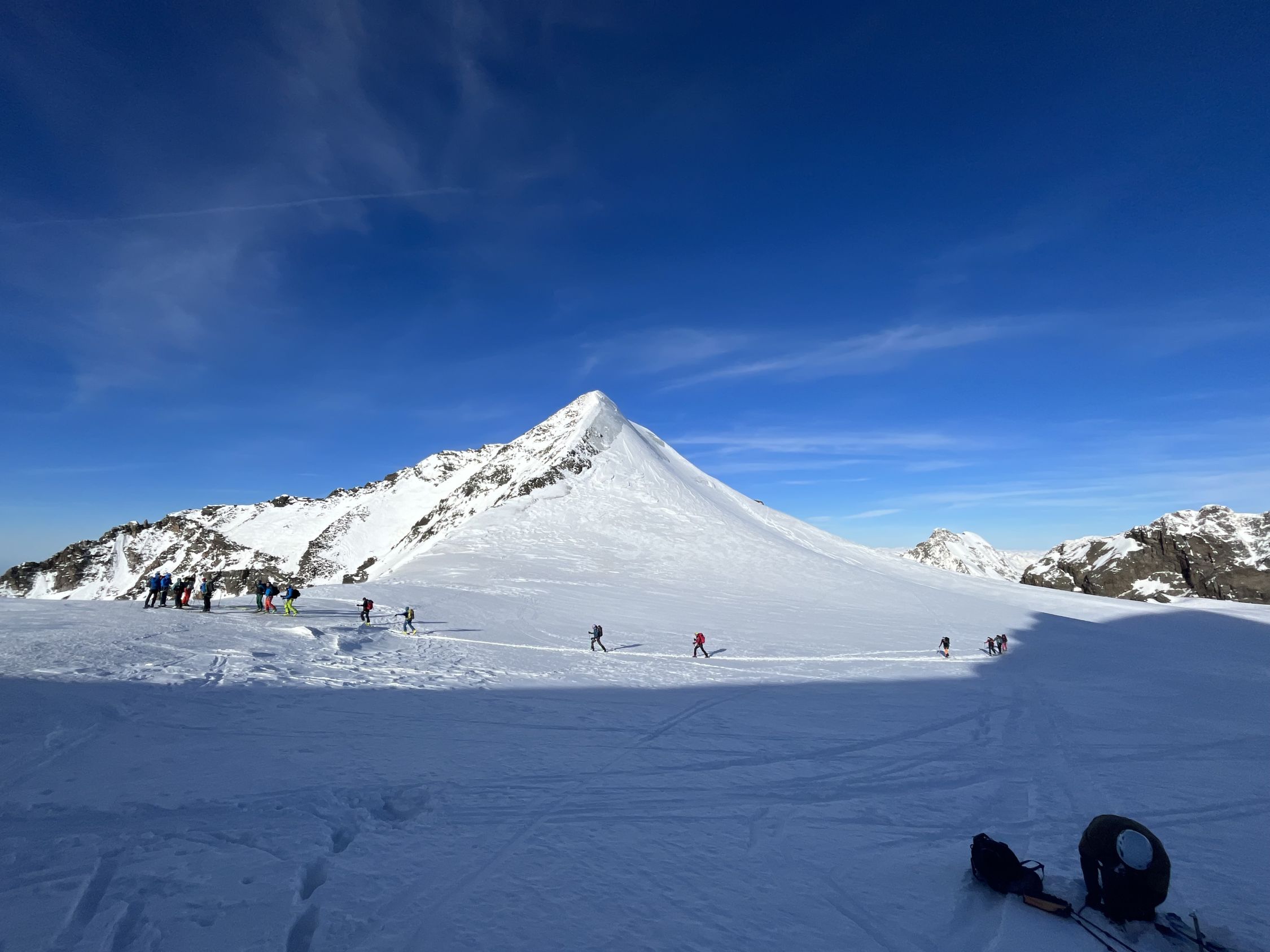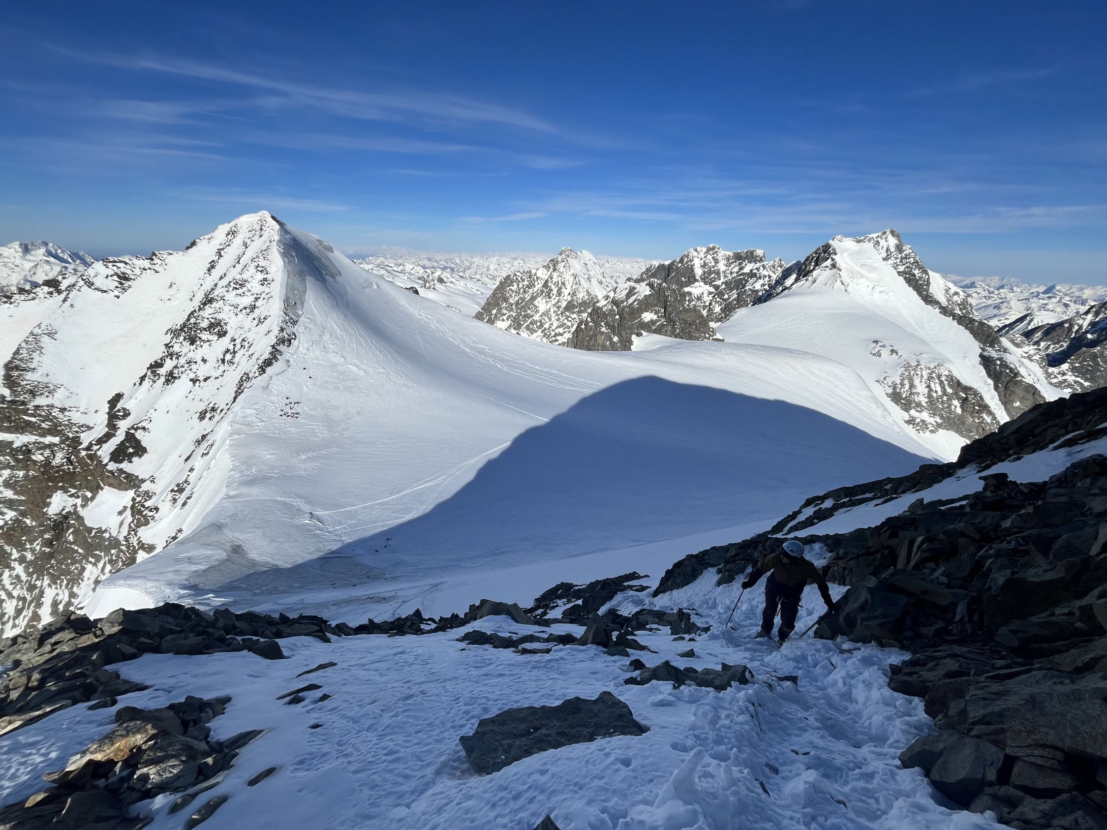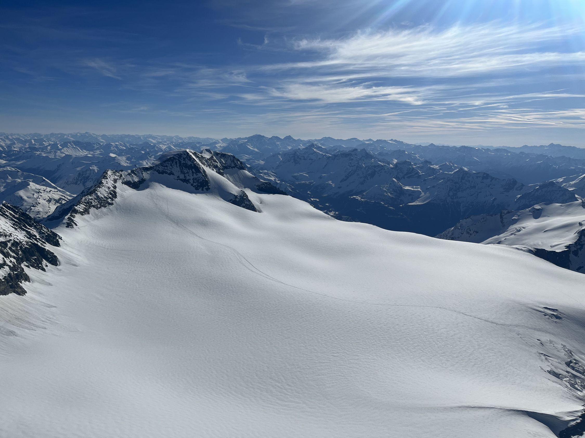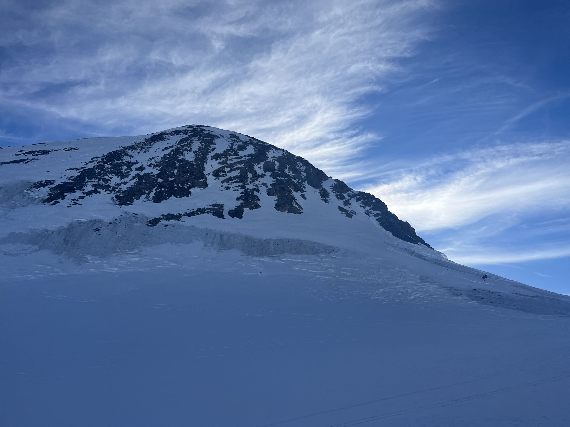 Start um 7:15 von der Marco e Rosa Hütte. Etwas windig, aber sonst bestes Wetter. Auf gute Spur über den gut eingeschneiten Gletscher rauf zur Fuorcla dal Zupo, dort Skidepot. Achtung auf Randspalte. Untere Tritte 20hm langsam eisig, sonst guter Trittschnee, am Grat Felsen Frei , um 9:00 allein am Gipfel, raif wie runter. Gestern ist jemand auch direkt abgefahren, ist wohl eisiger wie es aussieht.