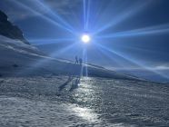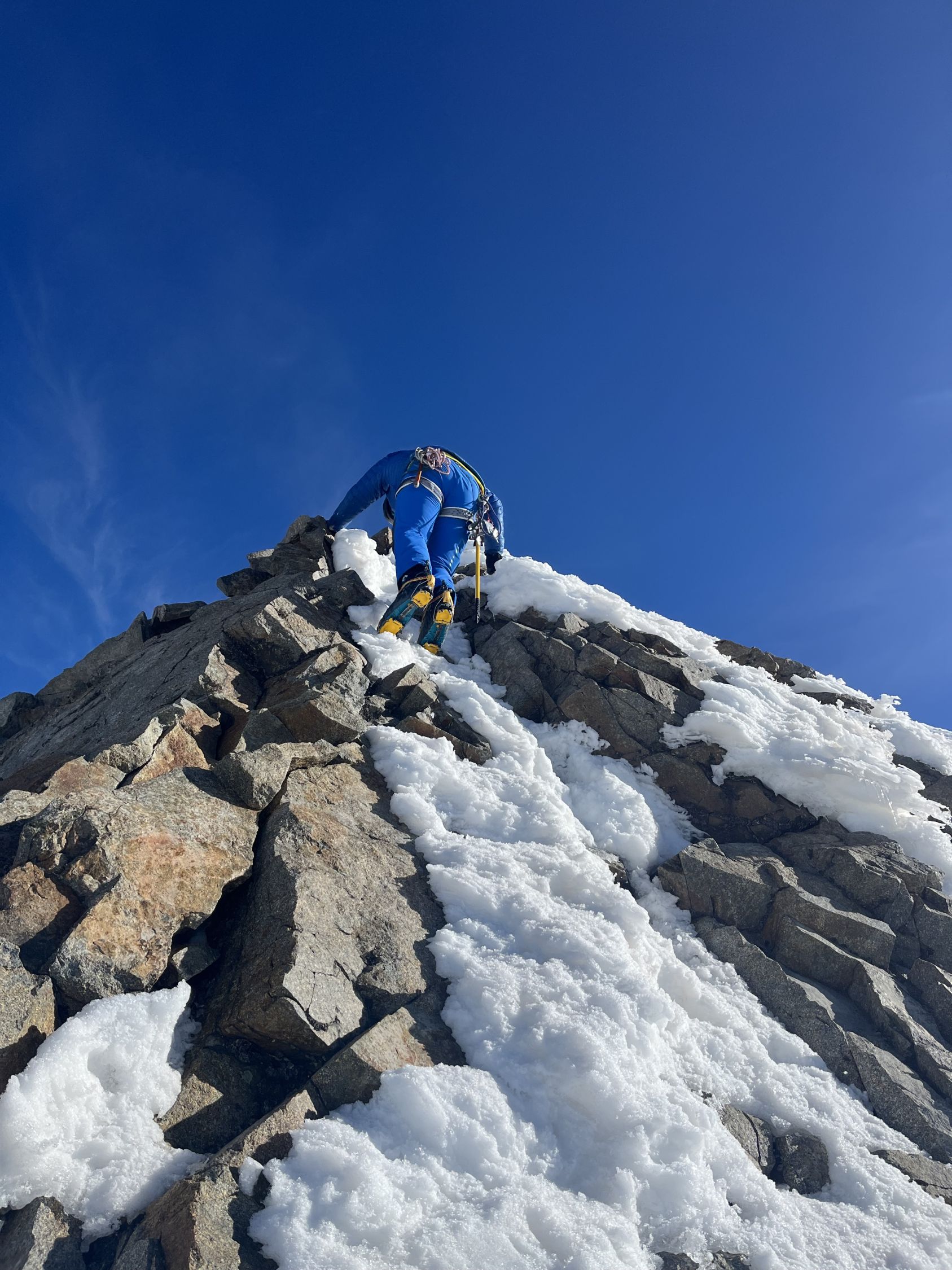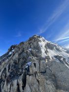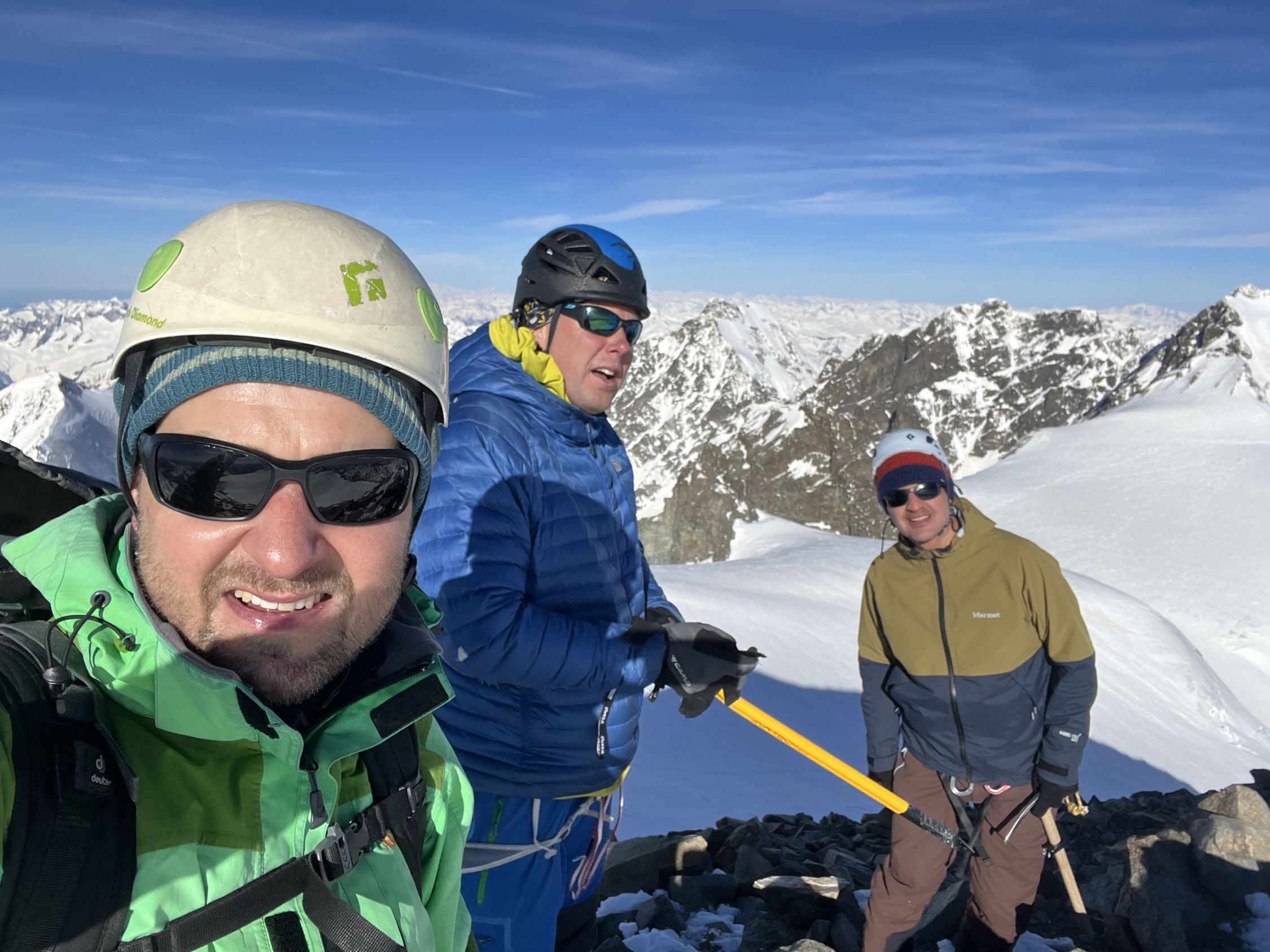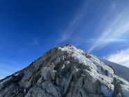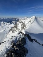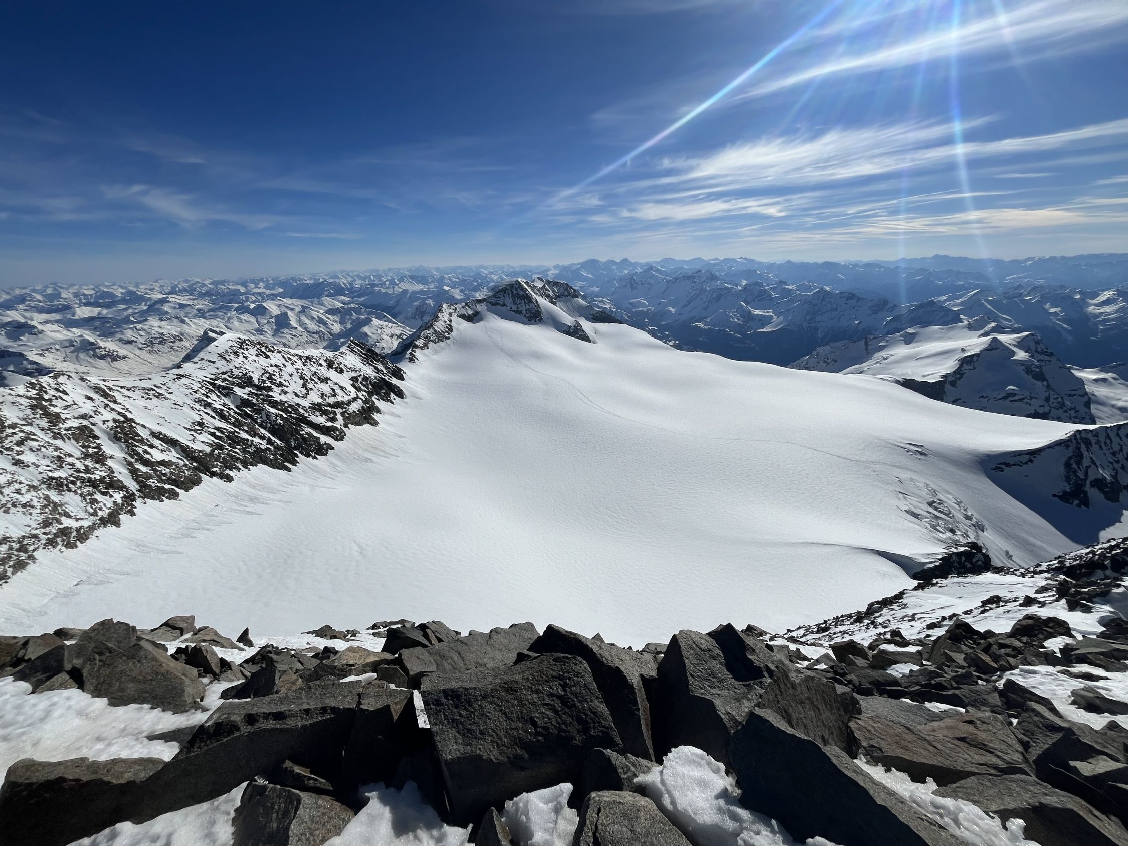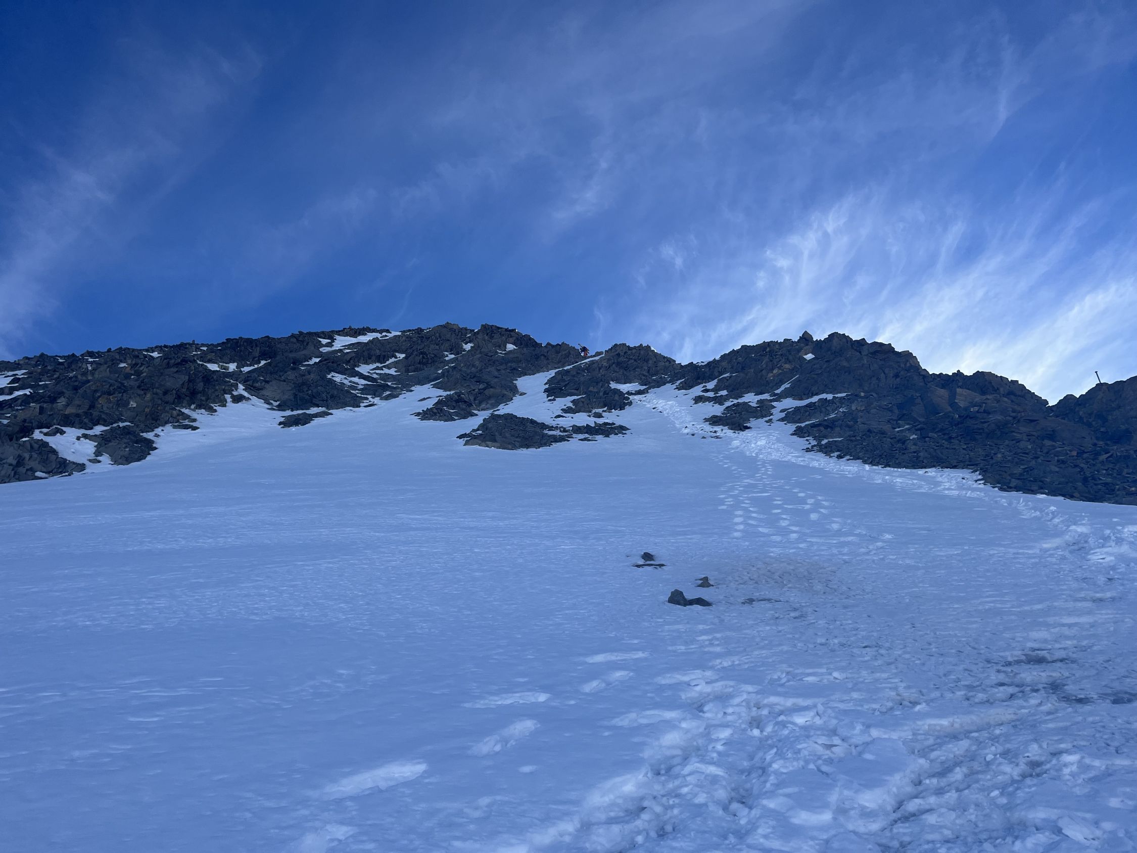 Start um 7:15 von der Marco e Rosa Hütte. Etwas windig, aber sonst bestes Wetter. Auf gute Spur über den gut eingeschneiten Gletscher rauf zur Fuorcla dal Zupo, dort Skidepot. Achtung auf Randspalte. Untere Tritte 20hm langsam eisig, sonst guter Trittschnee, am Grat Felsen Frei , um 9:00 allein am Gipfel, raif wie runter. Gestern ist jemand auch direkt abgefahren, ist wohl eisiger wie es aussieht.