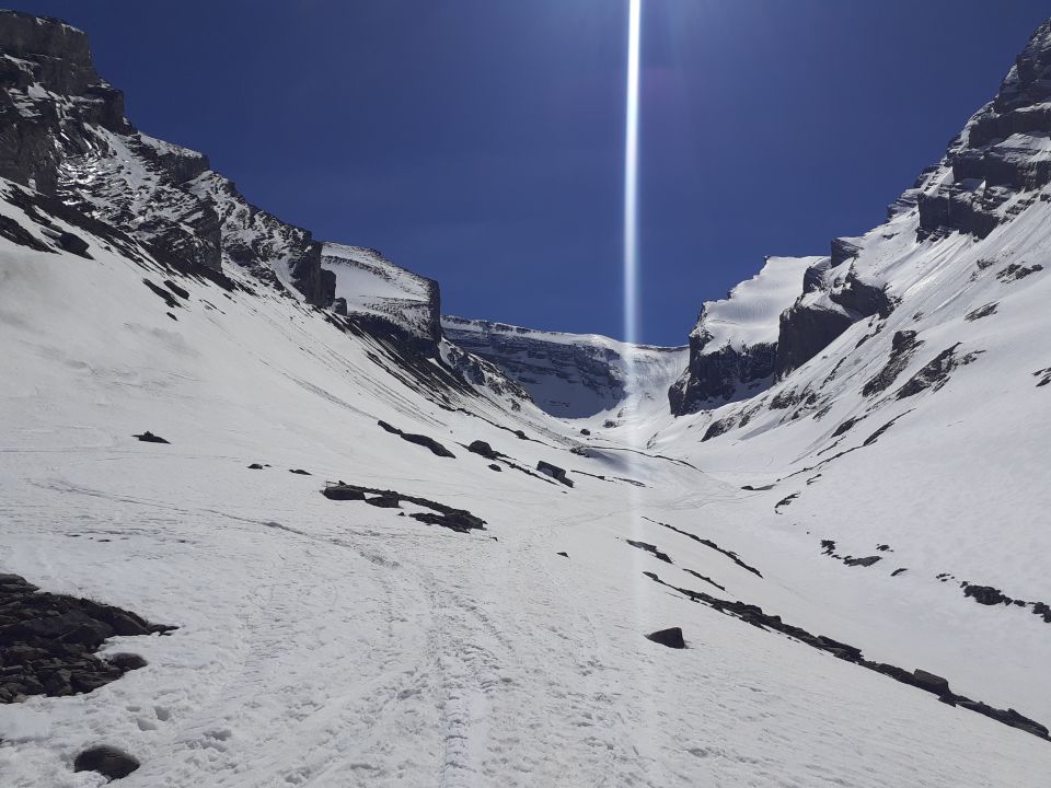 Durch die klare Nacht war der Schnee morgens hart gefroren (Harscheisen von Vorteil). Ab Mittag waren vom Rinderhorn und Altels nasse Rutsche zu beobachten.